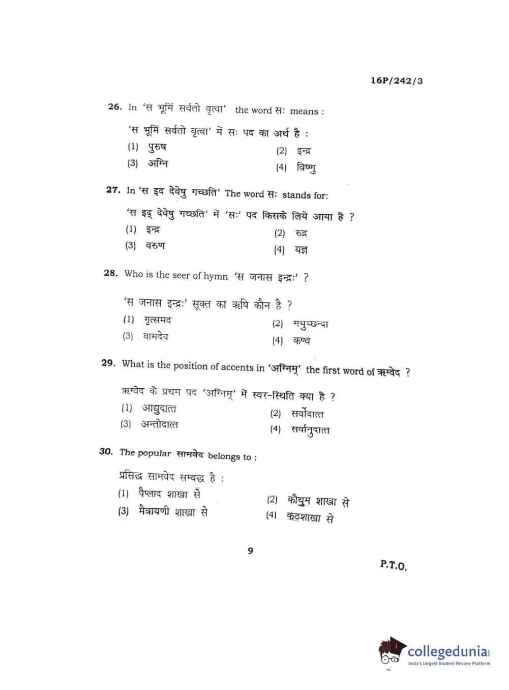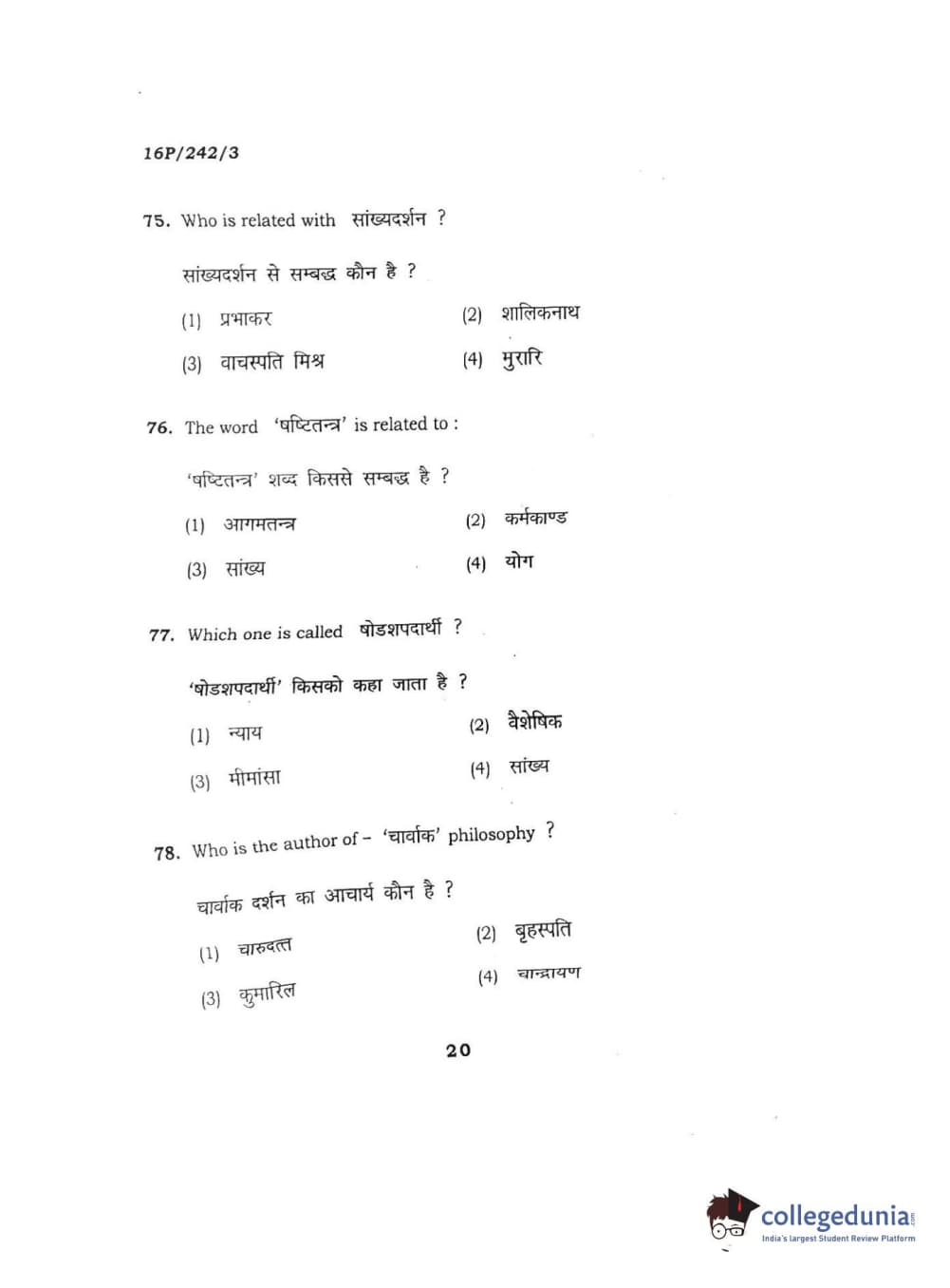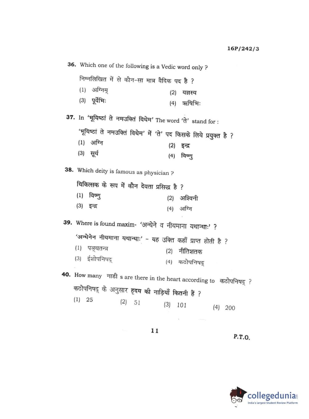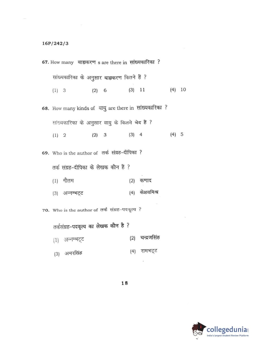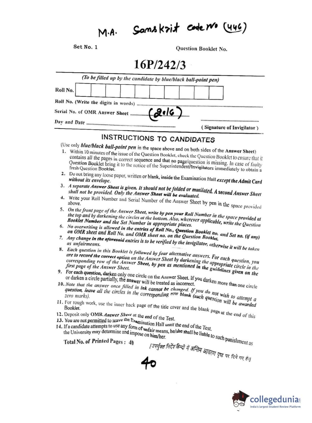 BHU PET 2016 M.A. SANSKRIT Question Paper with Answer Key PDFs