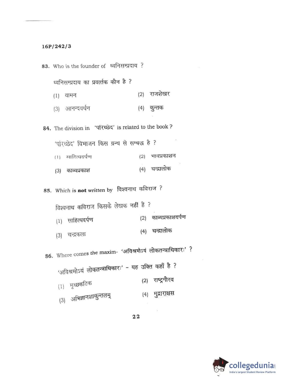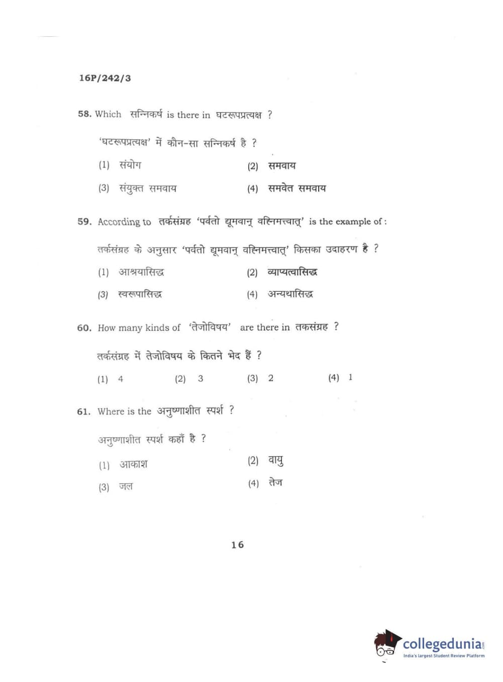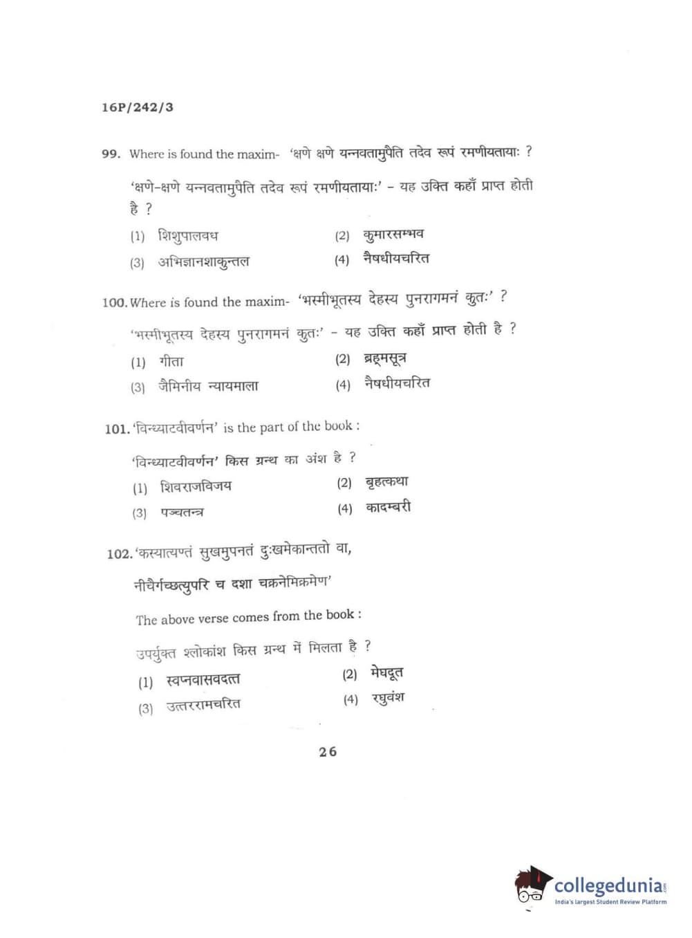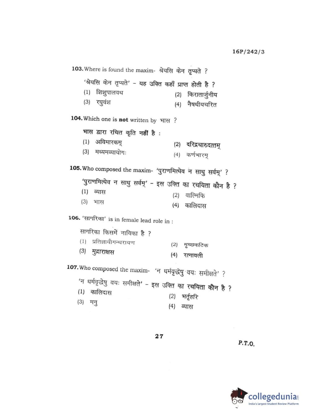 BHU PET 2016 M.A. SANSKRIT Question Paper with Answer Key PDFs