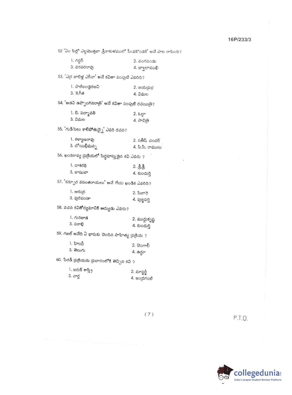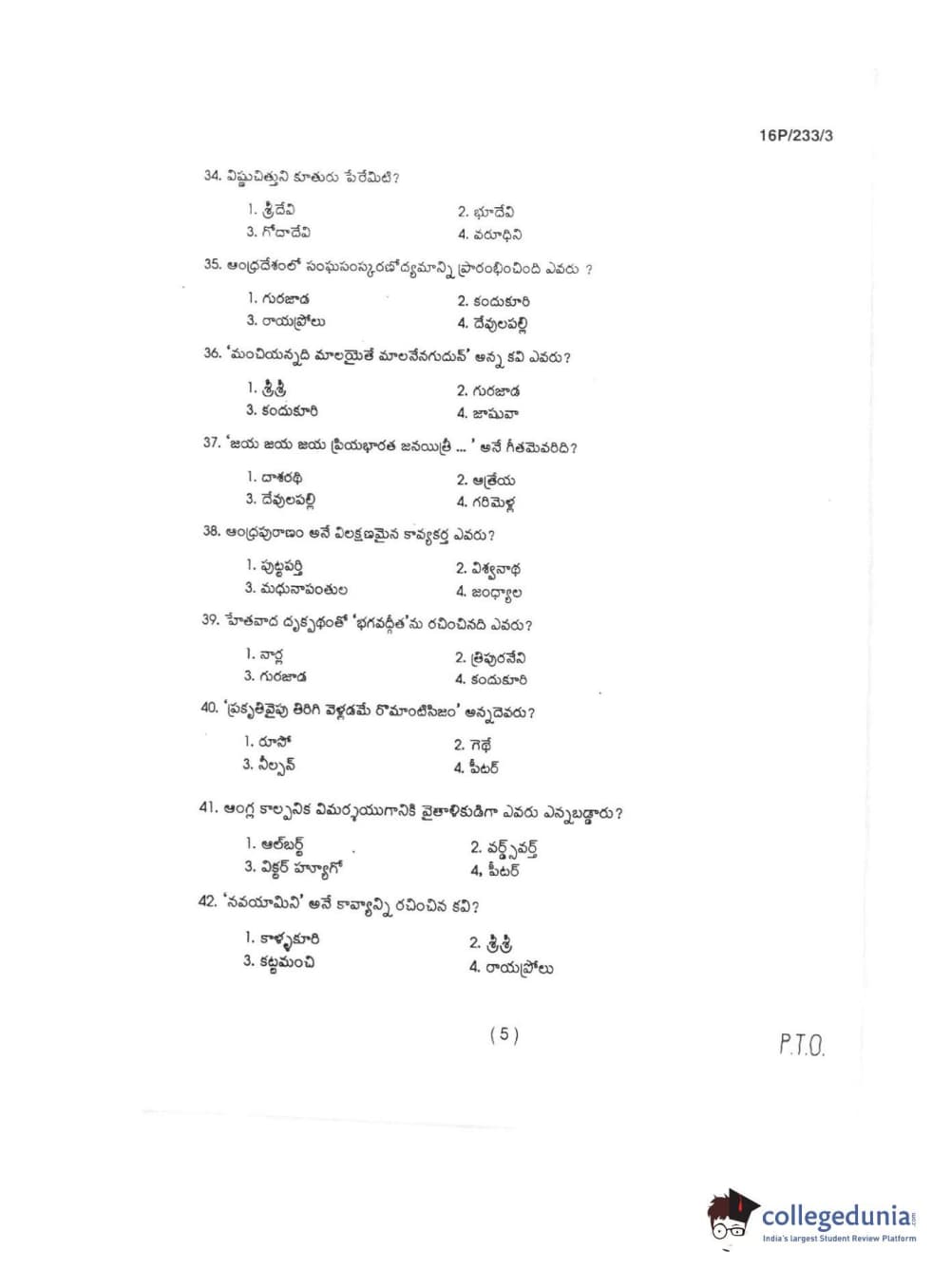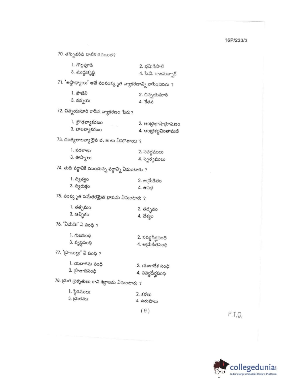BHU PET 2016 M.A TELUGU Question Paper with Answer Key PDFs in Telugu