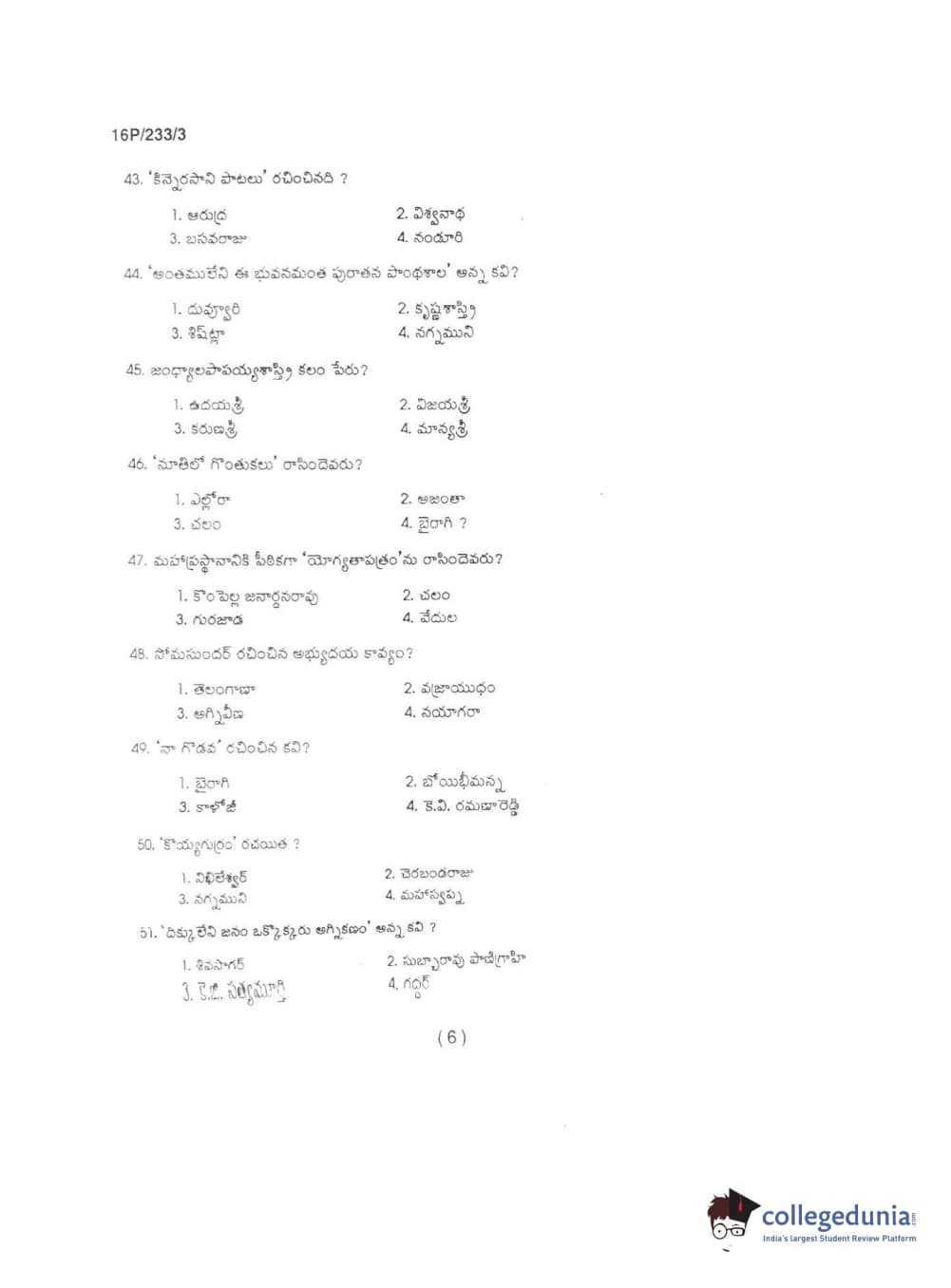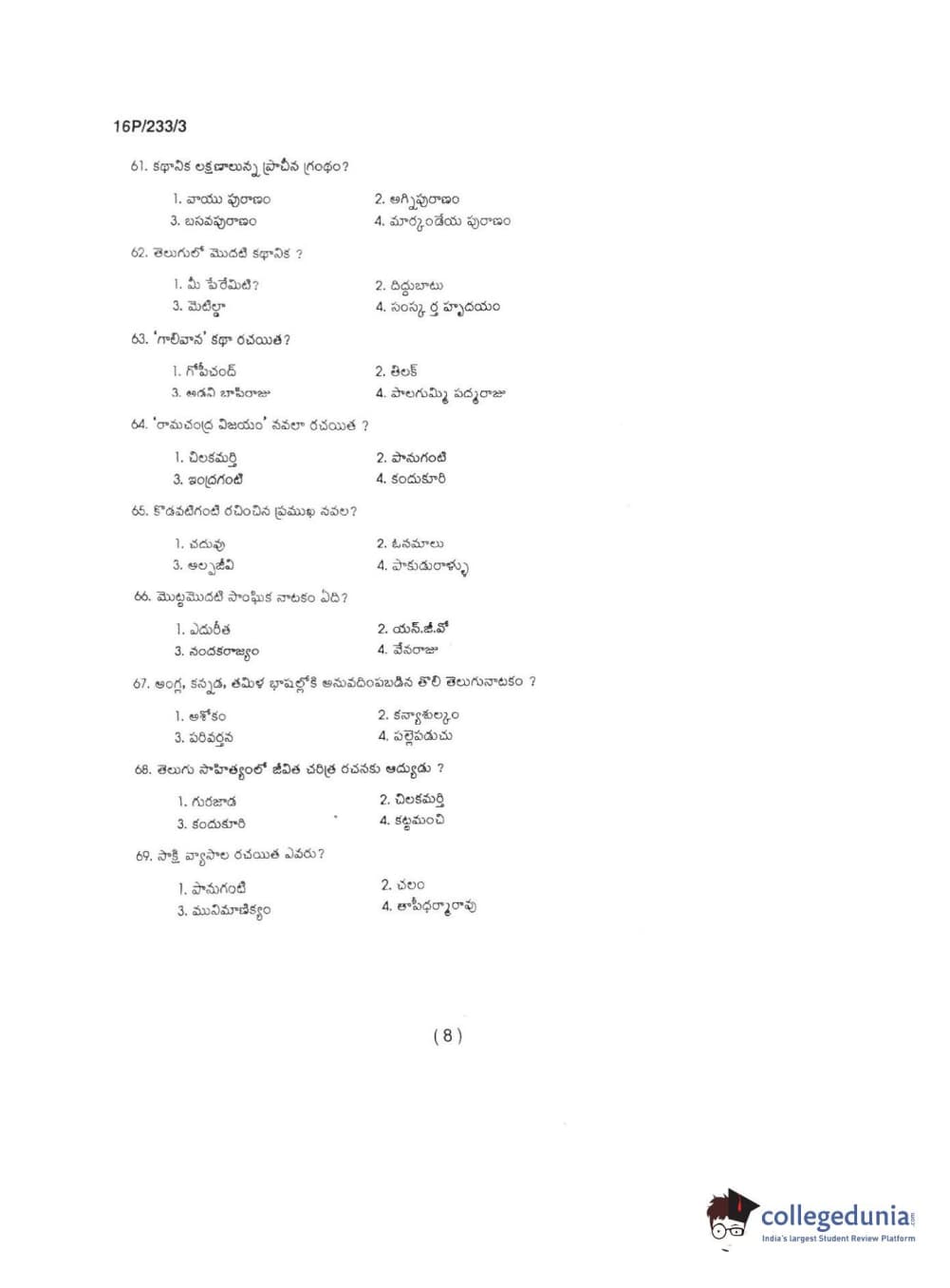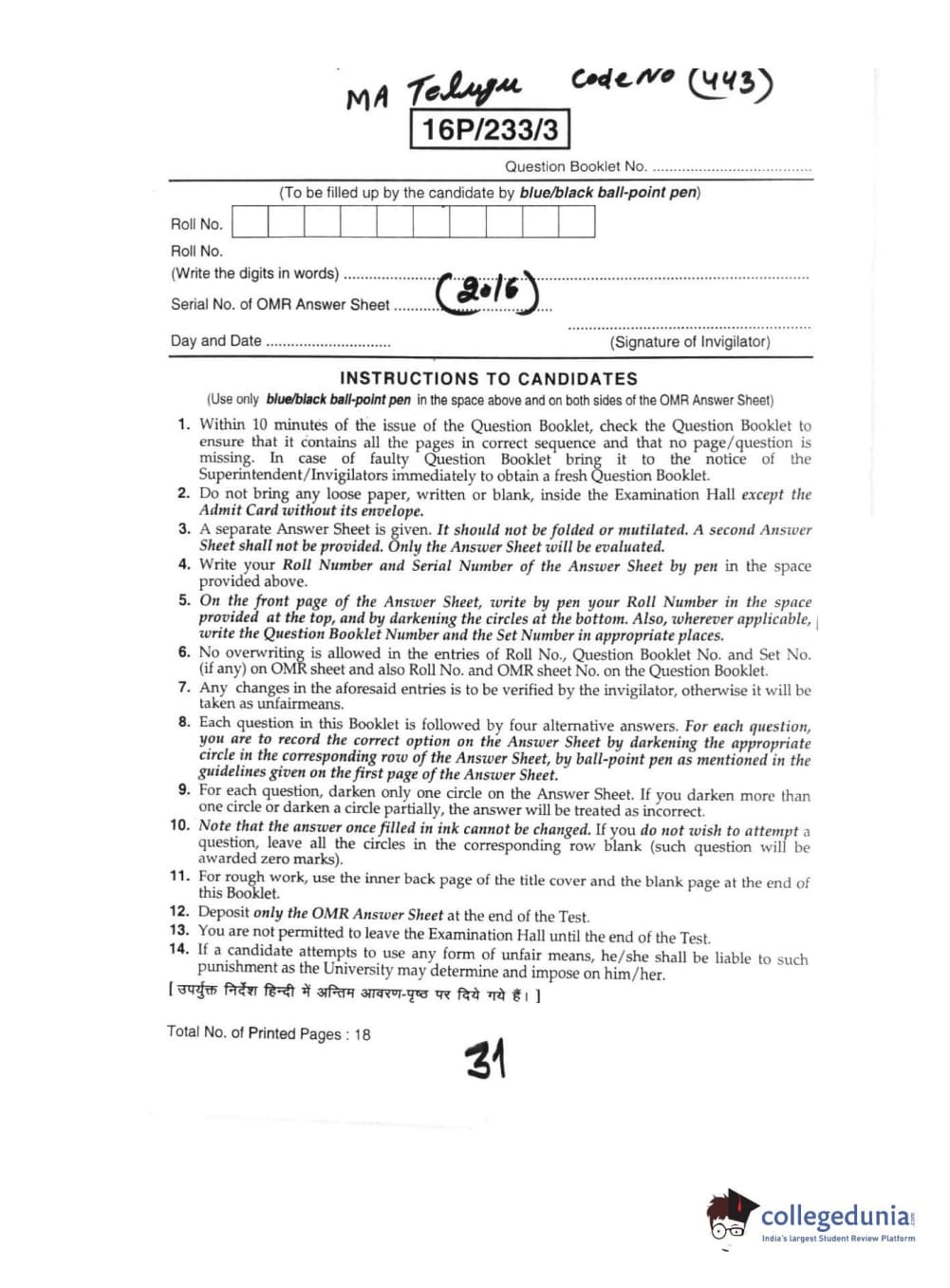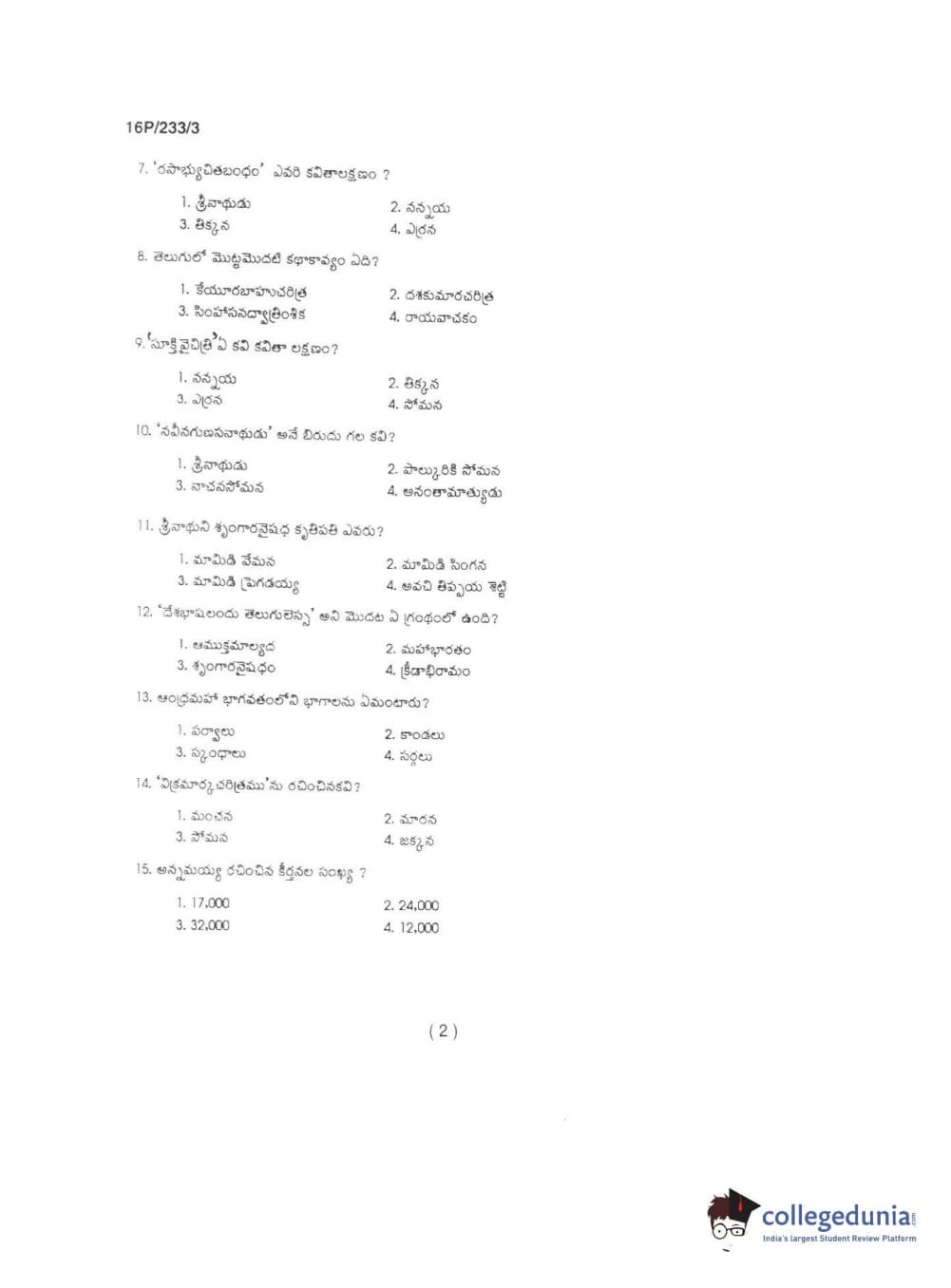 BHU PET 2016 M.A TELUGU Question Paper with Answer Key PDFs in Telugu