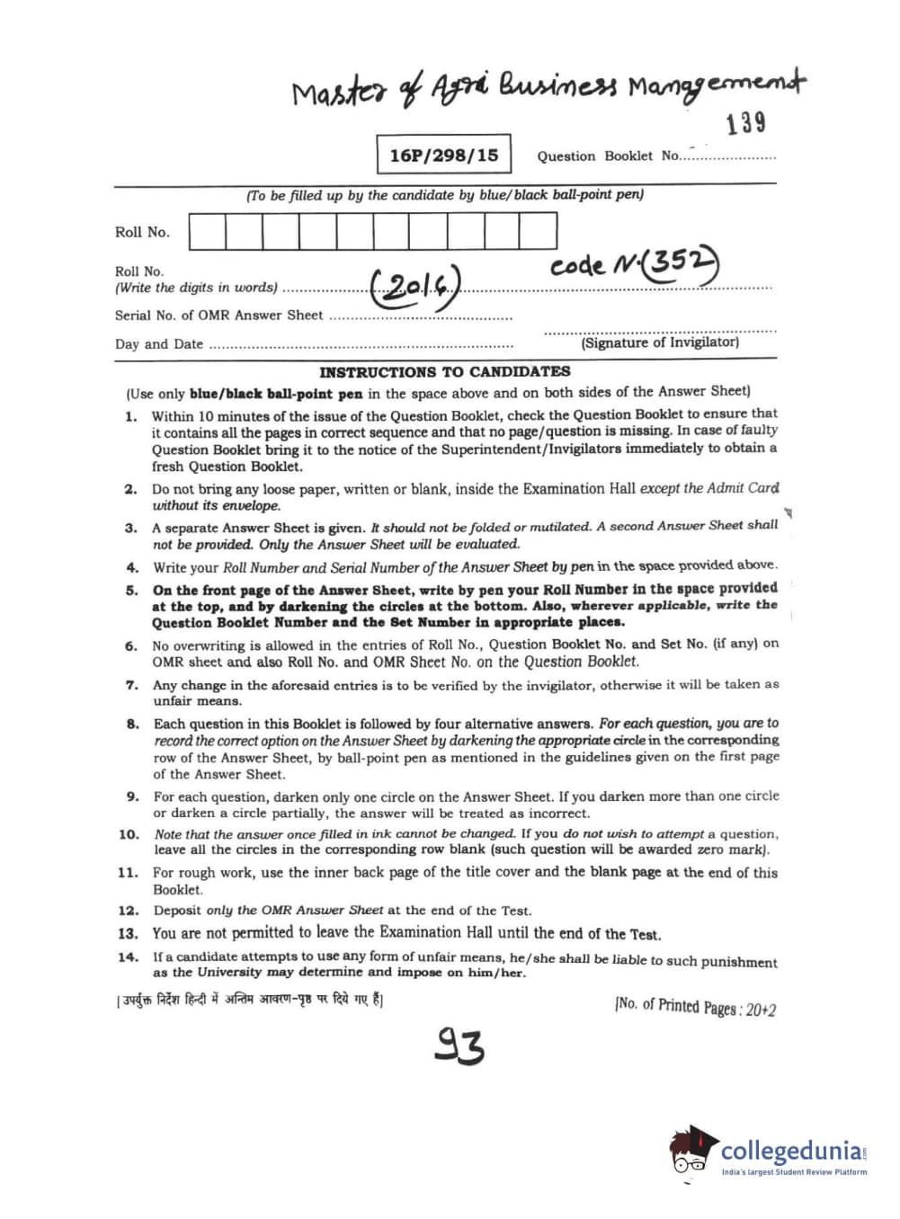 BHU PET 2016 MASTER OF AGRI BUSINESS MANAGEMENT Question paper with answer key pdf is available for download. The exam was successfully organized by Banaras Hindu University (BHU). The question paper comprised a total of 100 questions.