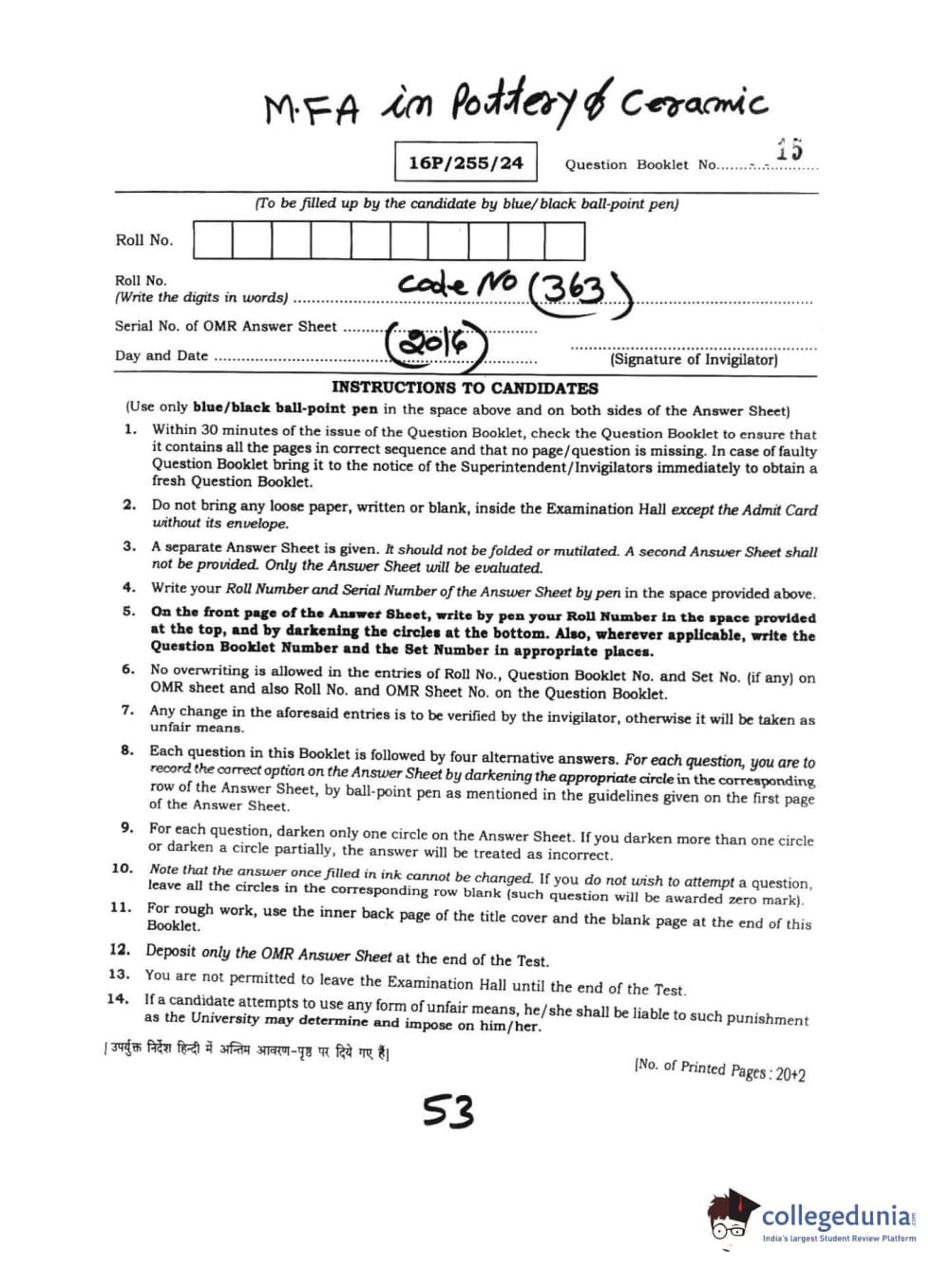 BHU PET 2016 M.F.A. IN POTTERY & CERAMIC Question Paper with Answer Key PDFs