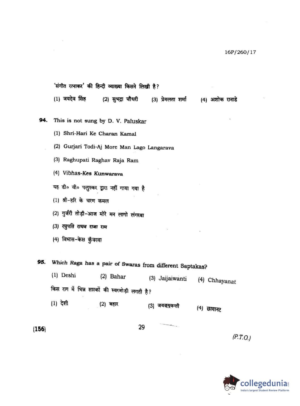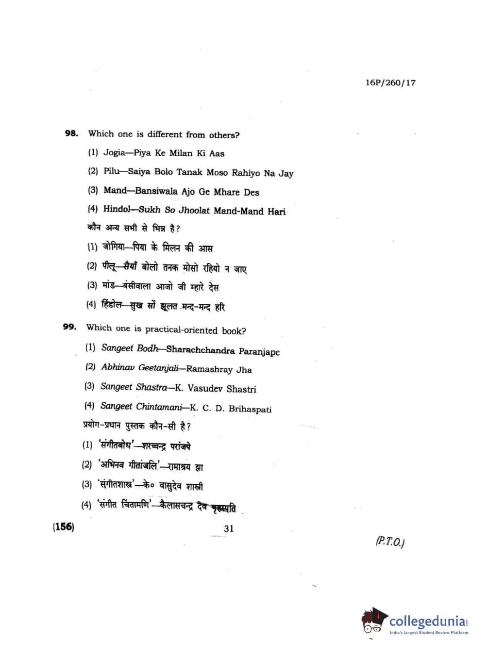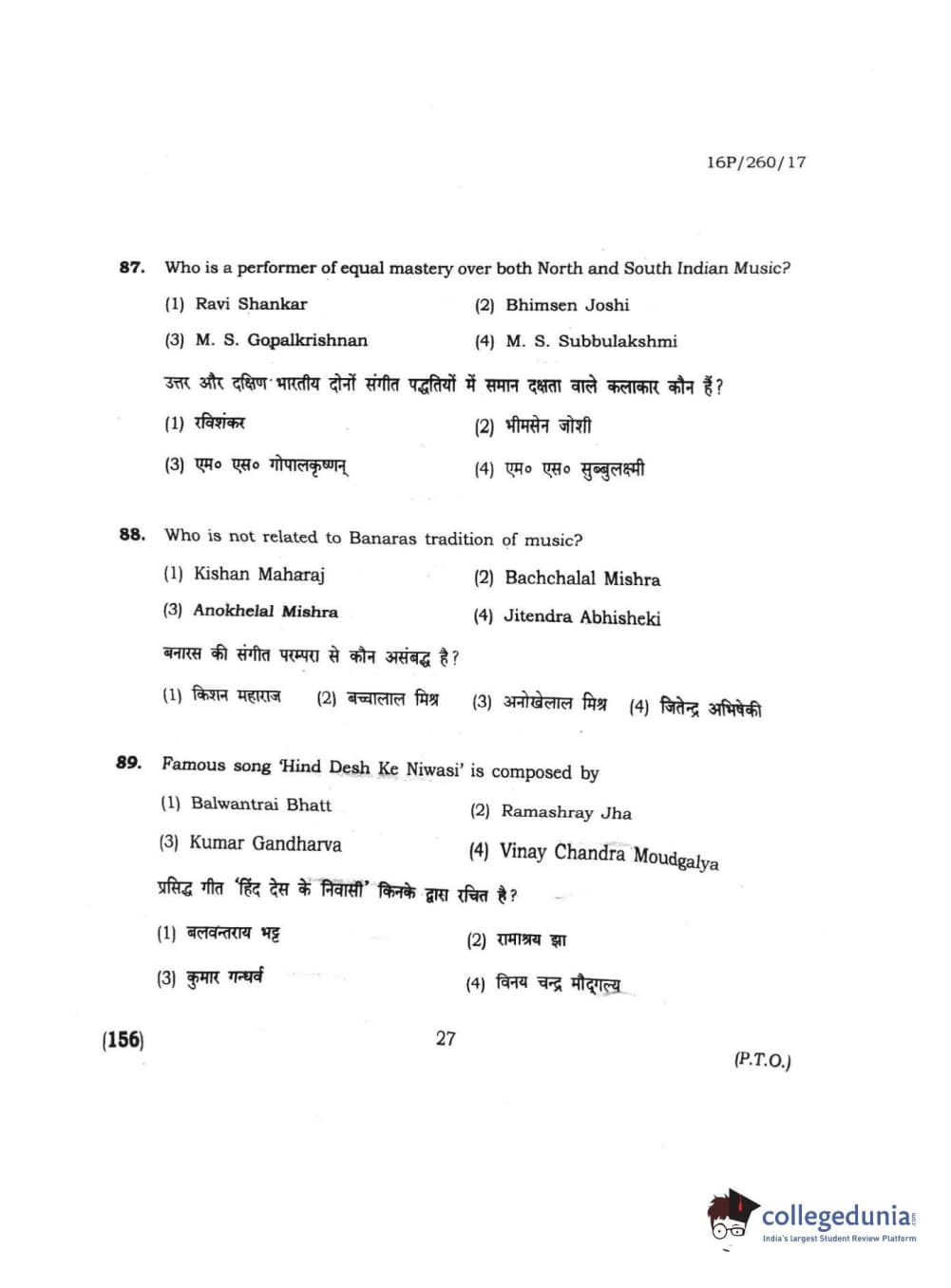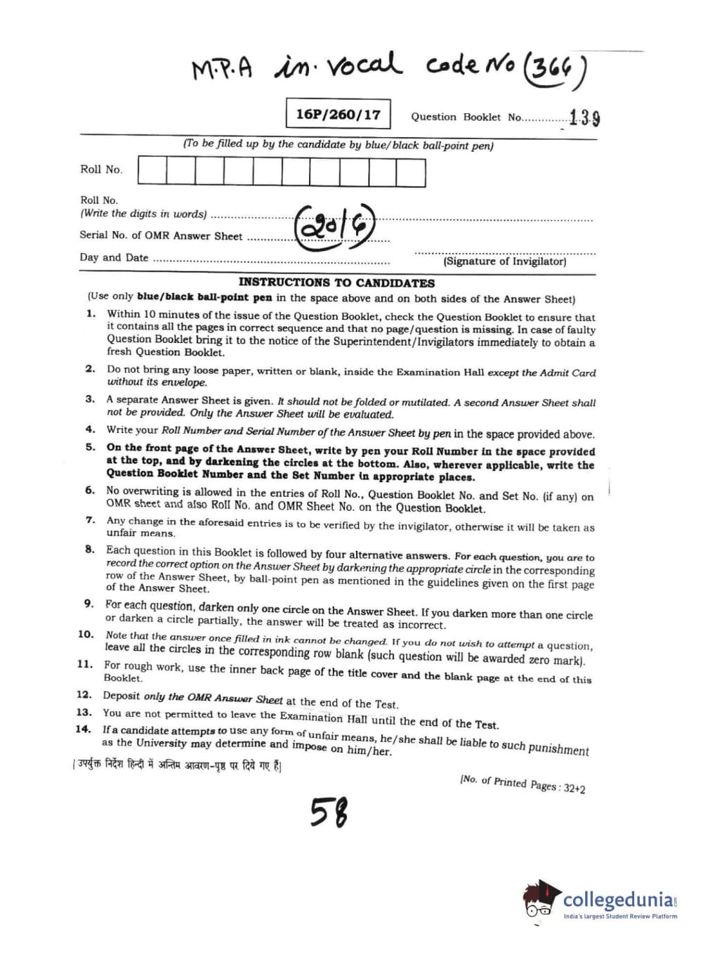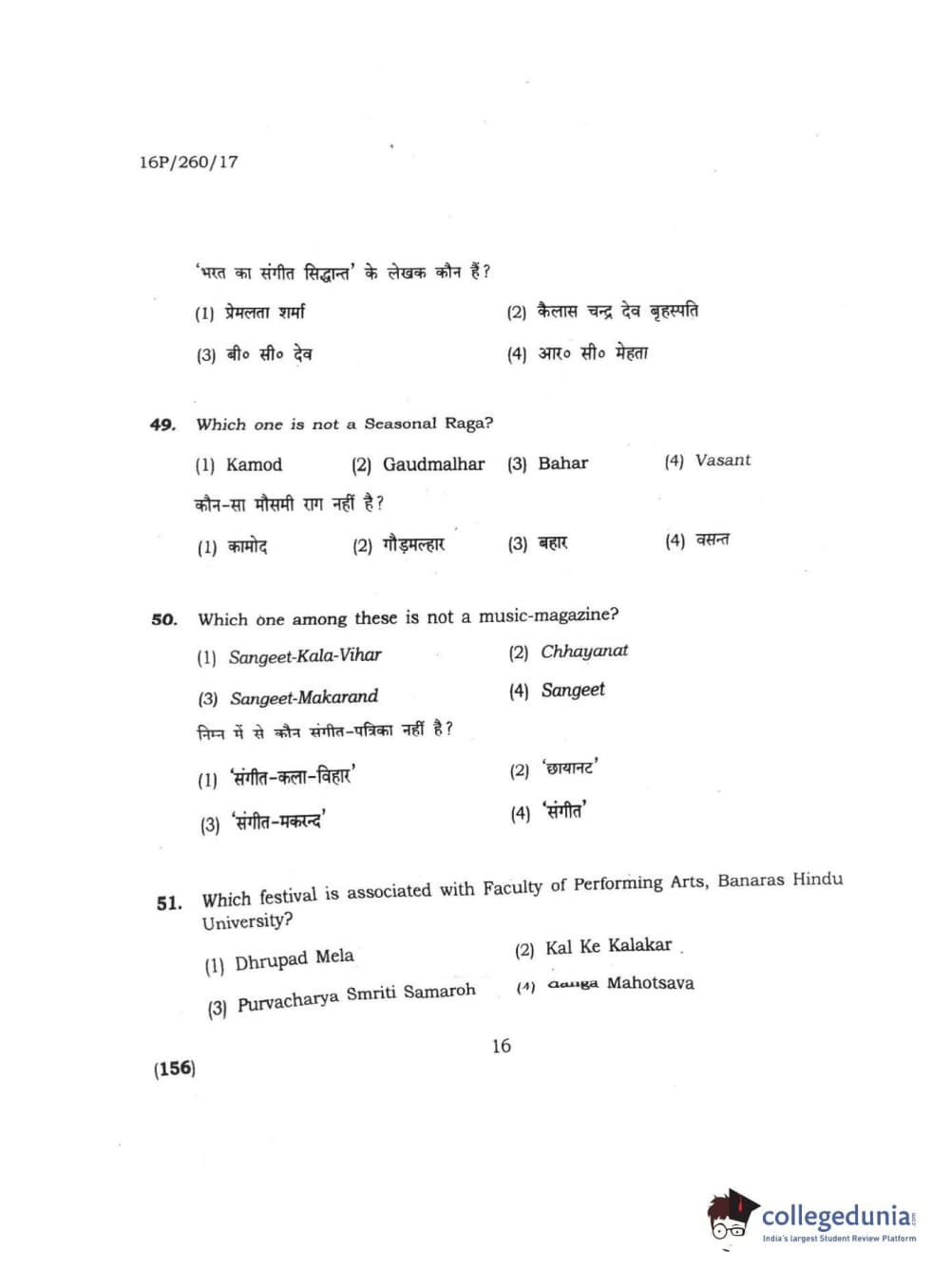 BHU PET 2016 M.PA. IN VOCAL Question Paper with Answer Key PDFs