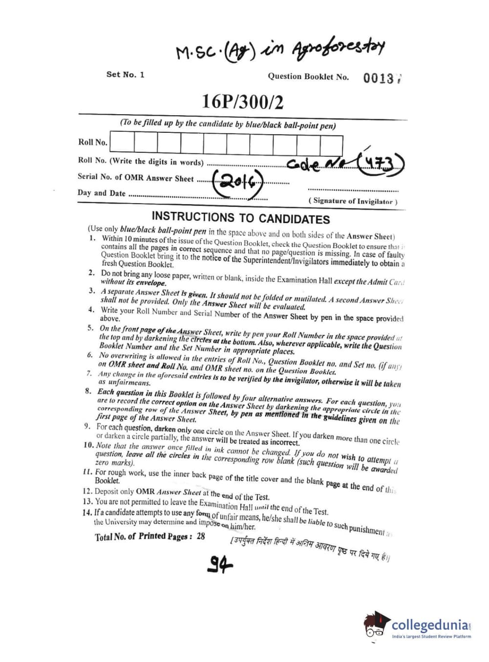 BHU PET 2016 M.SC. AG IN AGROFORESTRY Question paper with answer key pdf is available for download. The exam was successfully organized by Banaras Hindu University (BHU). The question paper comprised a total of 120 questions.