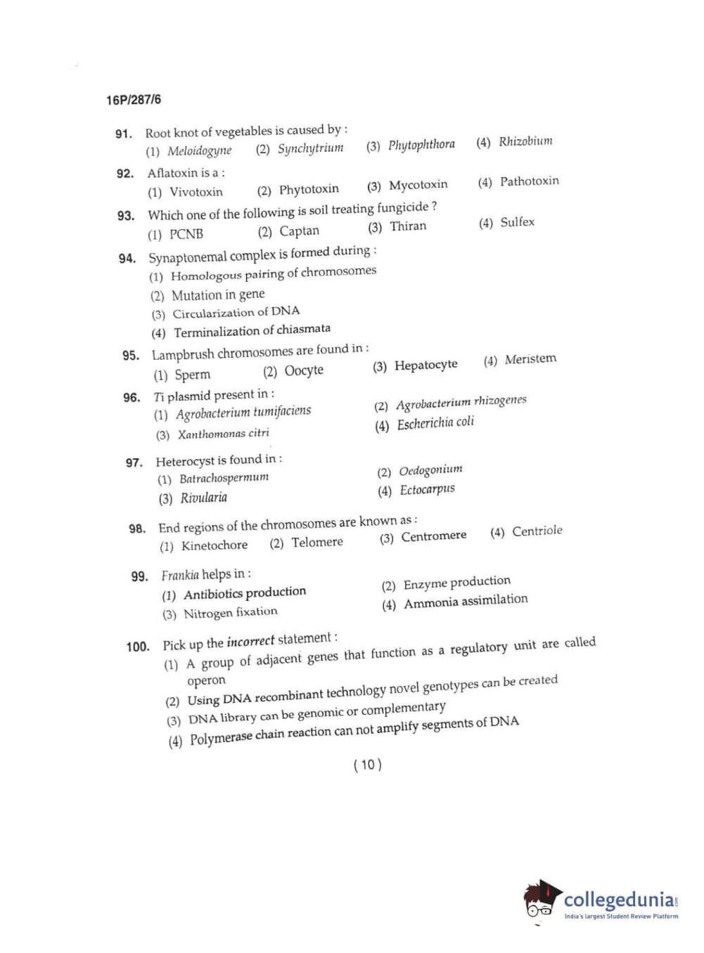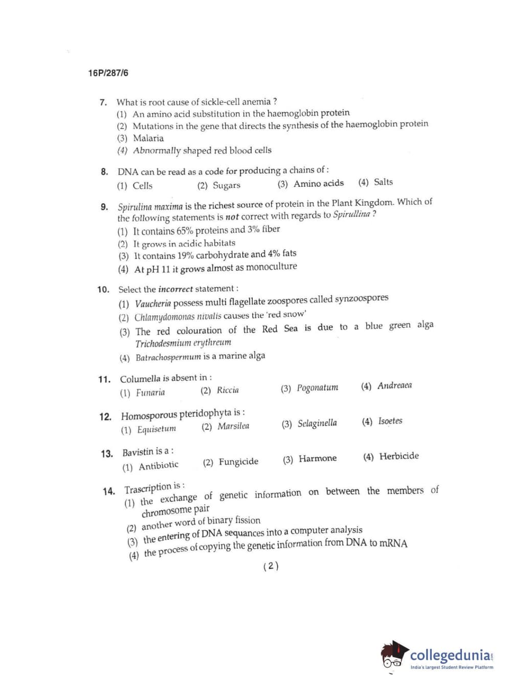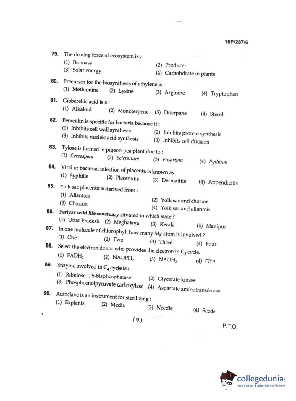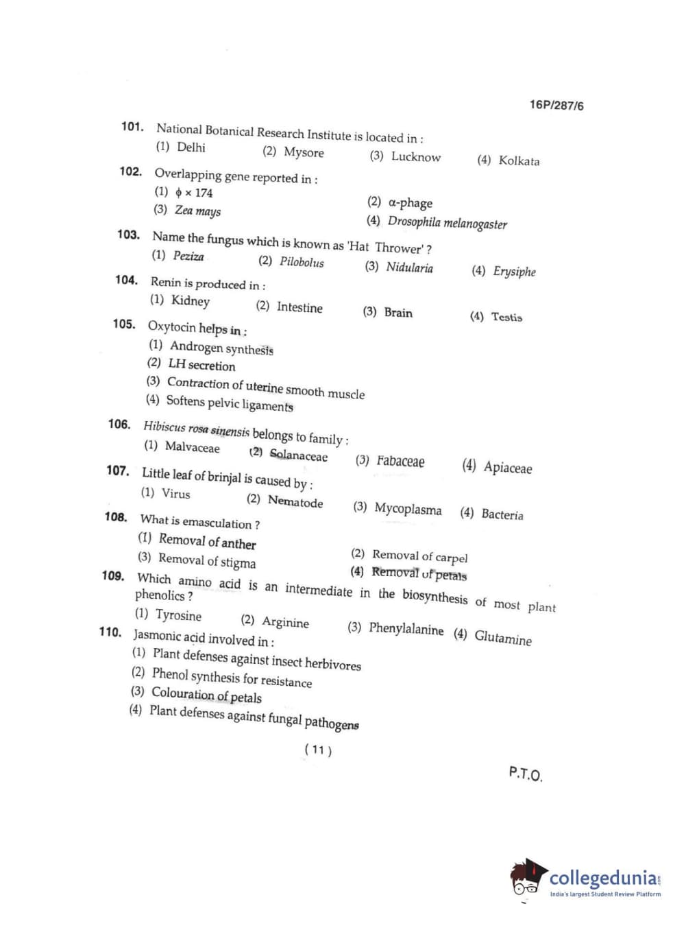 BHU PET 2016 M.SC. IN PLANT BIOTECH Question Paper with Answer Key PDFs