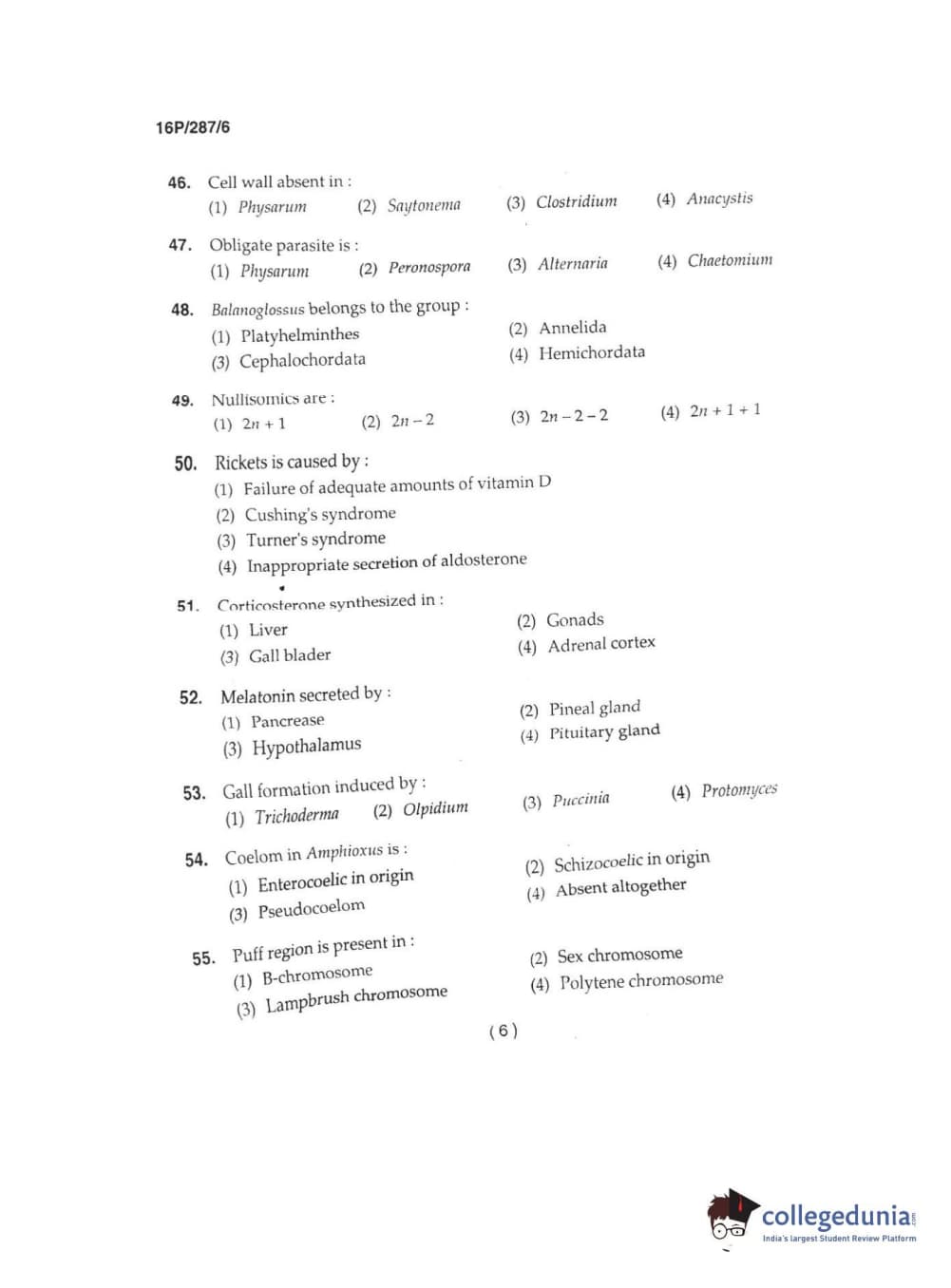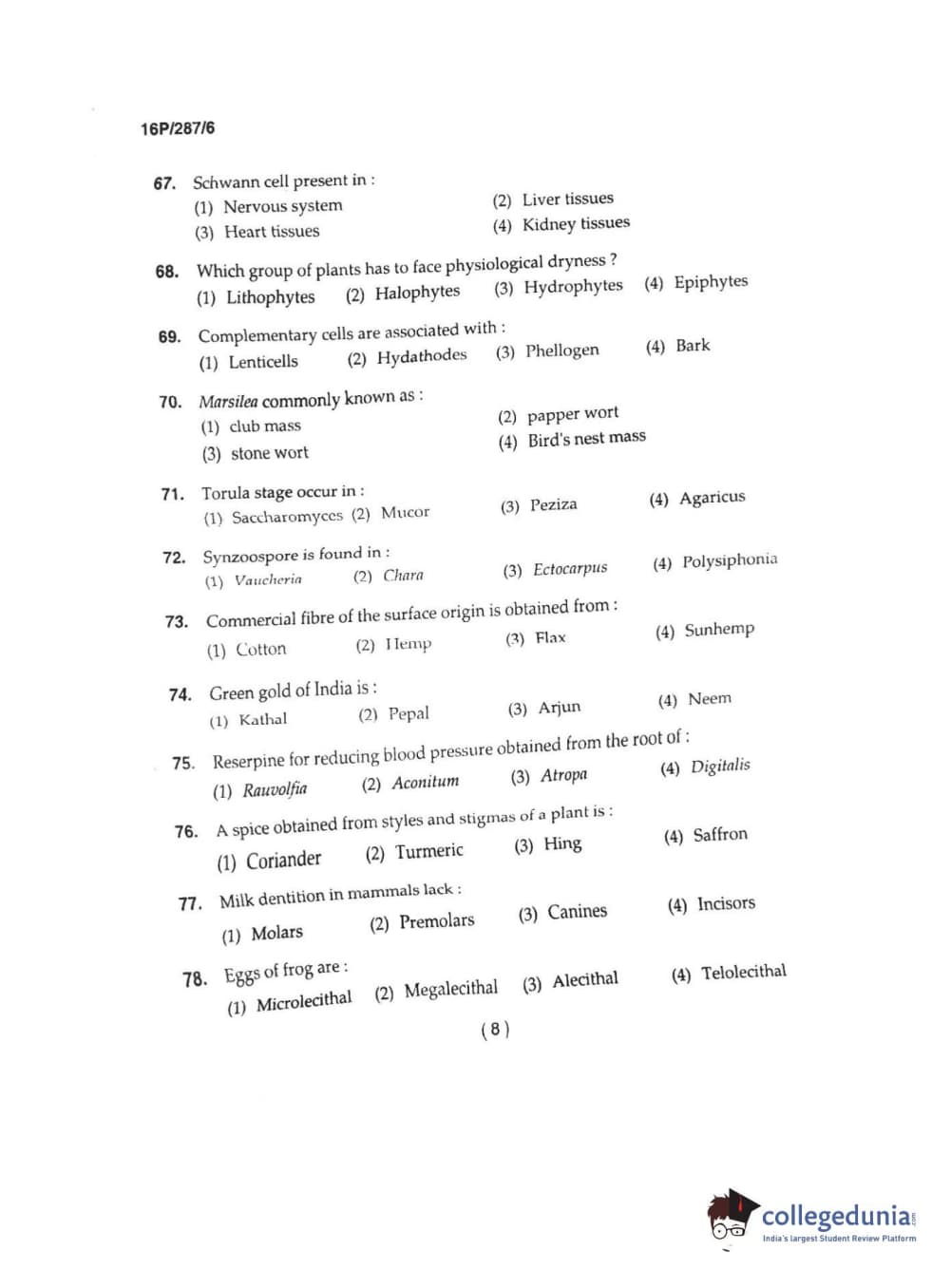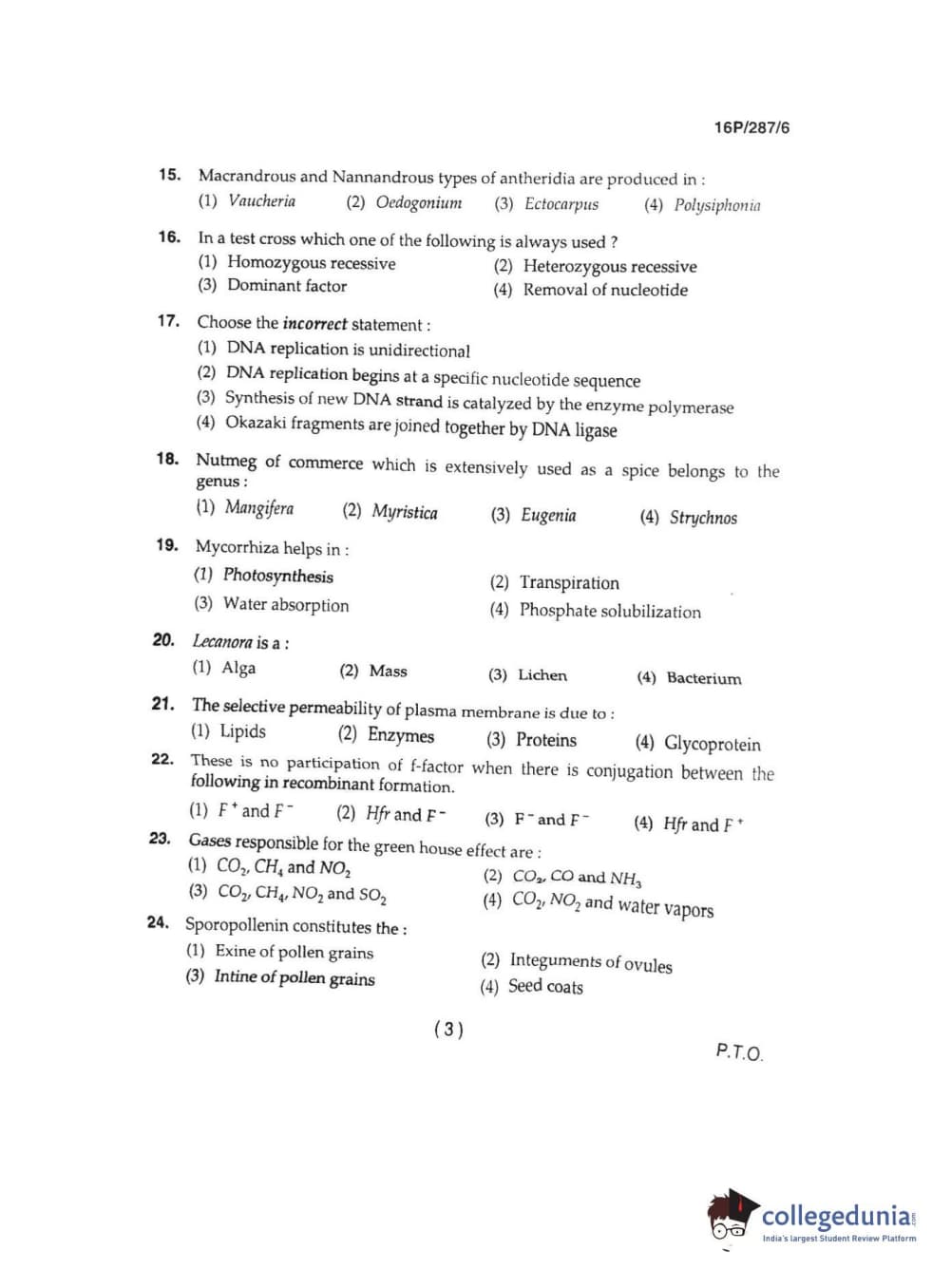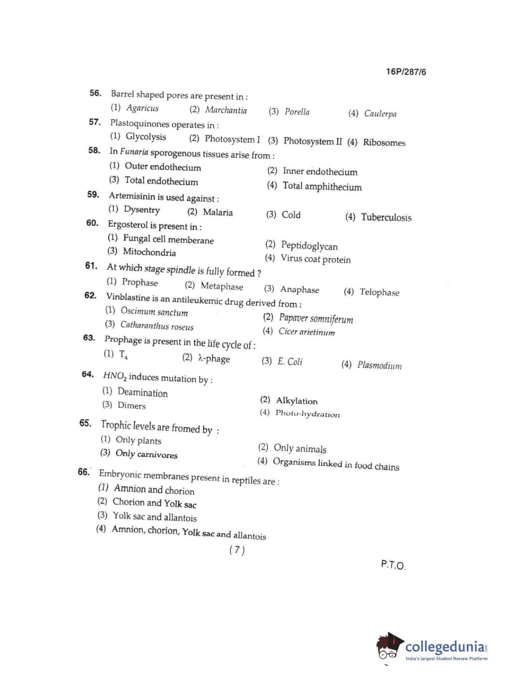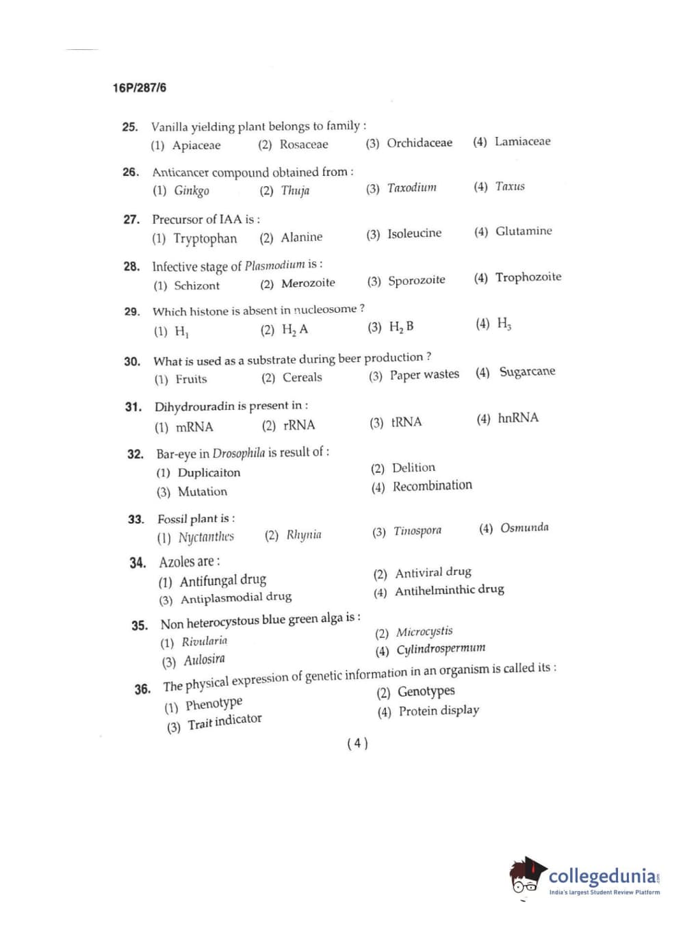 BHU PET 2016 M.SC. IN PLANT BIOTECH Question Paper with Answer Key PDFs