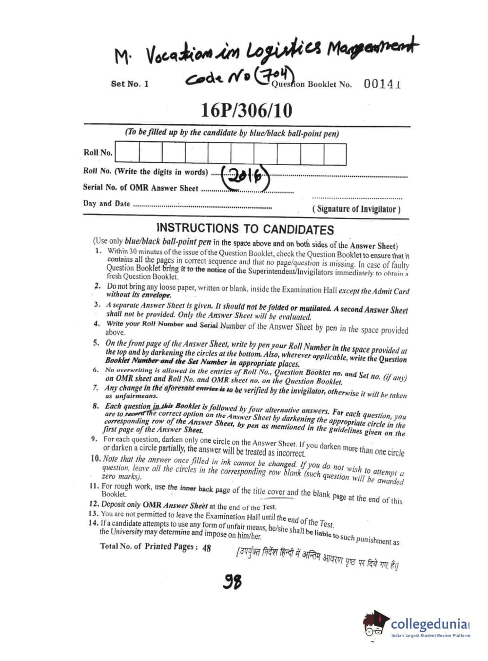 BHU PET 2016 M.Voc LOGISTIC Question paper with answer key pdf is available for download. The exam was successfully organized by Banaras Hindu University (BHU). The question paper comprised a total of 150 questions.