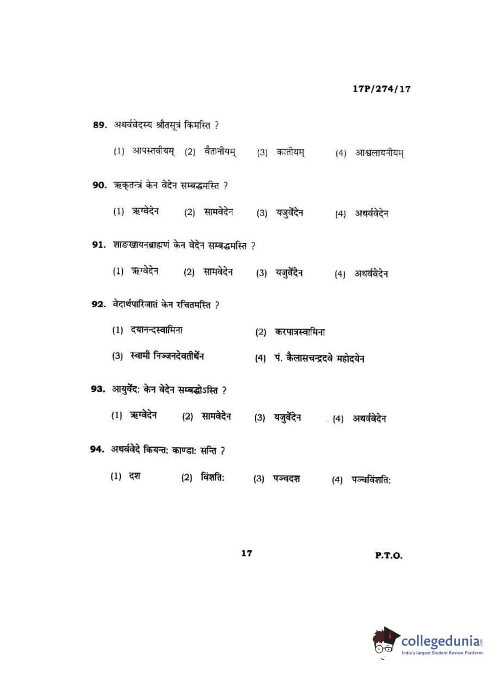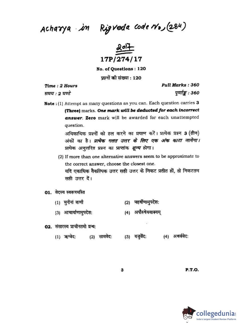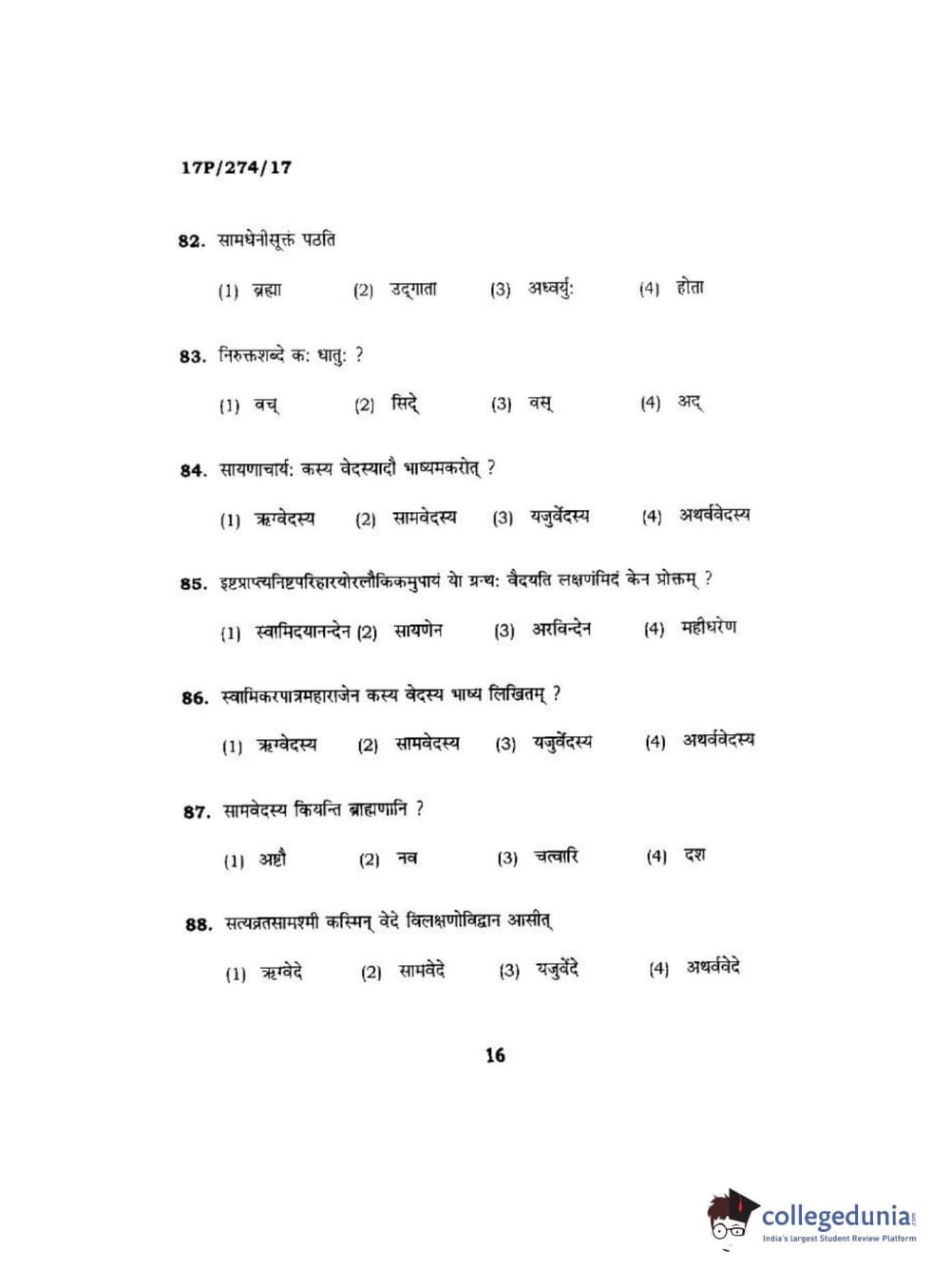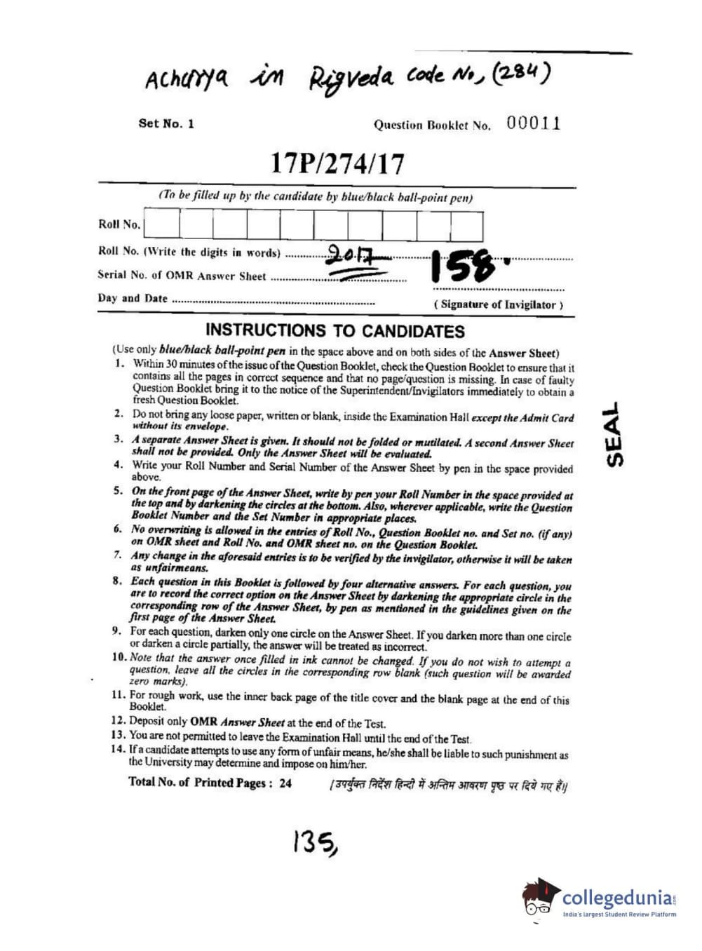 BHU PET 2017 Acharya in Rigveda Question Paper with Answer Key PDFs