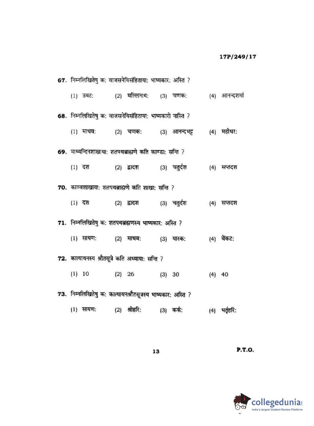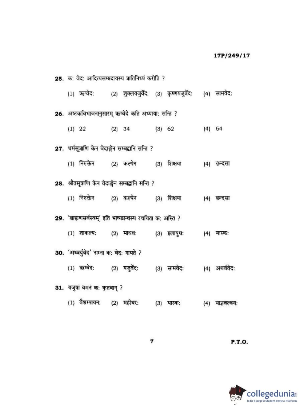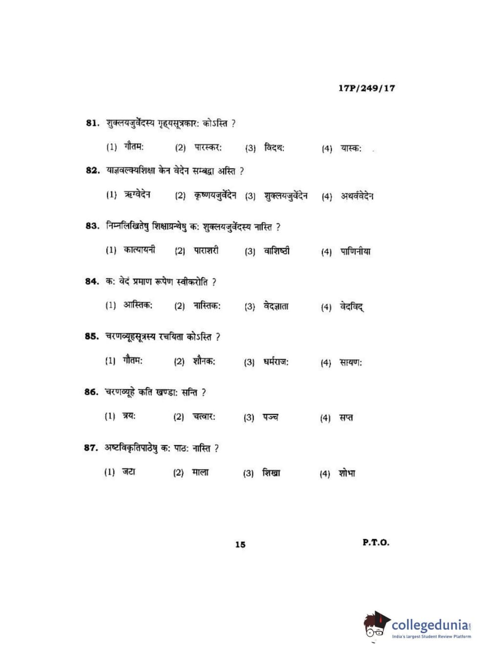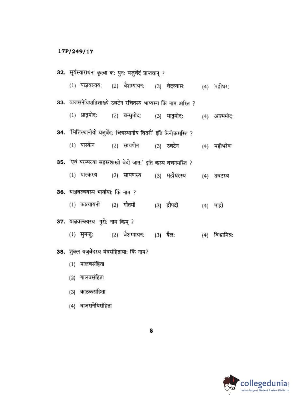 BHU PET 2017 Acharya in Shukla Yajurveda Question Paper with Answer Key PDFs in Hindi