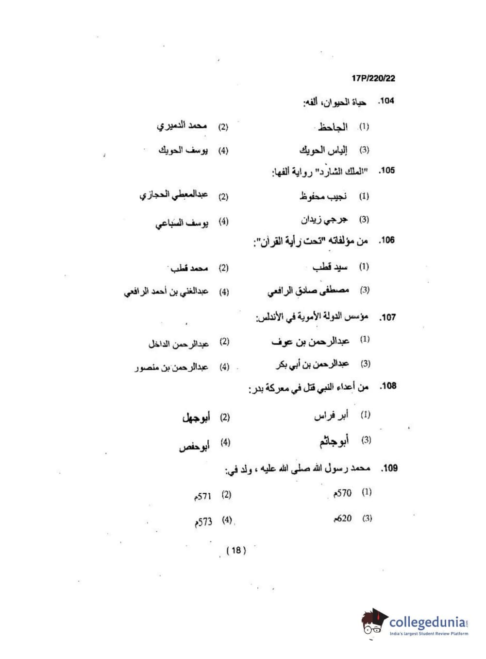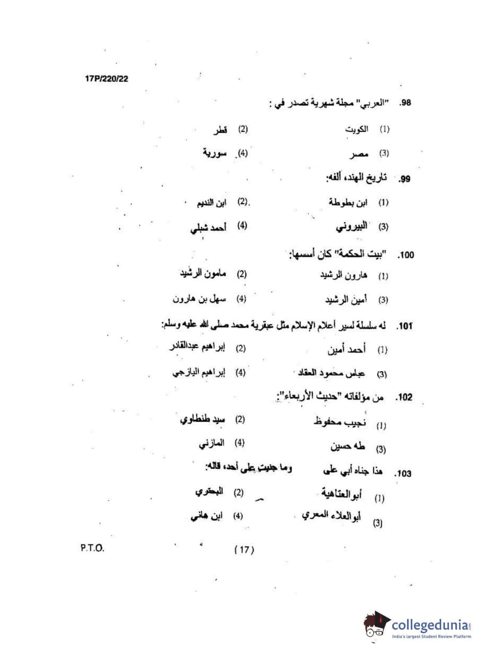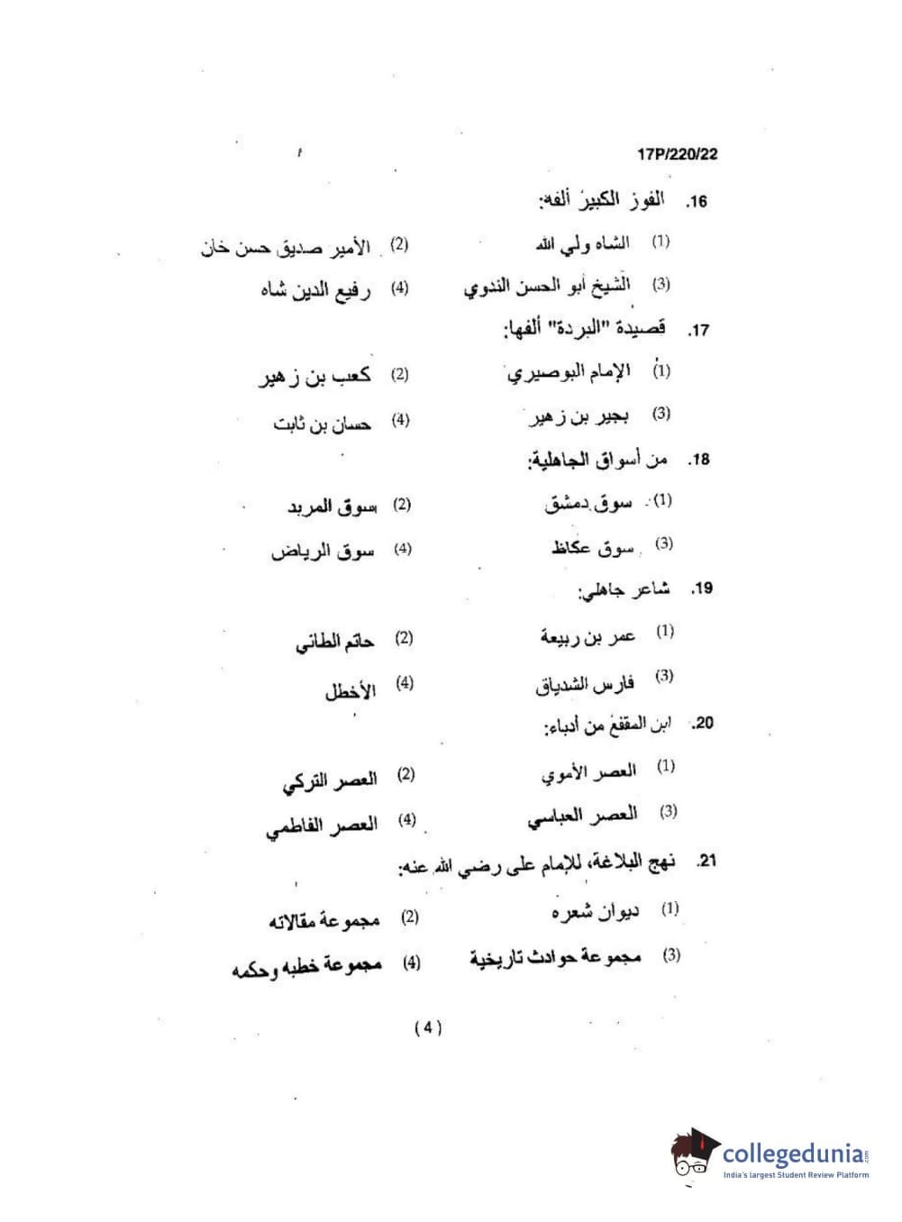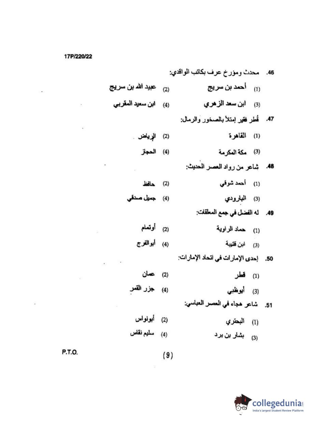 BHU PET 2017 M.A Arabic Question Paper with Answer Key PDFs