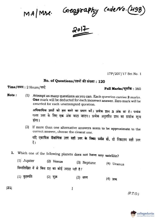 BHU PET 2017 M.A. Geography Question paper with answer key pdf is available for download. The exam was successfully organized by Banaras Hindu University (BHU). The question paper comprised a total of 120 questions.