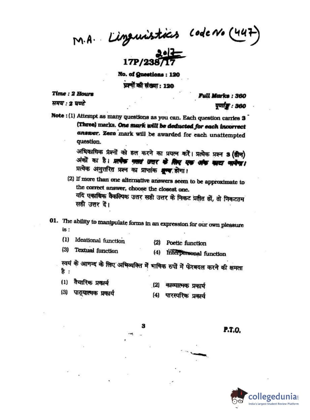 BHU PET 2017 M.A Linguistics Question paper with answer key pdf is available for download. The exam was successfully organized by Banaras Hindu University (BHU). The question paper comprised a total of 120 questions.