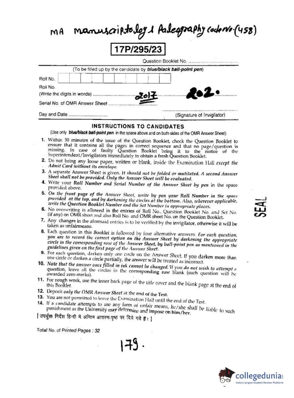 BHU PET 2017 M.A. Manuscriptolog & Paleography Question Paper with Answer Key PDFs
