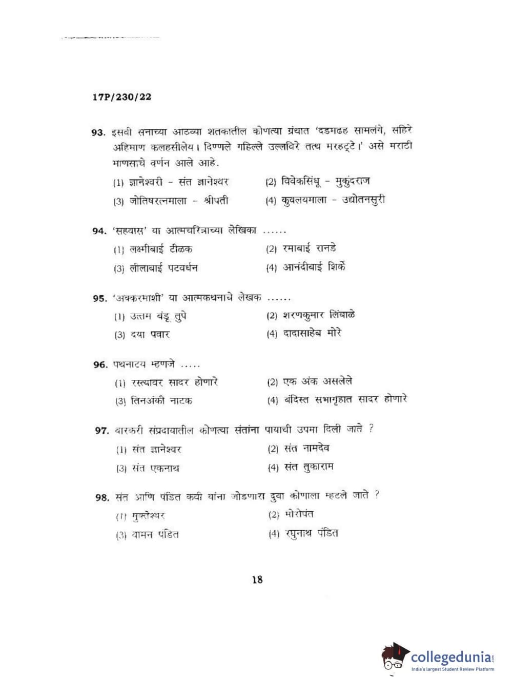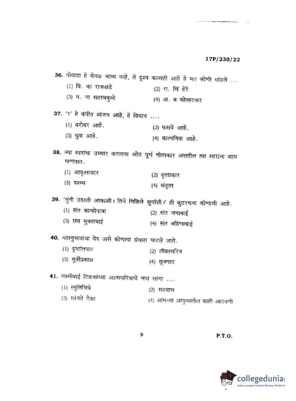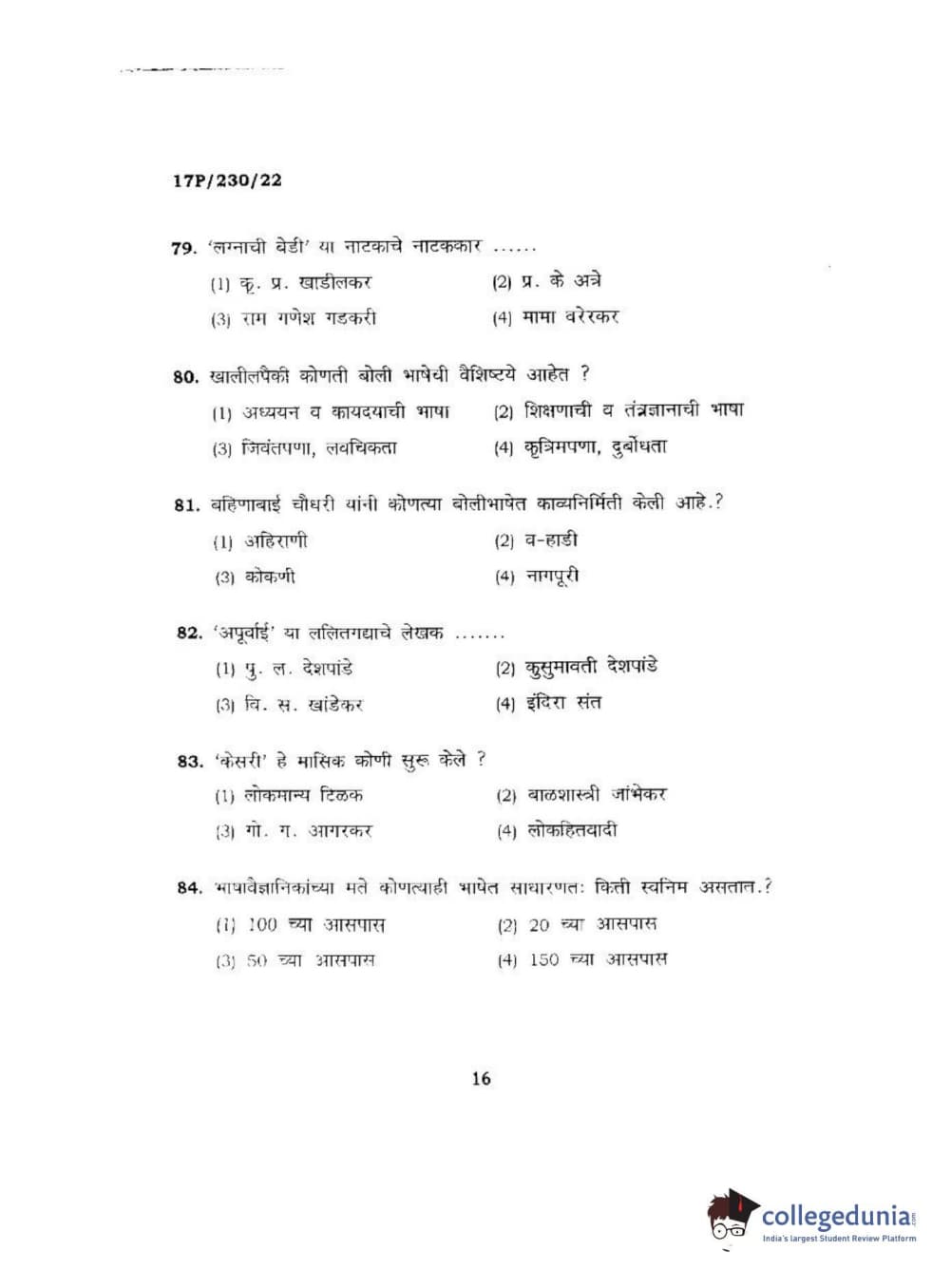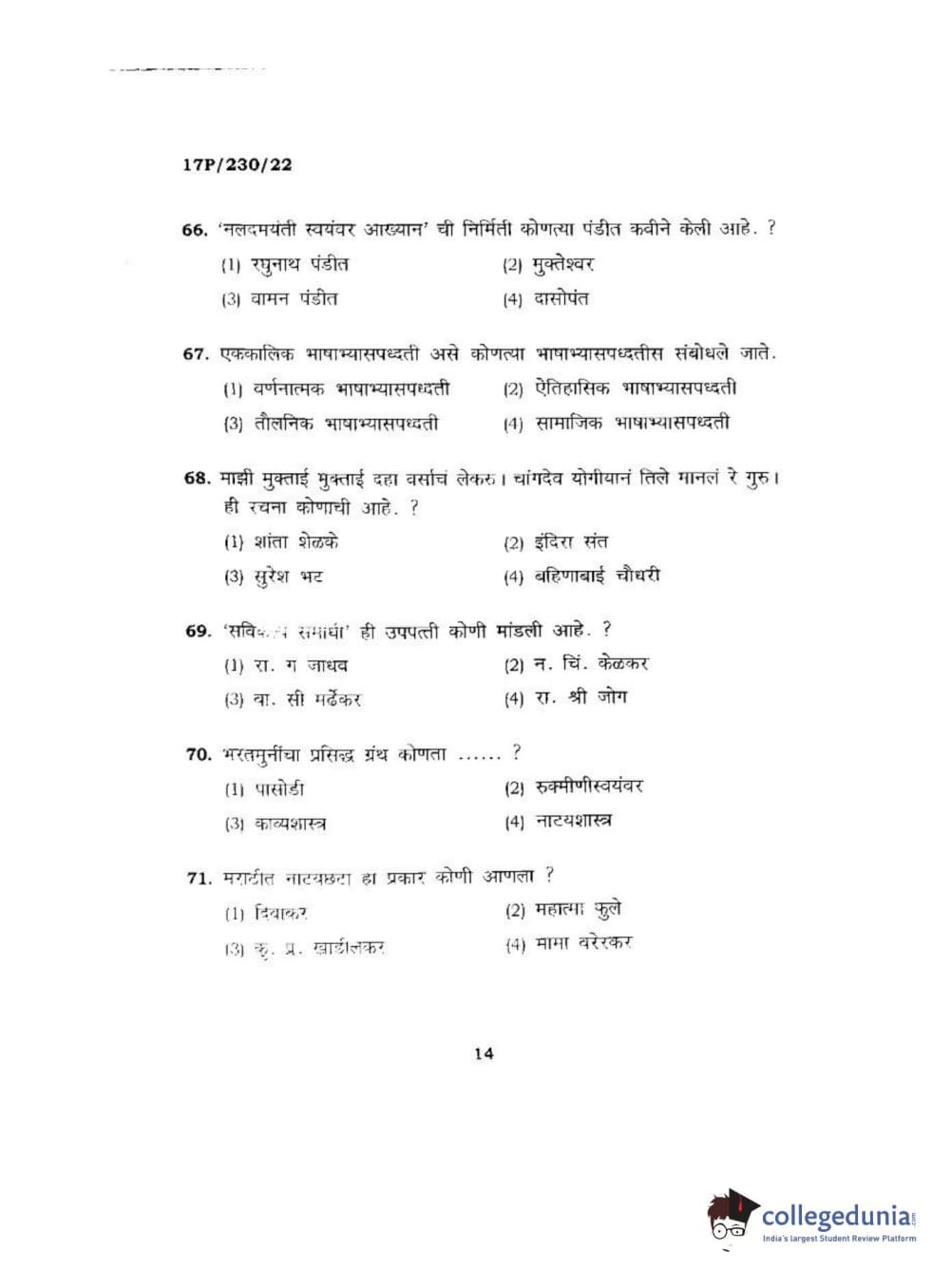 BHU PET 2017 M.A. Marathi Question Paper with Answer Key PDFs