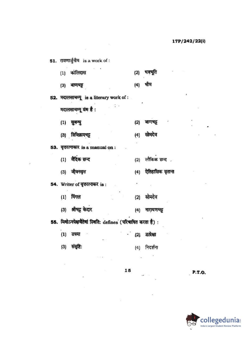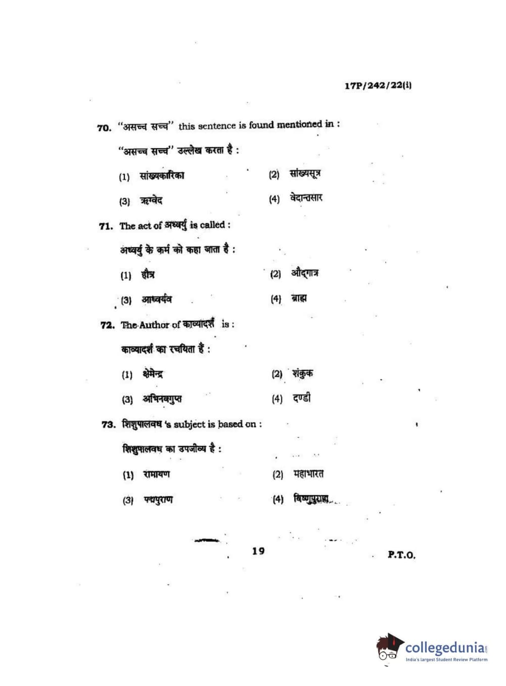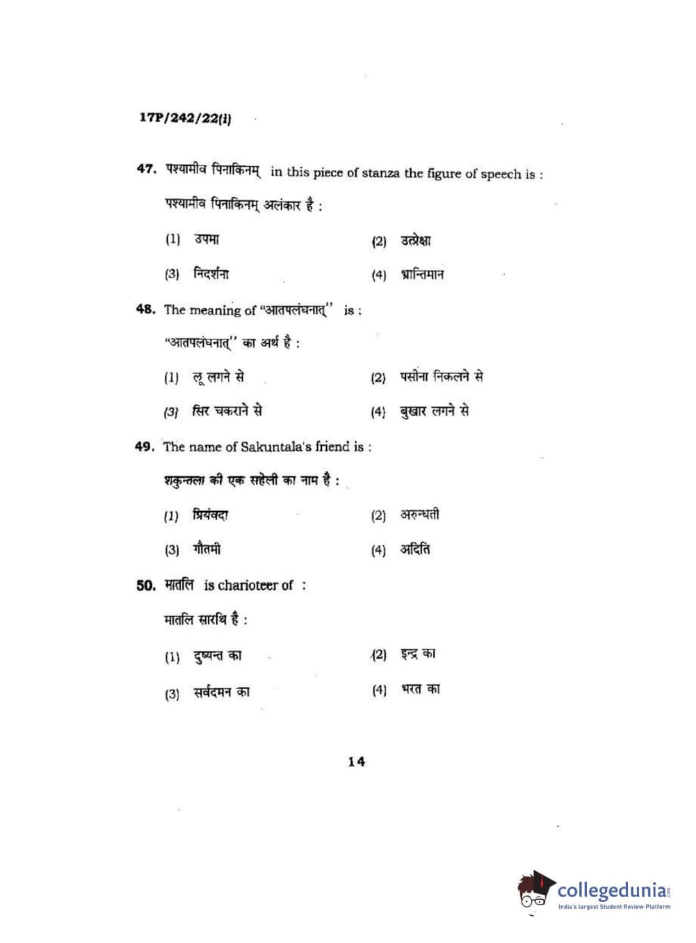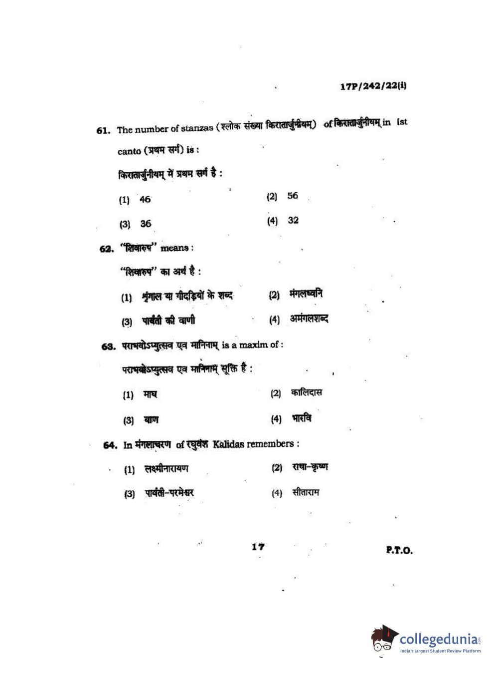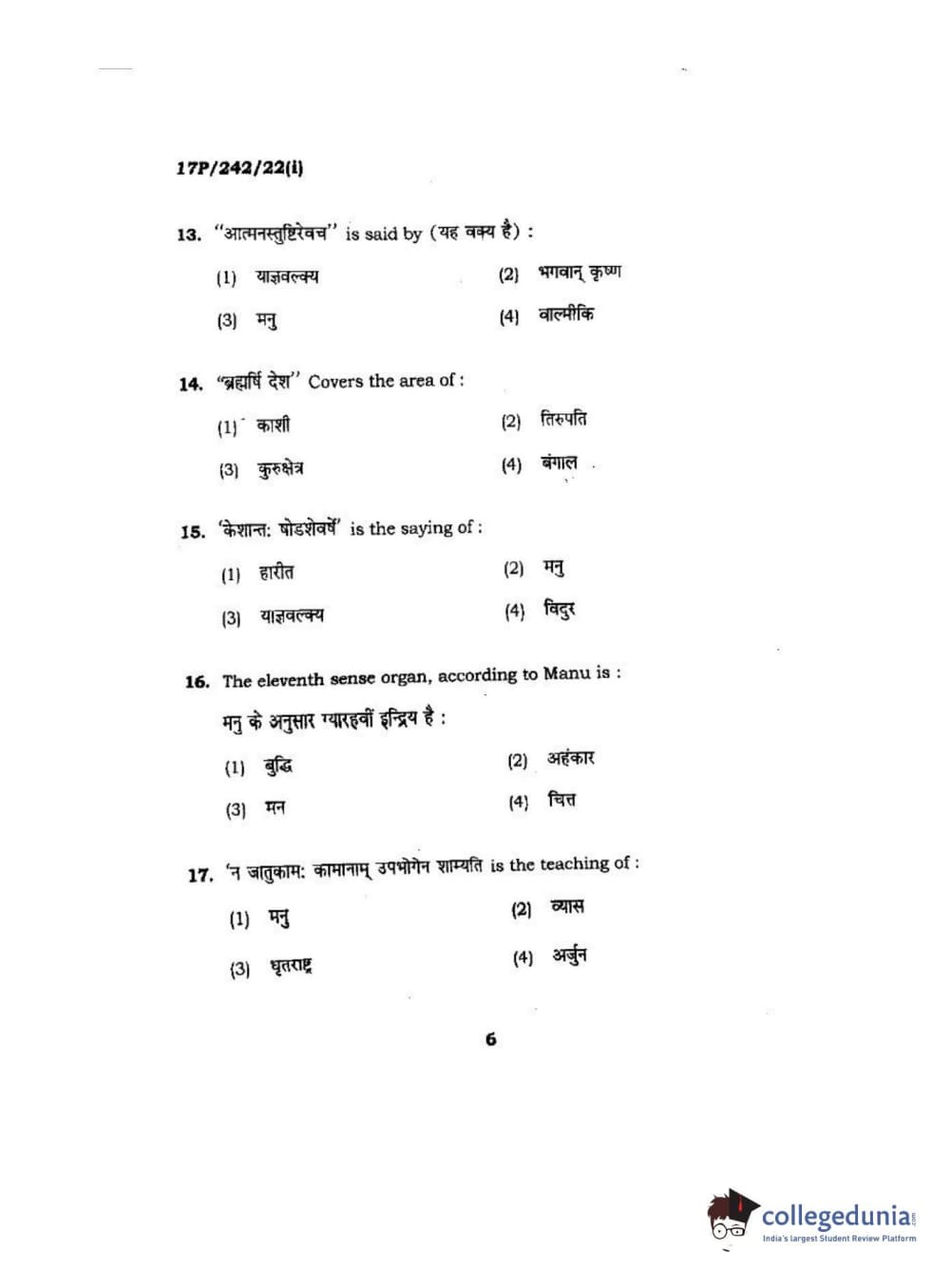BHU PET 2017 M.A Sanskrit Question Paper with Answer Key PDFs