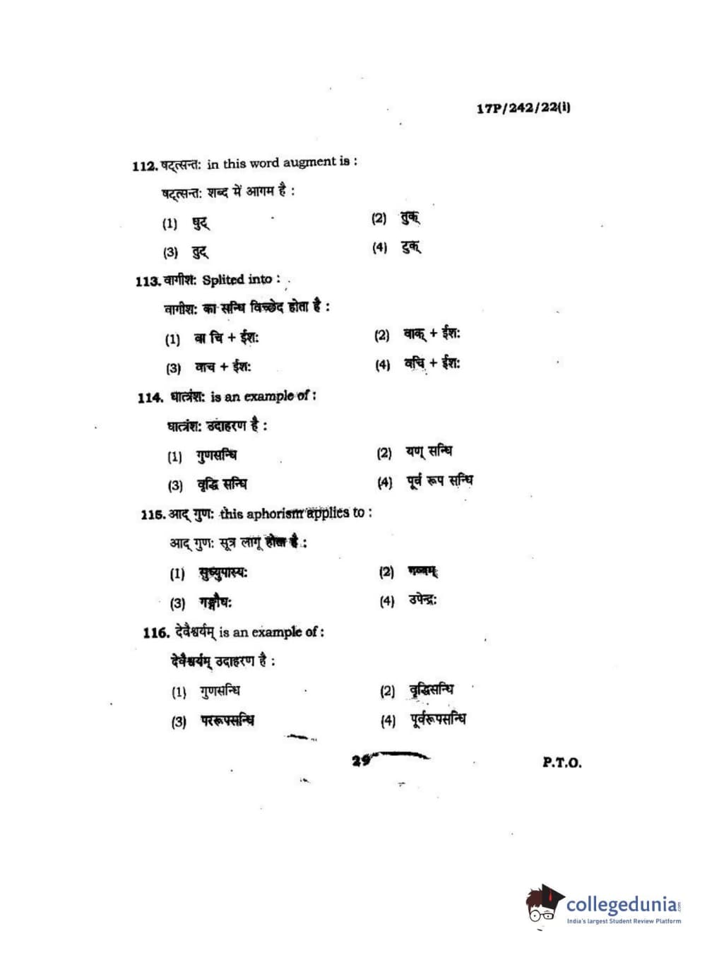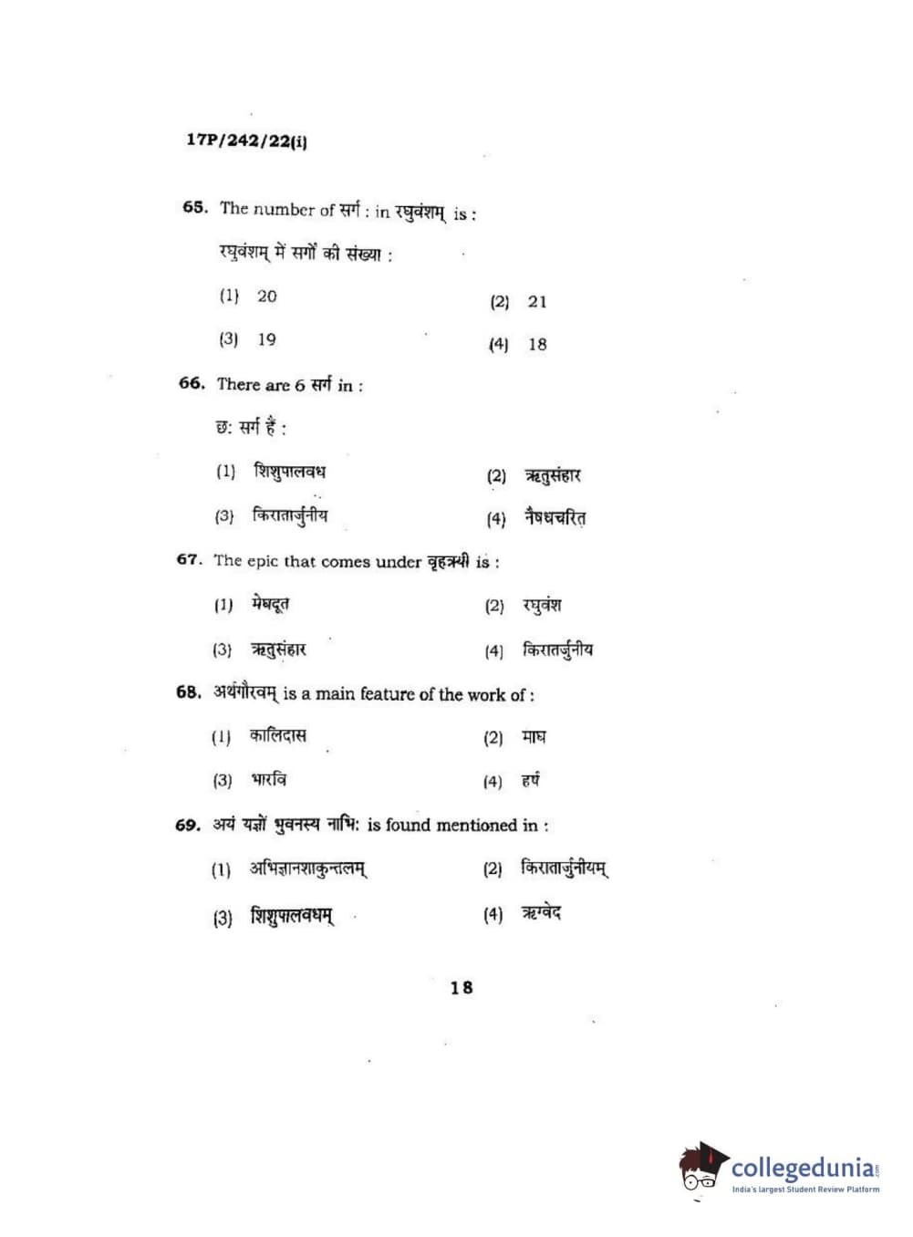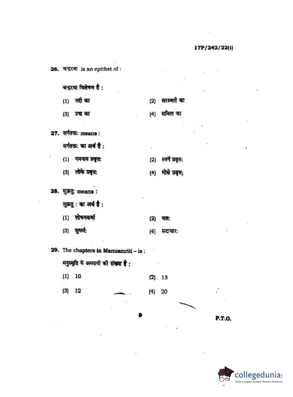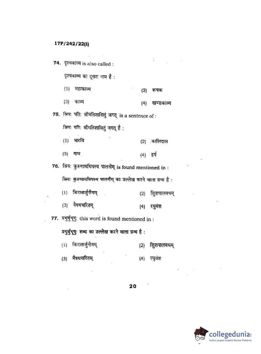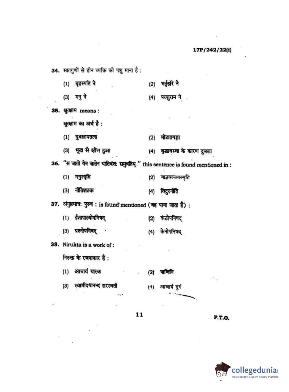BHU PET 2017 M.A Sanskrit Question Paper with Answer Key PDFs
