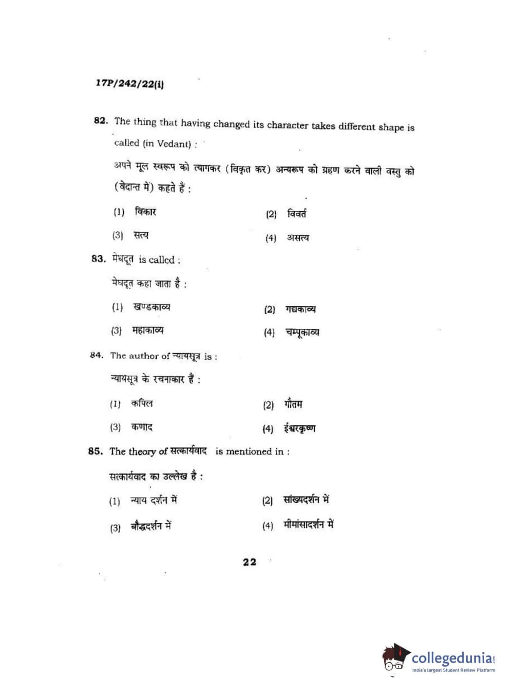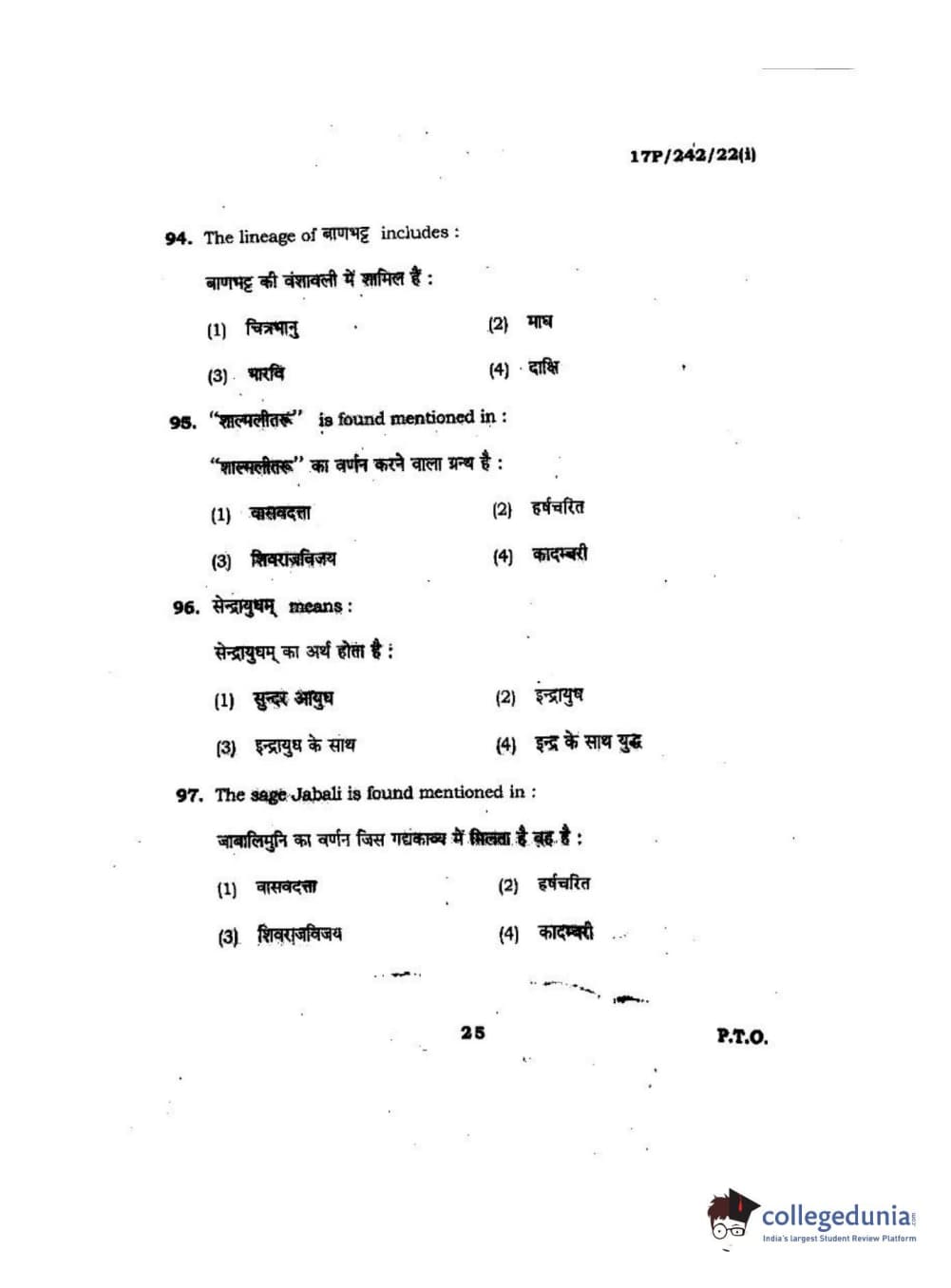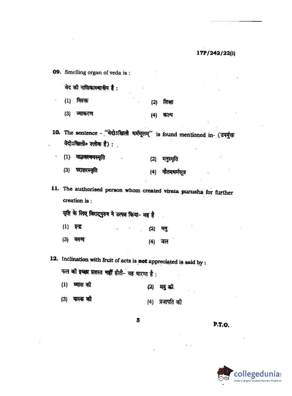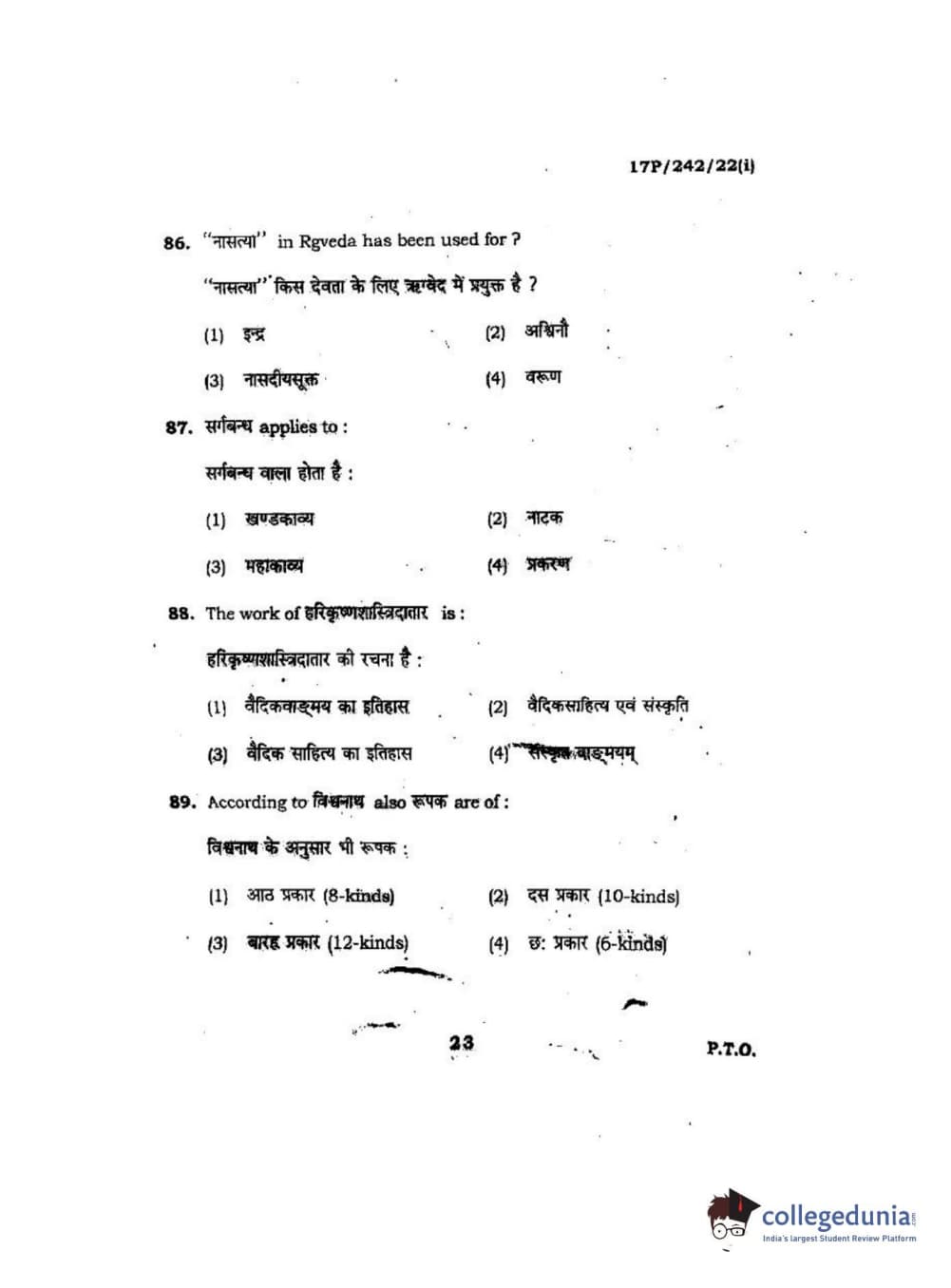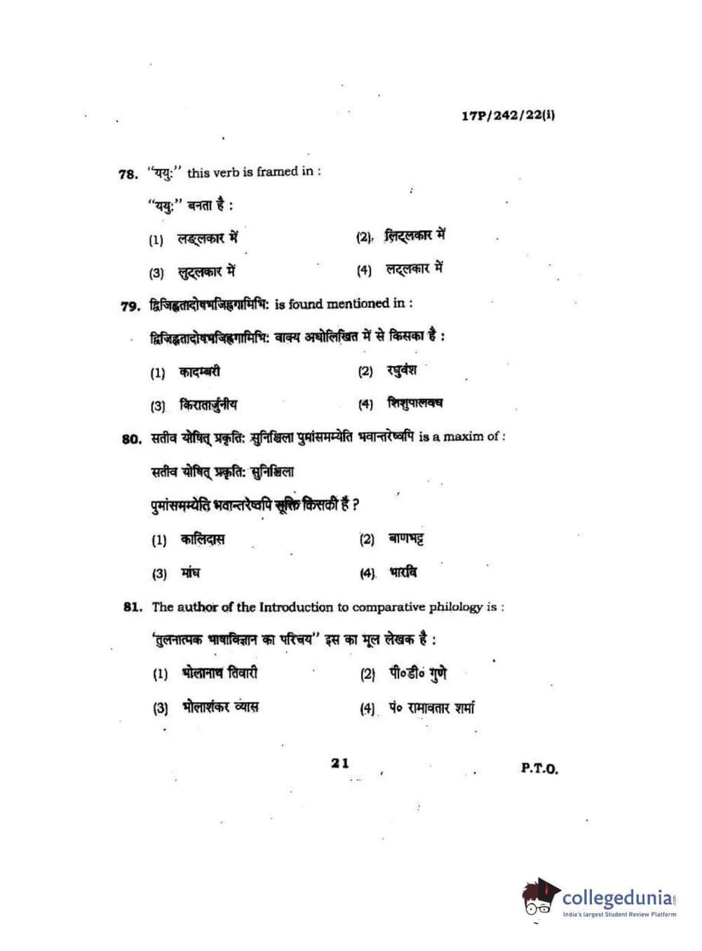 BHU PET 2017 M.A Sanskrit Question Paper with Answer Key PDFs