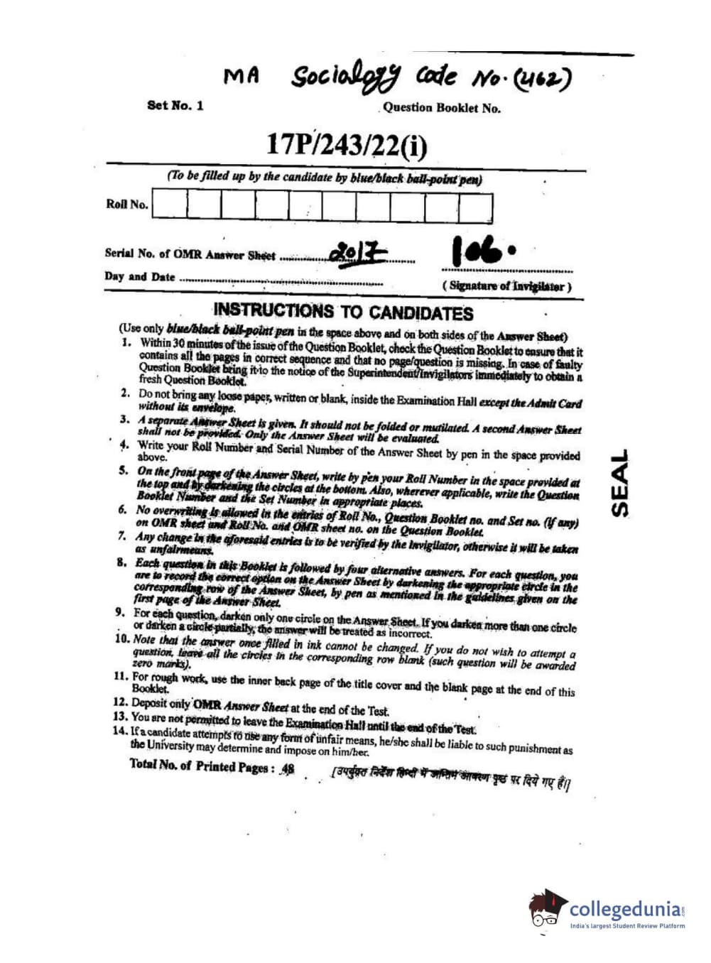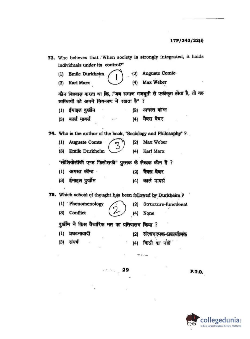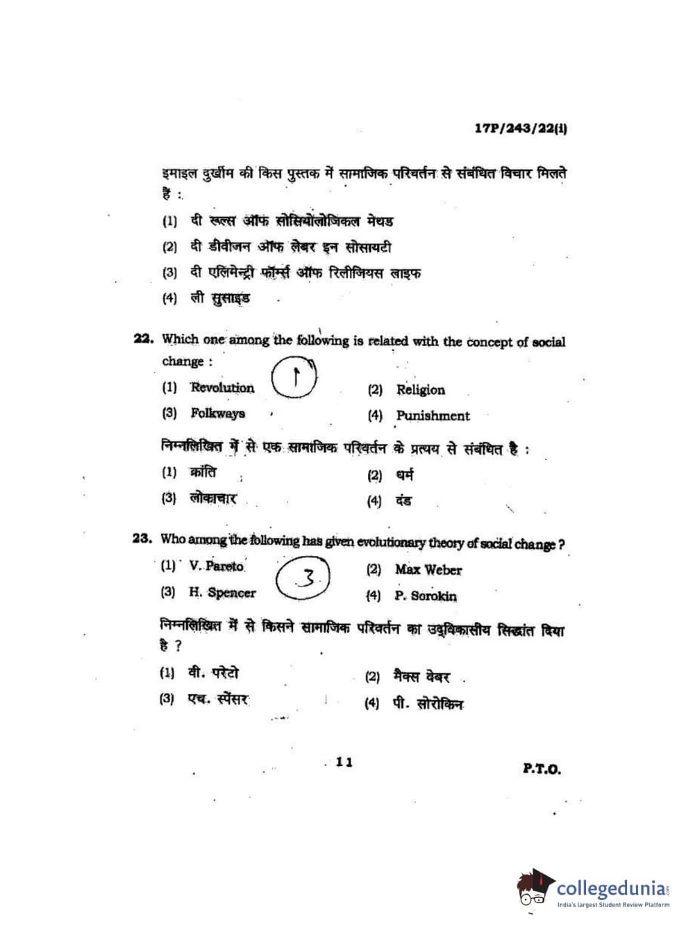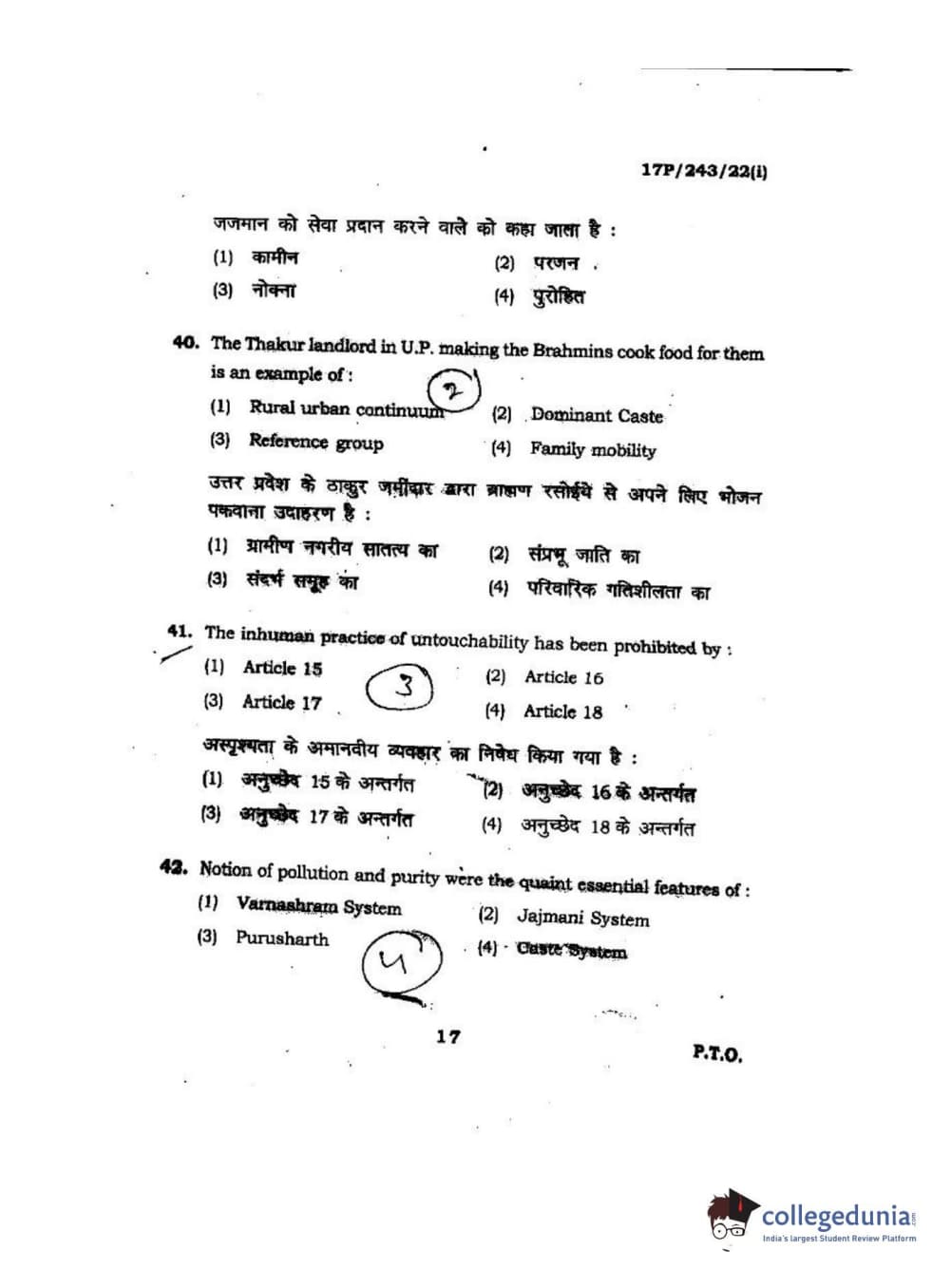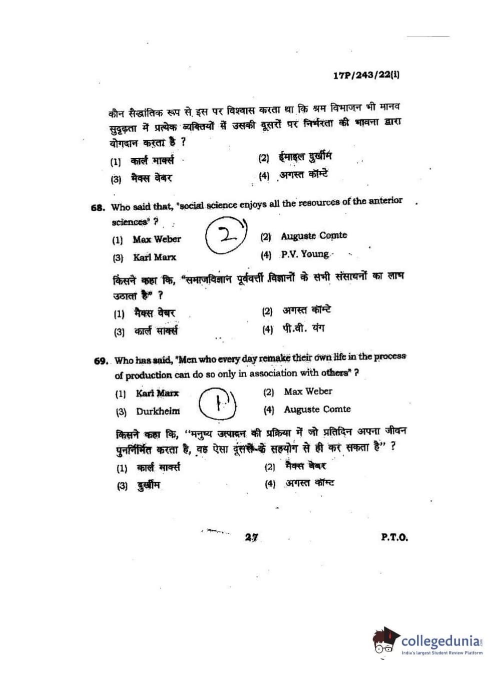 BHU PET 2017 M.A Sociology Question Paper with Answer Key PDFs