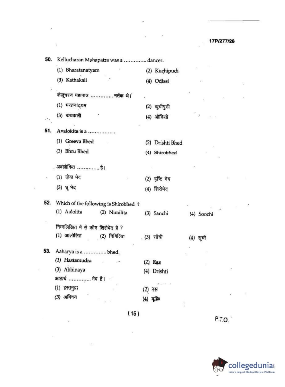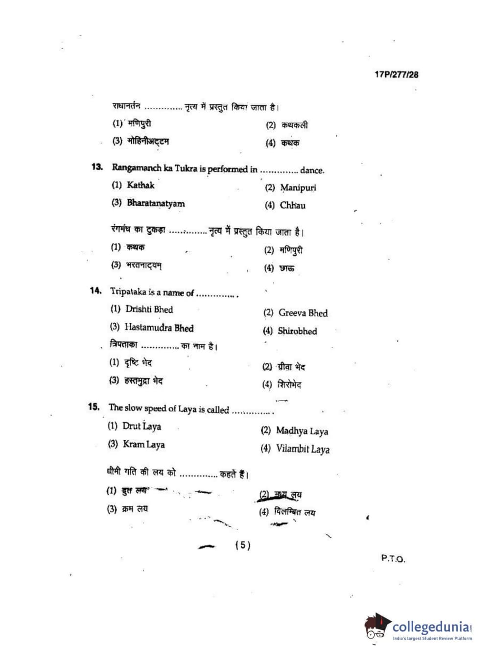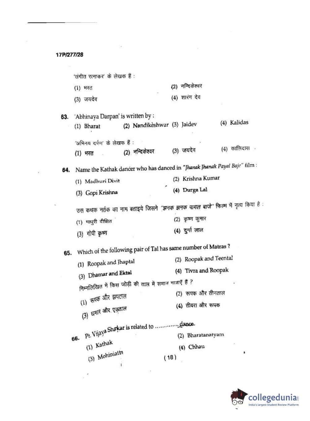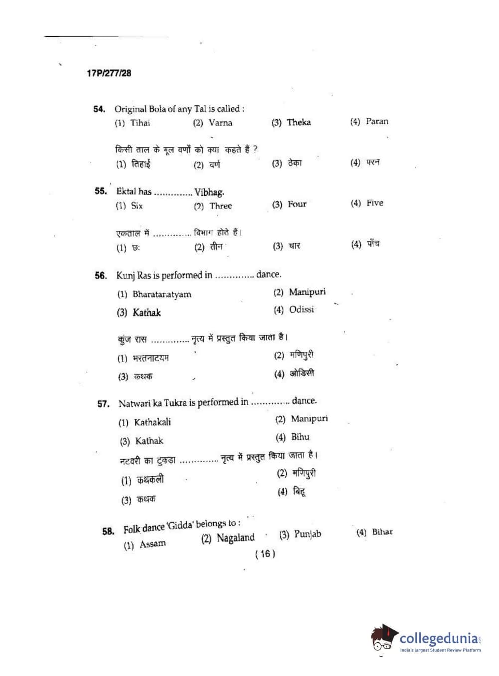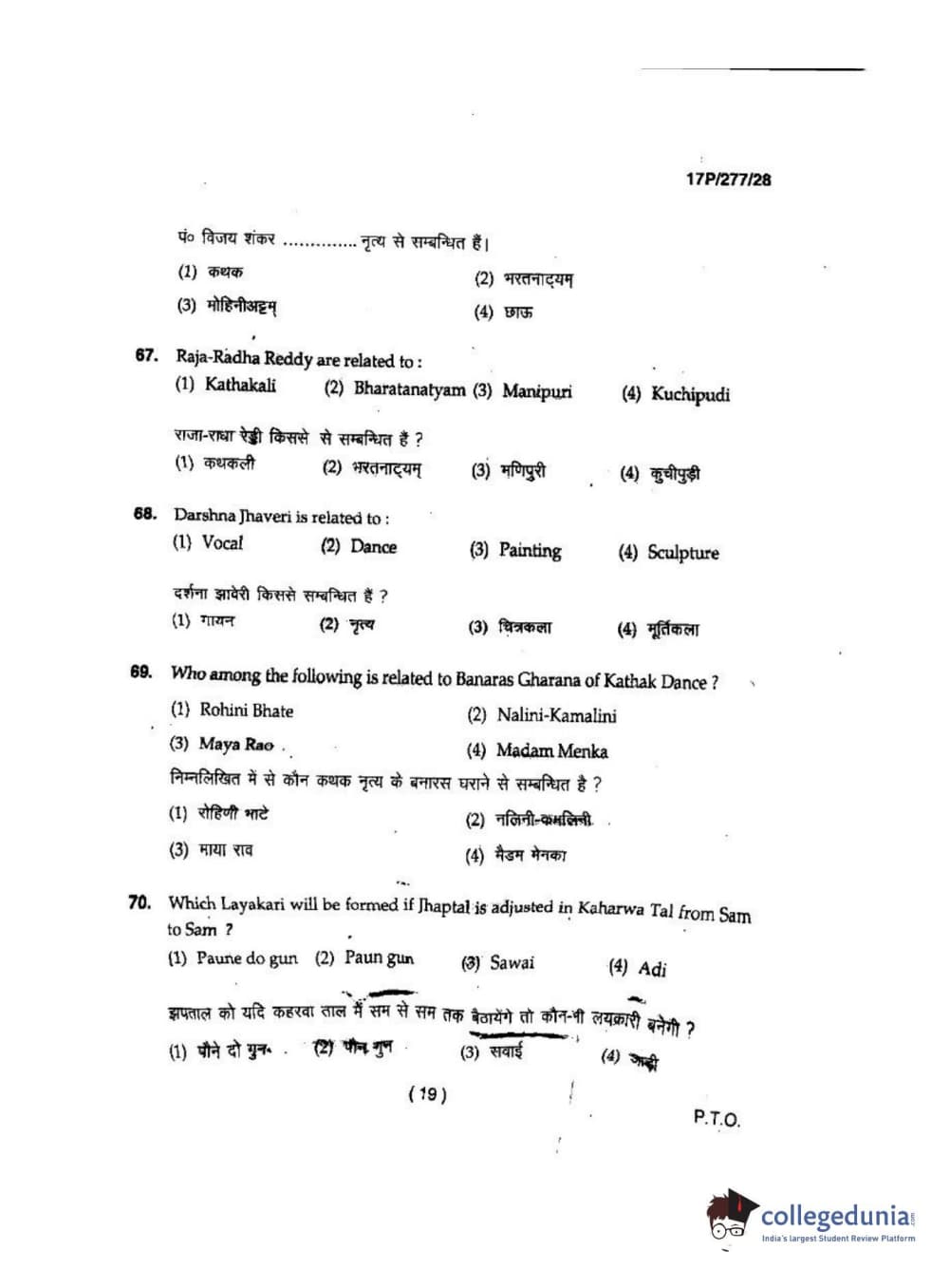 BHU PET 2017 M.P.A in Dance kathak Question Paper with Answer Key PDFs
