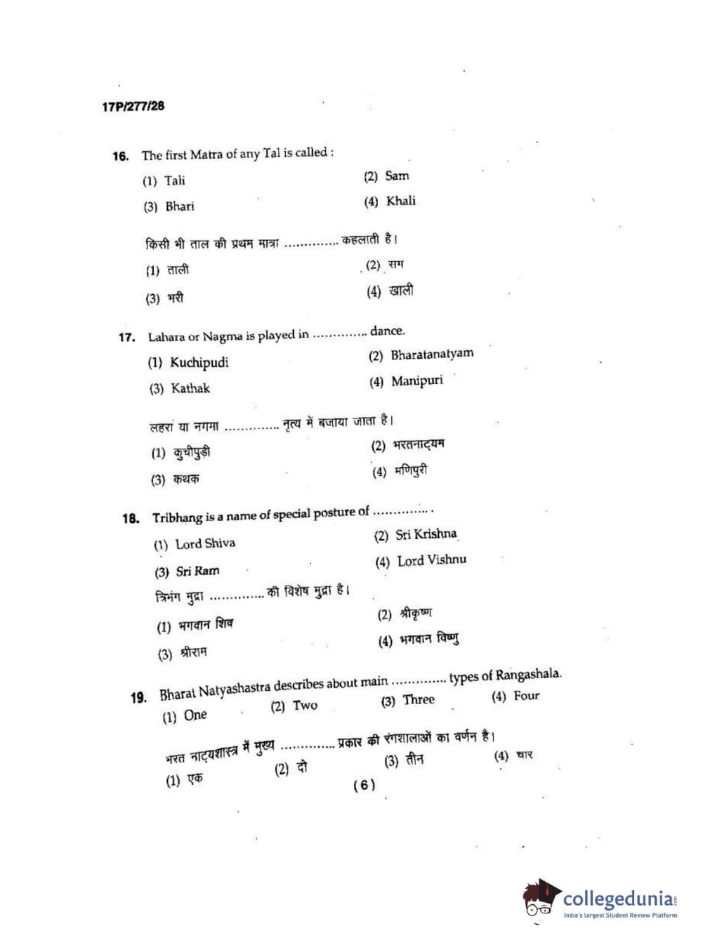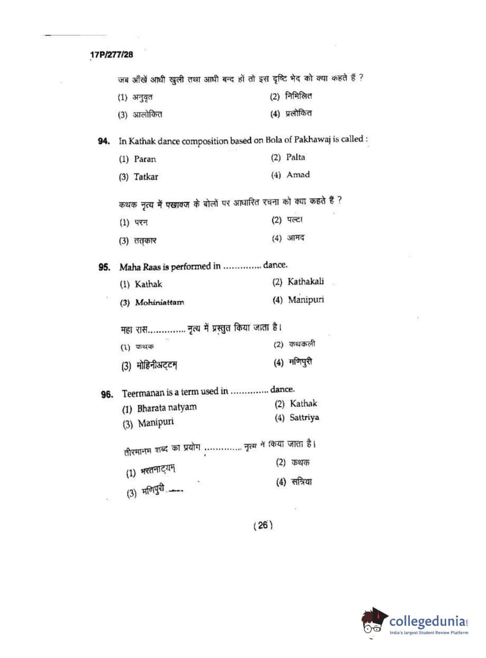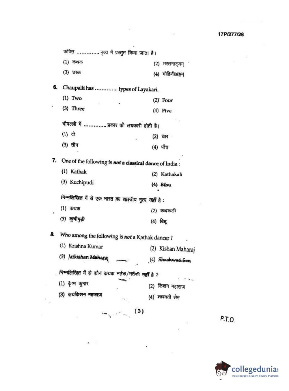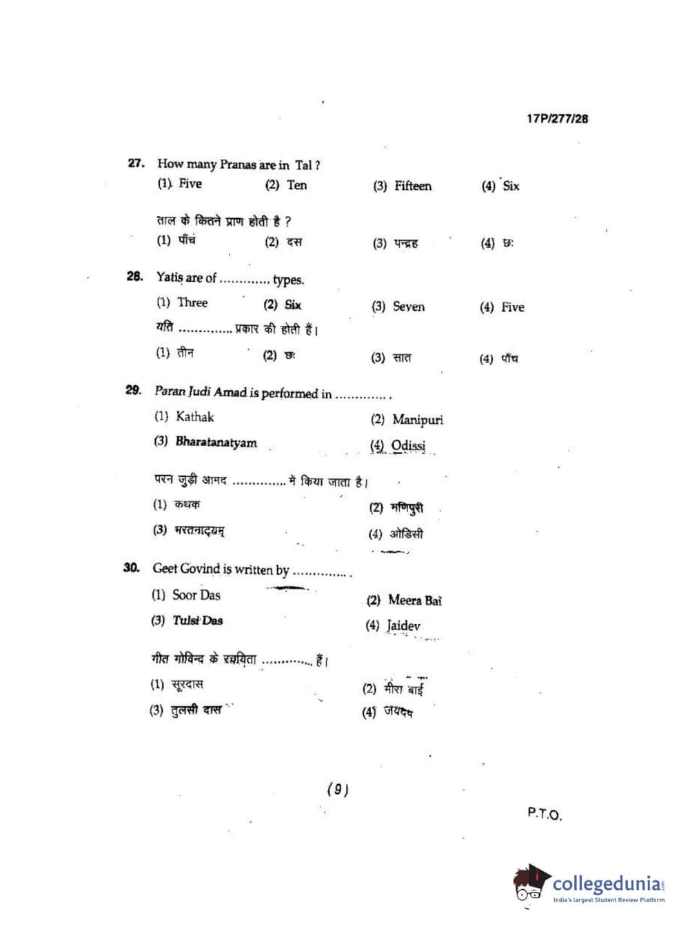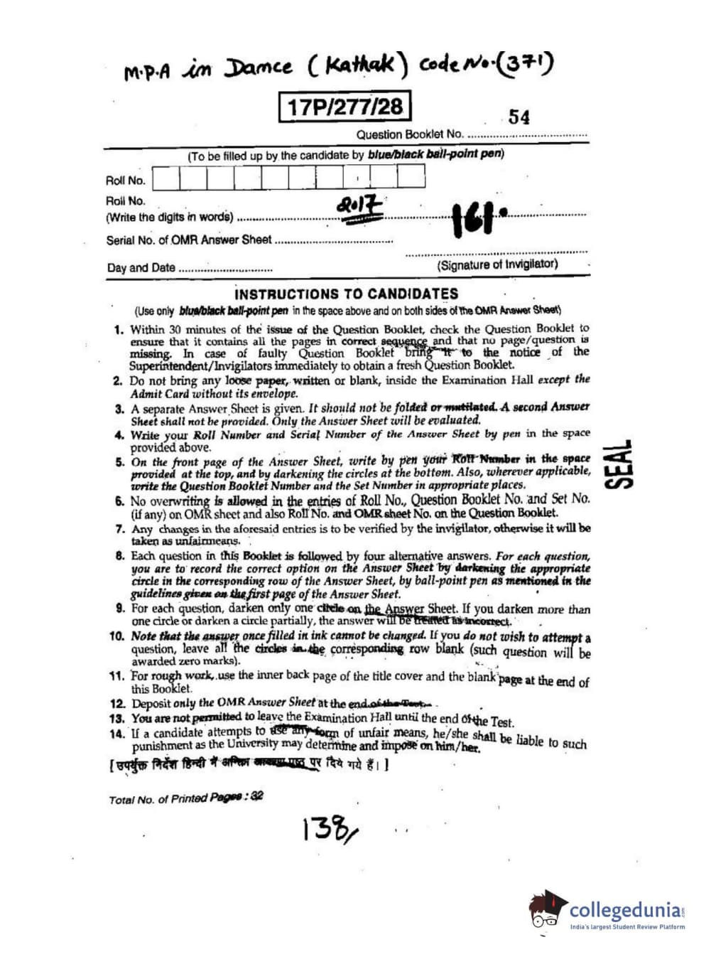 BHU PET 2017 M.P.A in Dance kathak Question Paper with Answer Key PDFs
