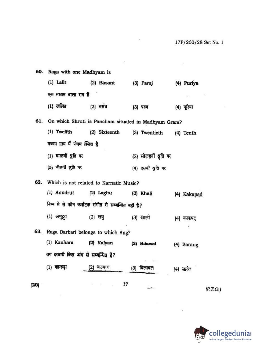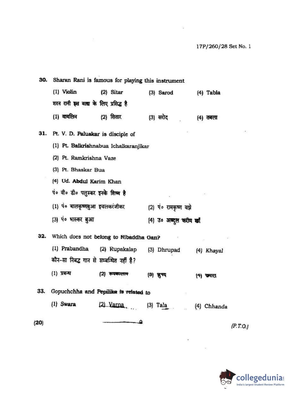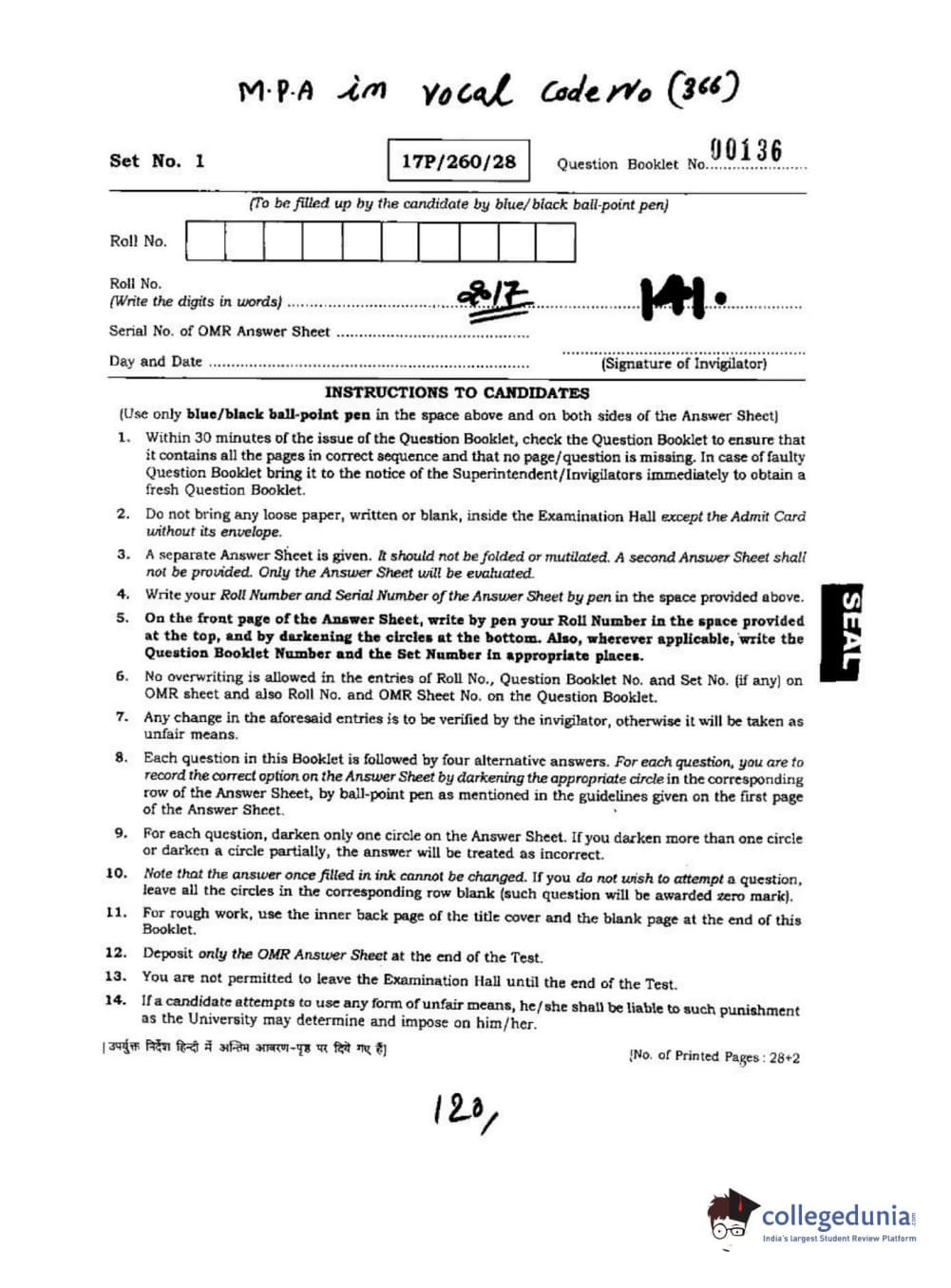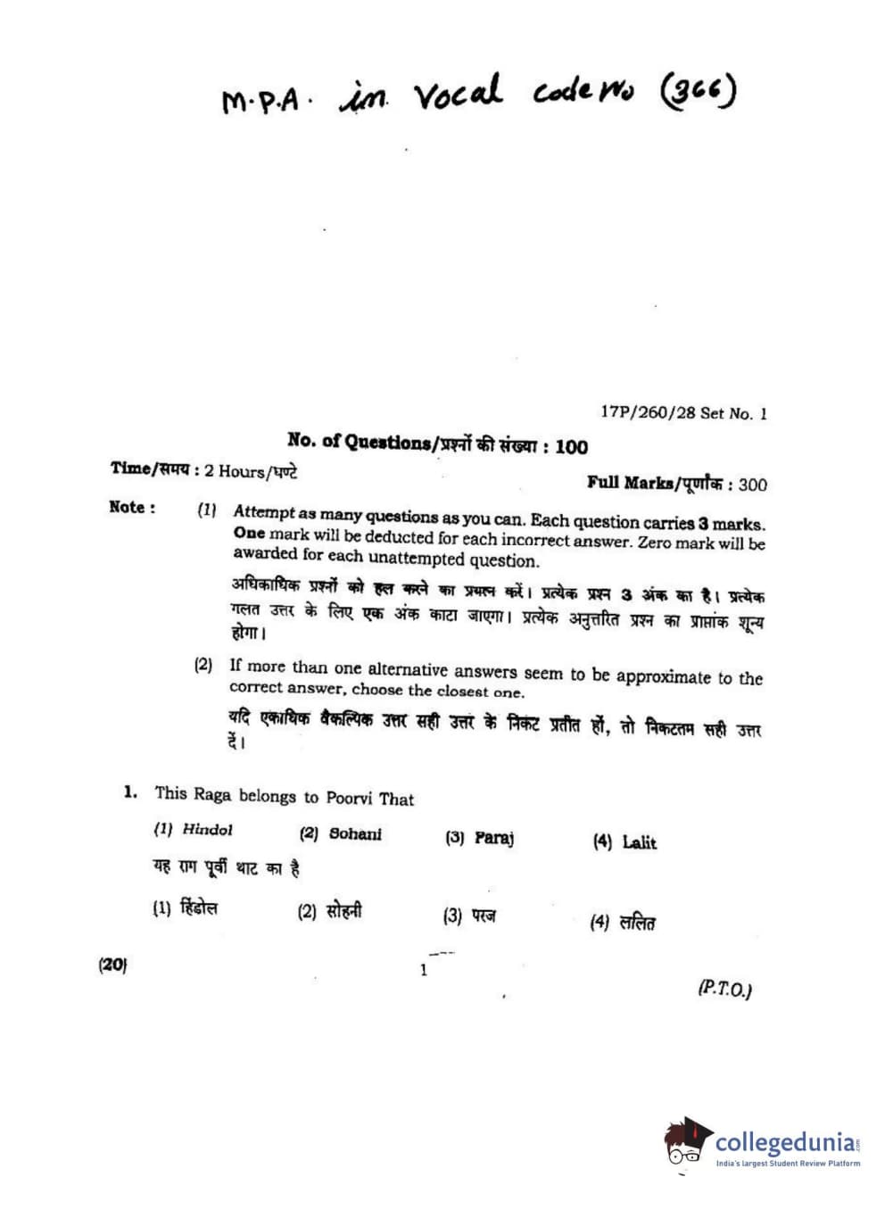 BHU PET 2017 M.P.A in Vocal Question paper with answer key pdf is available for download. The exam was successfully organized by Banaras Hindu University (BHU). The question paper comprised a total of 100 questions.