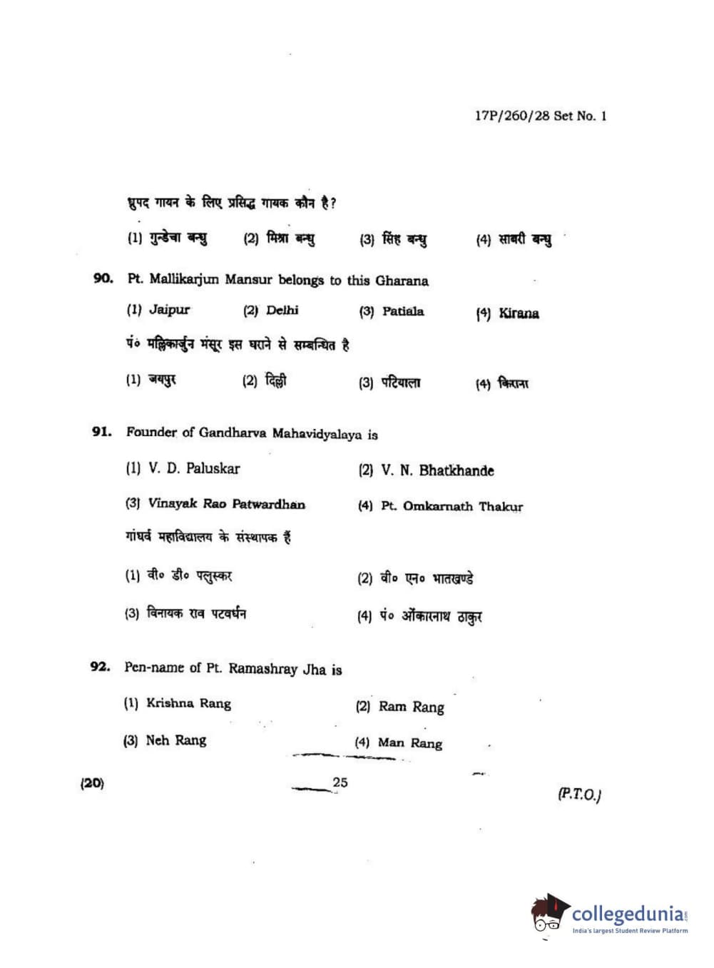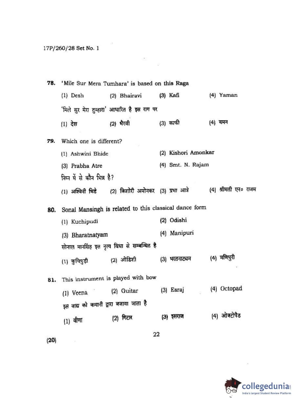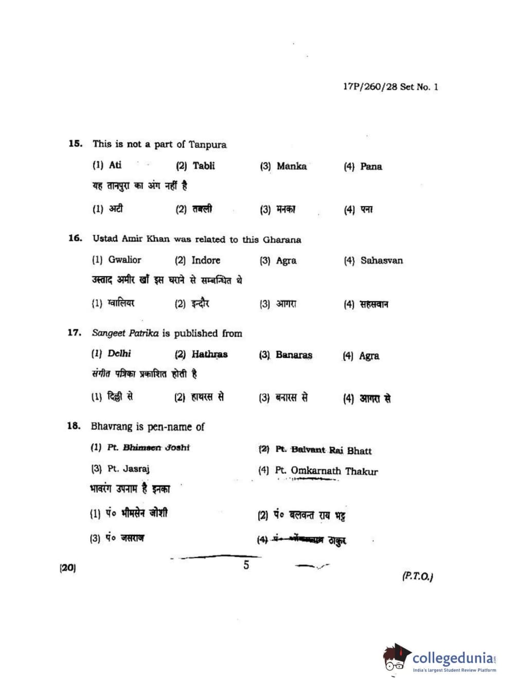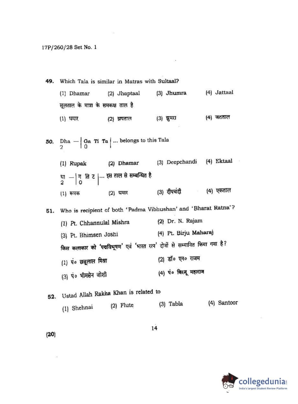 BHU PET 2017 M.P.A in Vocal Question paper with answer key pdf is available for download. The exam was successfully organized by Banaras Hindu University (BHU). The question paper comprised a total of 100 questions.