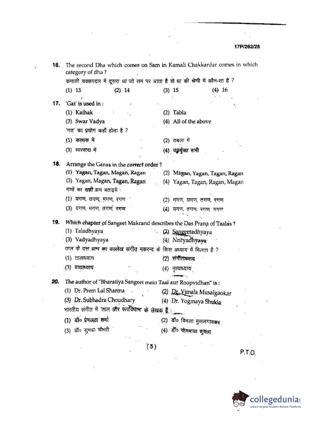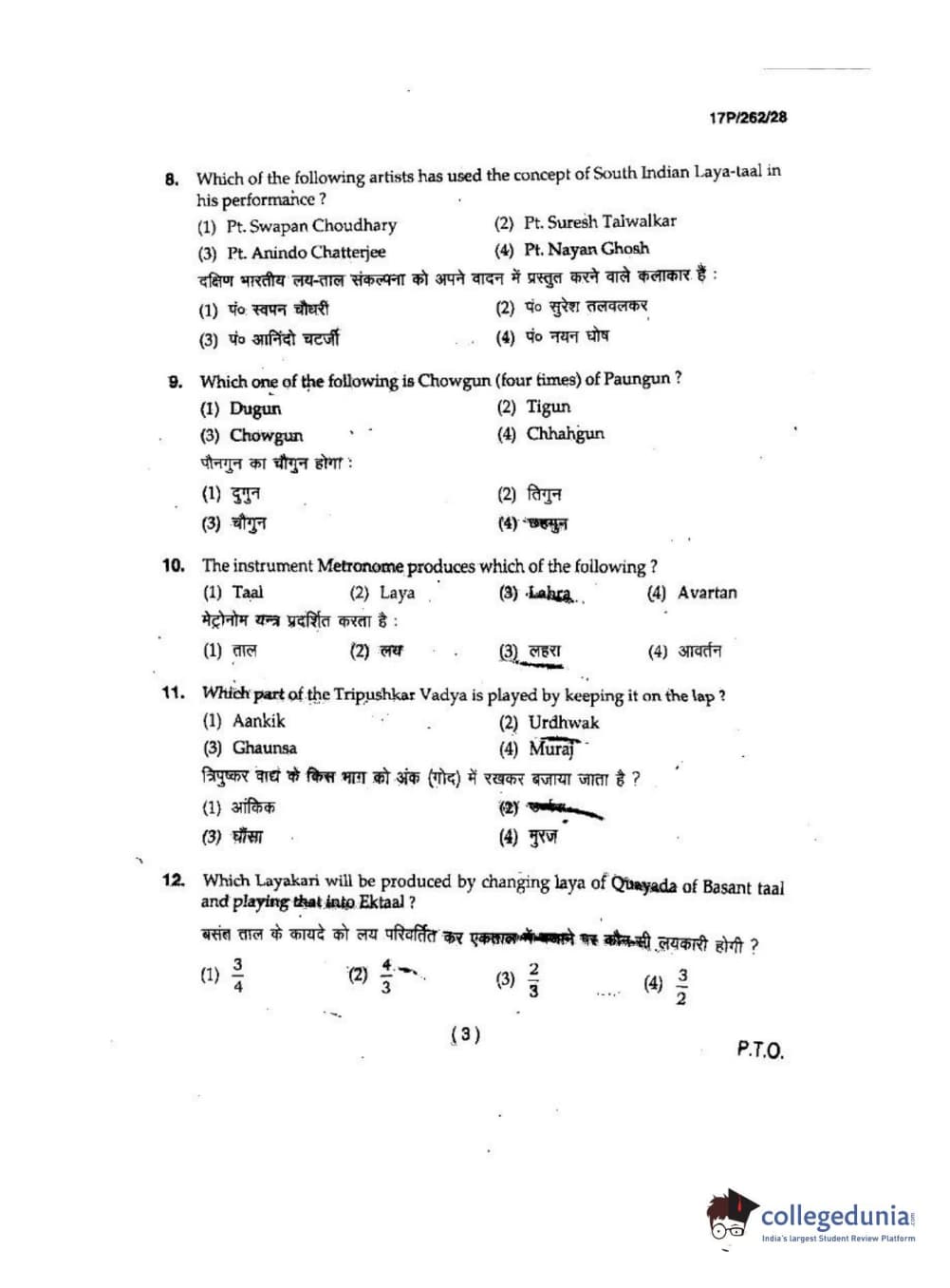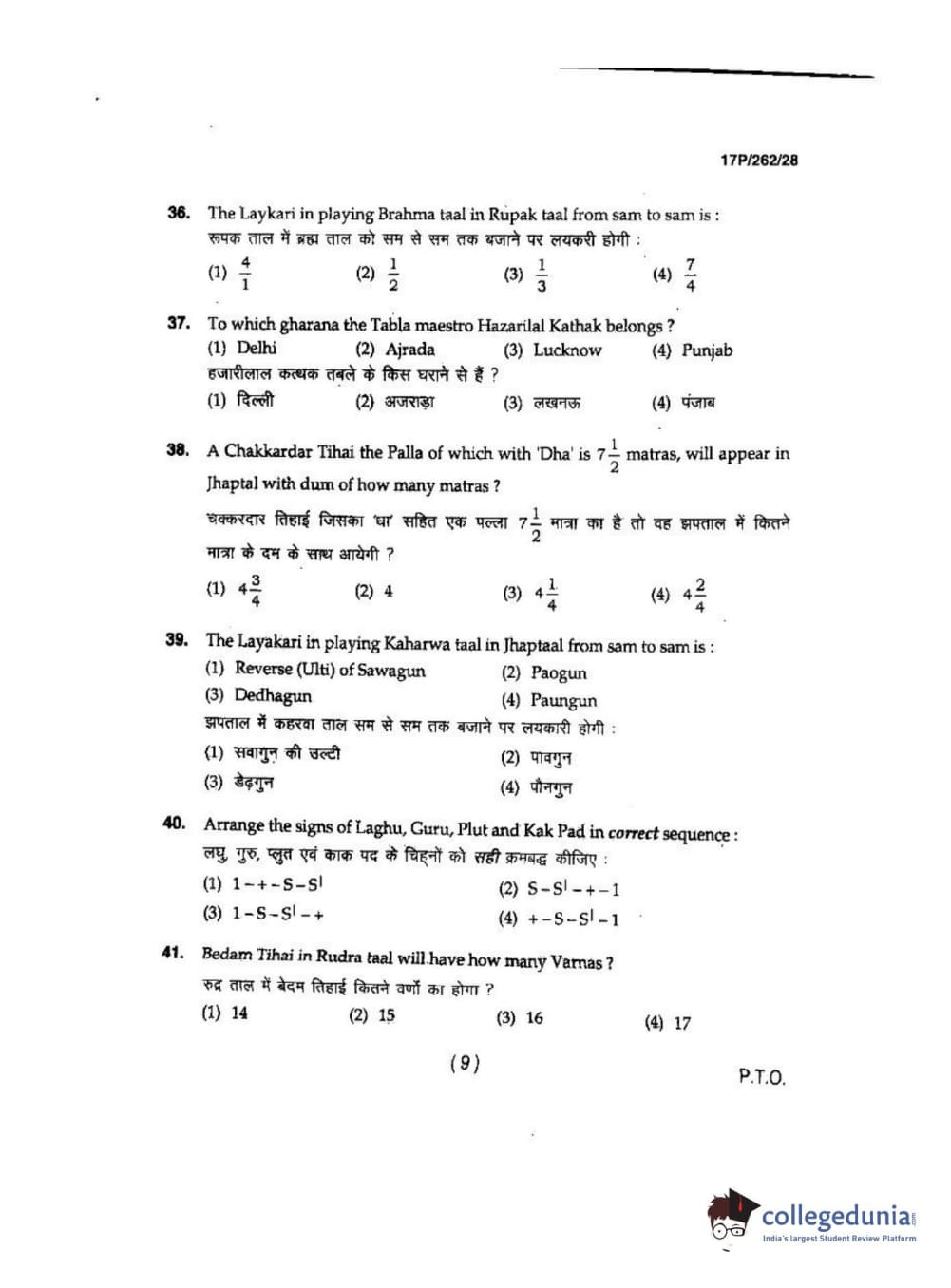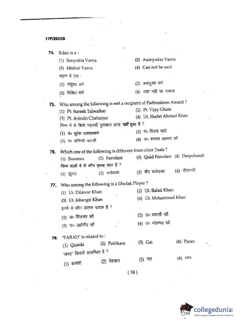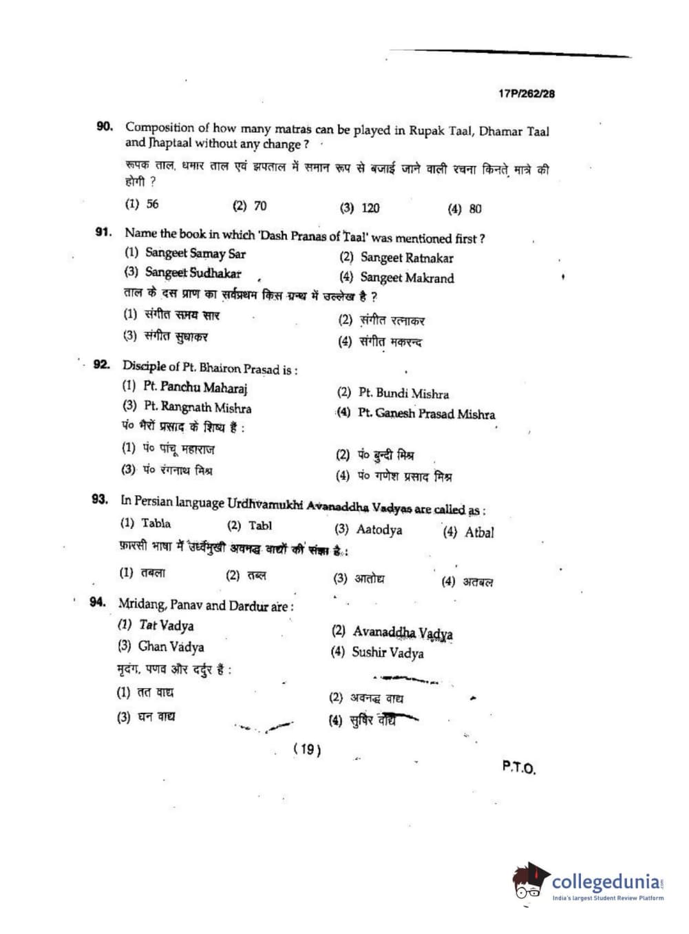 BHU PET 2017 M.P.A. Tabla Question Paper with Answer Key PDFs