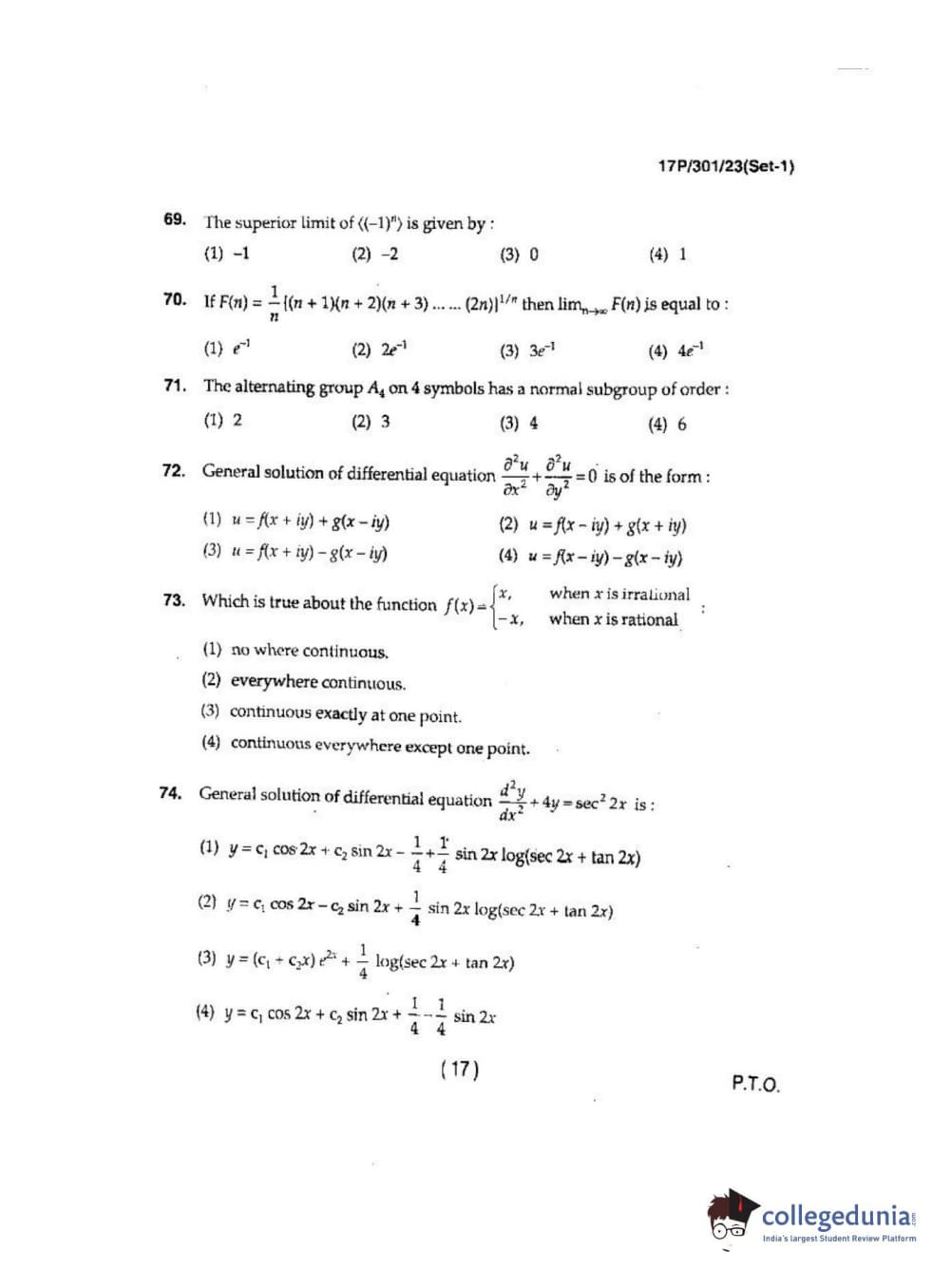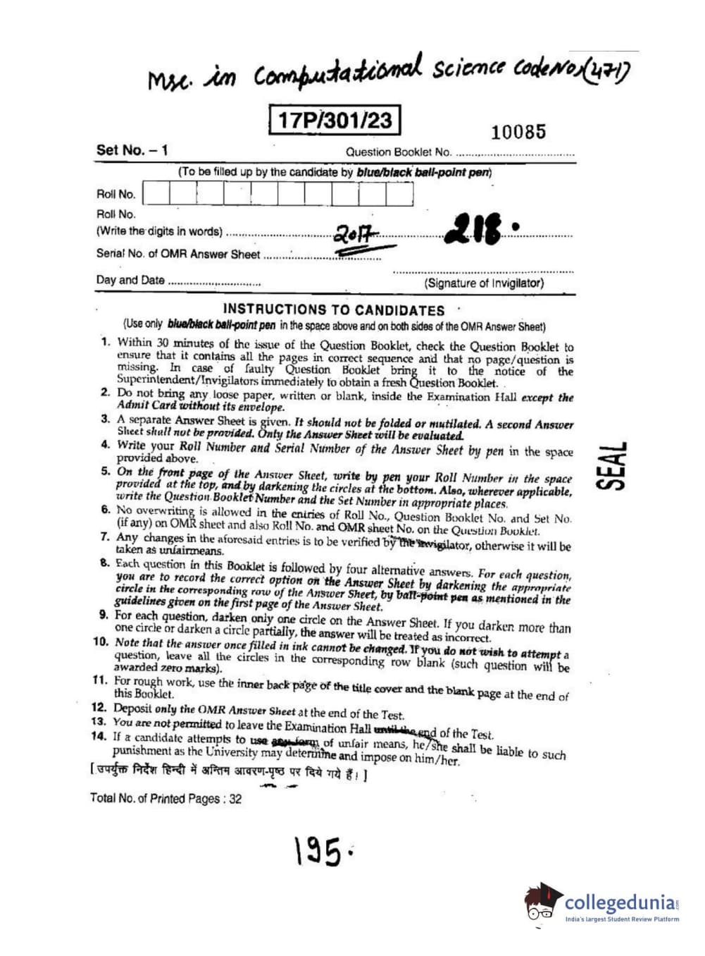 BHU PET 2017 M.Sc. In Computational Science Question Paper with Answer Key PDFs
