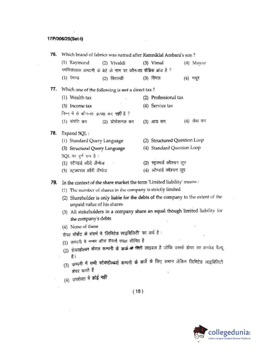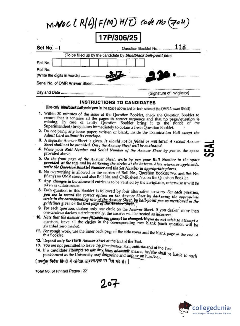 BHU PET 2017 M.Voc Question Paper with Answer Key PDFs
