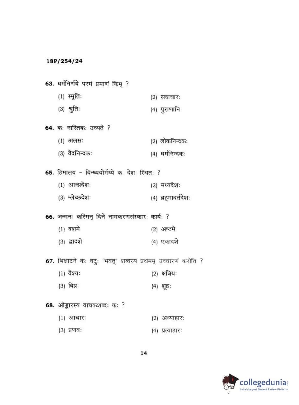 BHU PET 2018 Acharya Dharmagam Question Paper with Answer Key PDF in Hindi