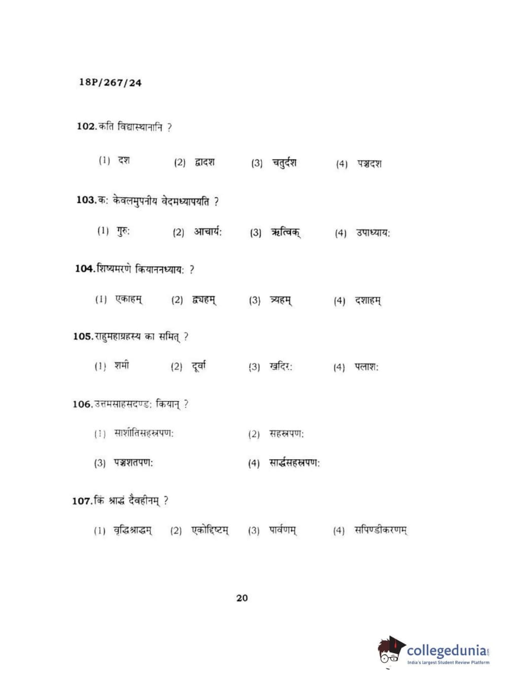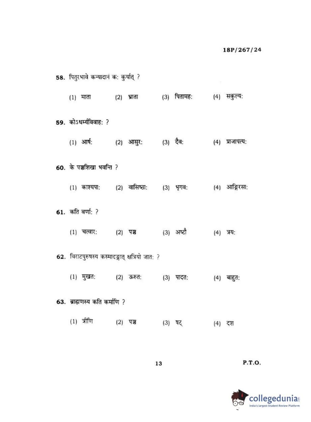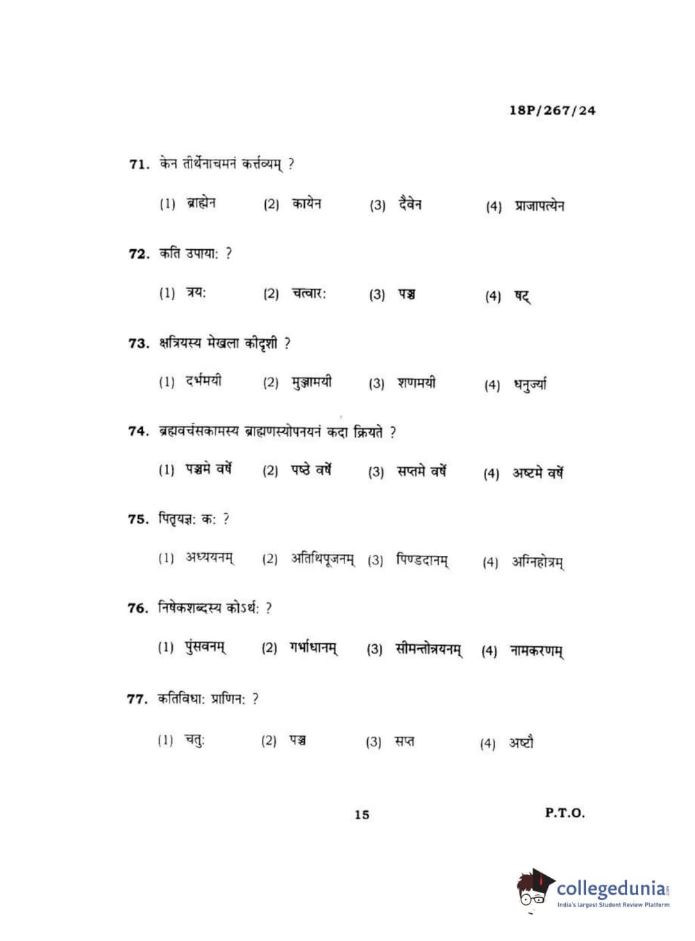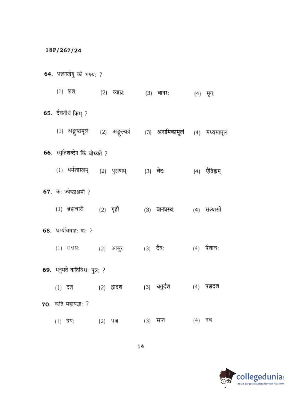 BHU PET 2018 Acharya in Dharmashastra Question Paper with Answer Key PDF in Hindi