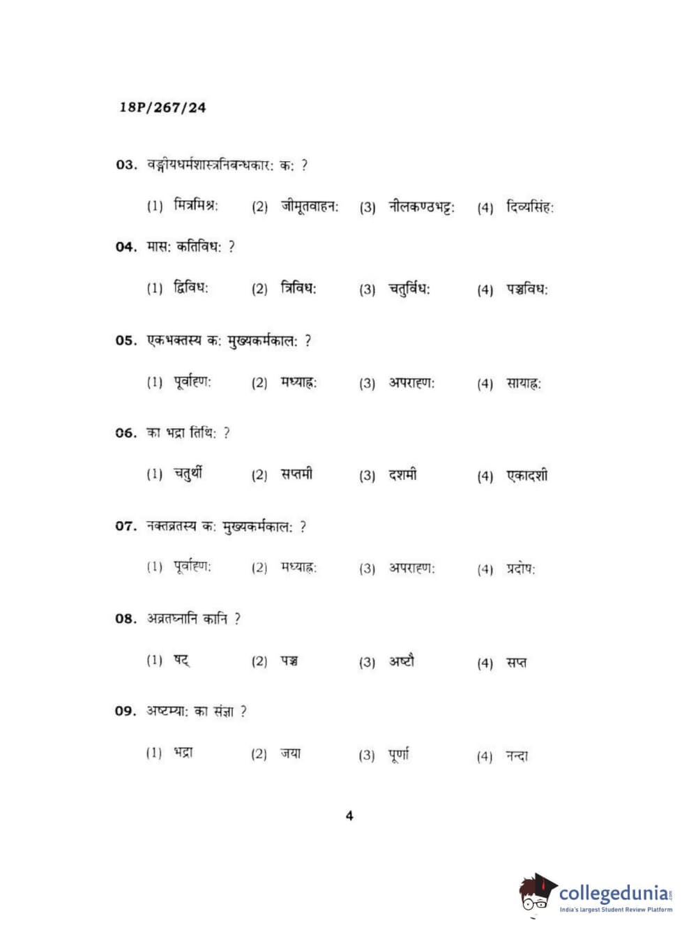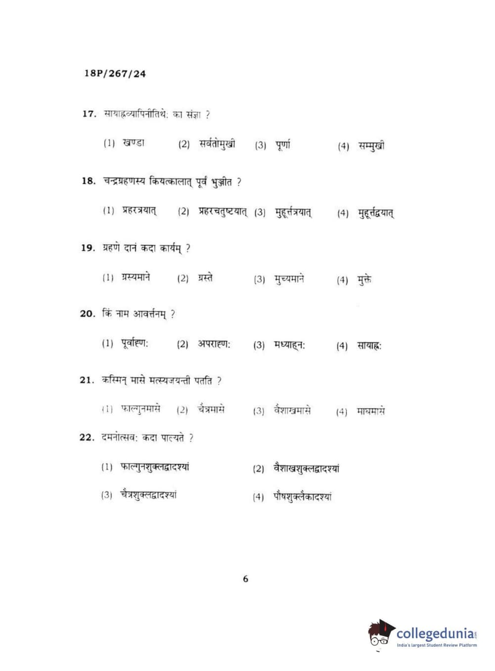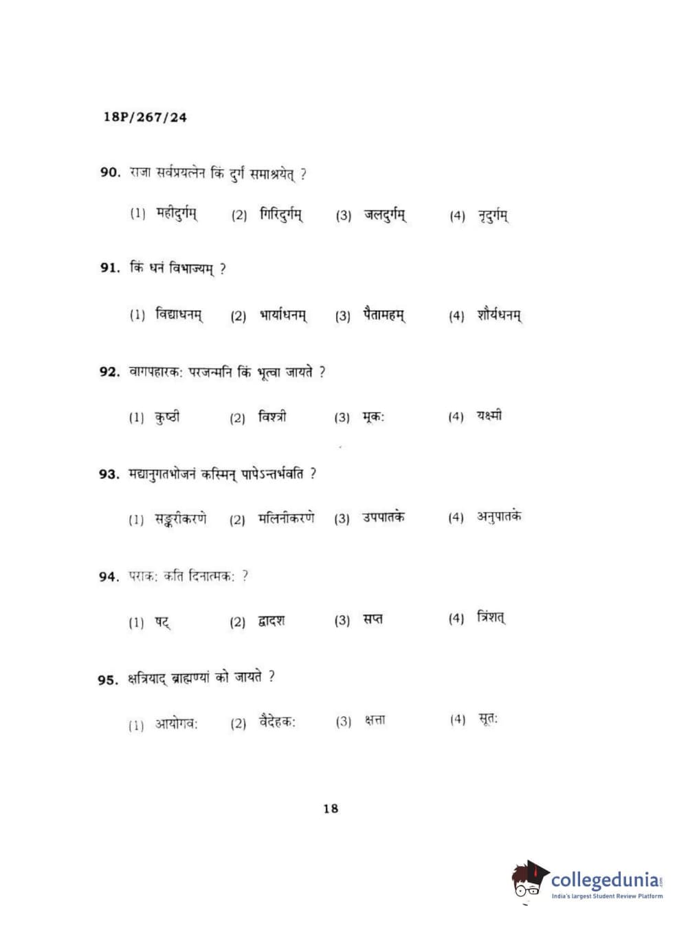 BHU PET 2018 Acharya in Dharmashastra Question Paper with Answer Key PDF in Hindi