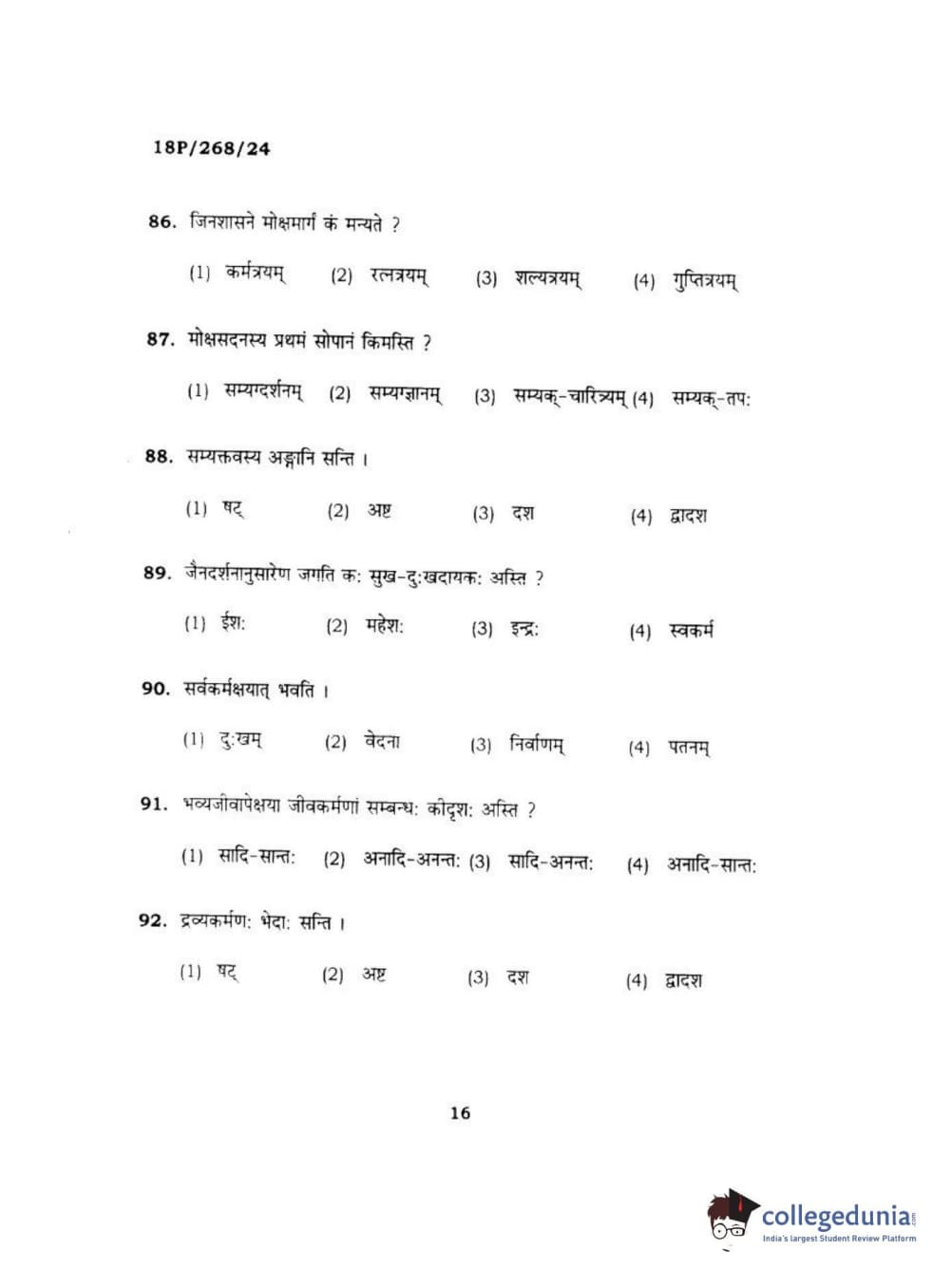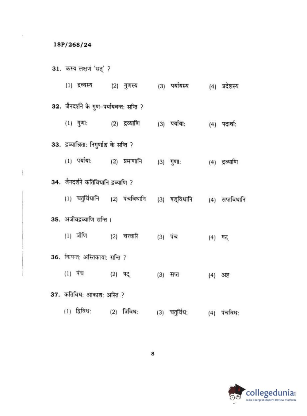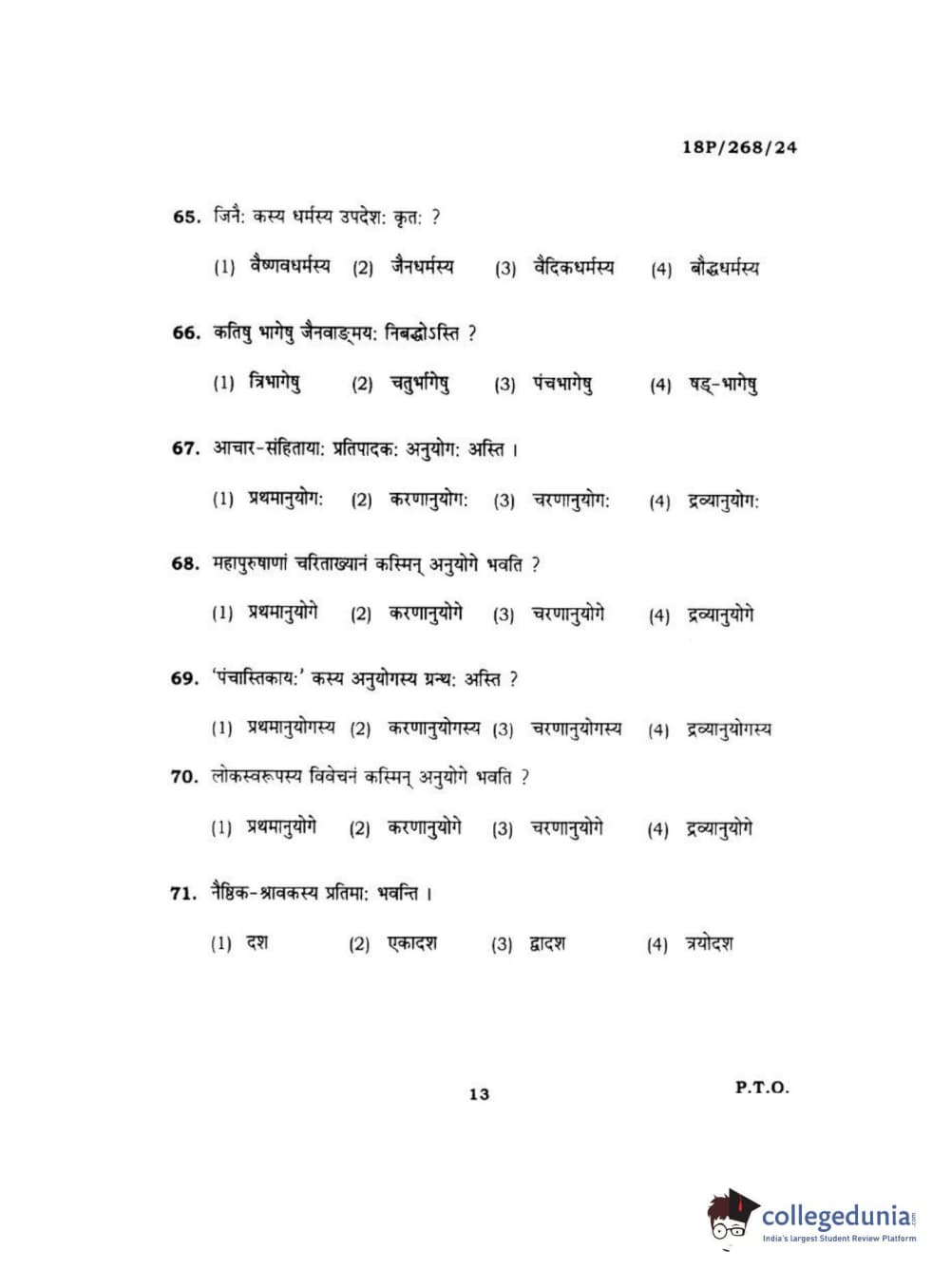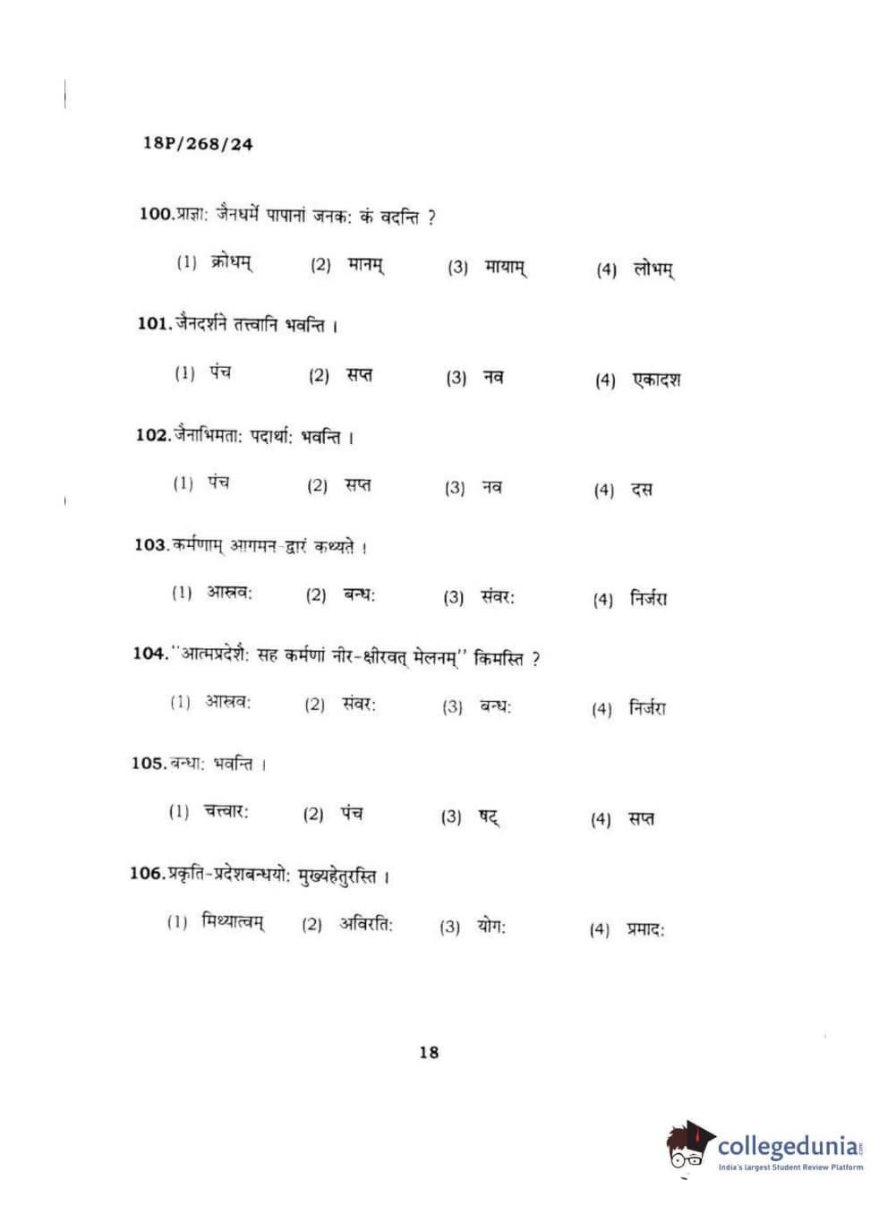BHU PET 2018 Acharya jain darshan Question Paper with Answer Key PDF in Hindi
