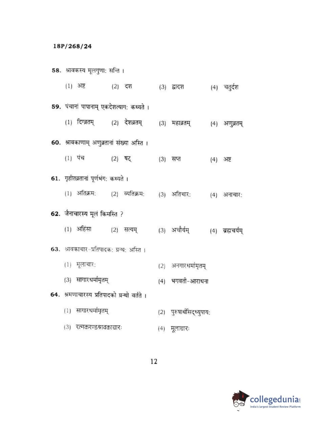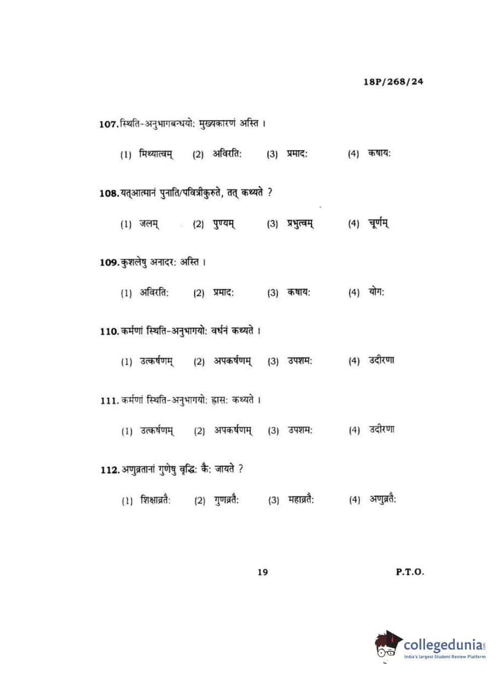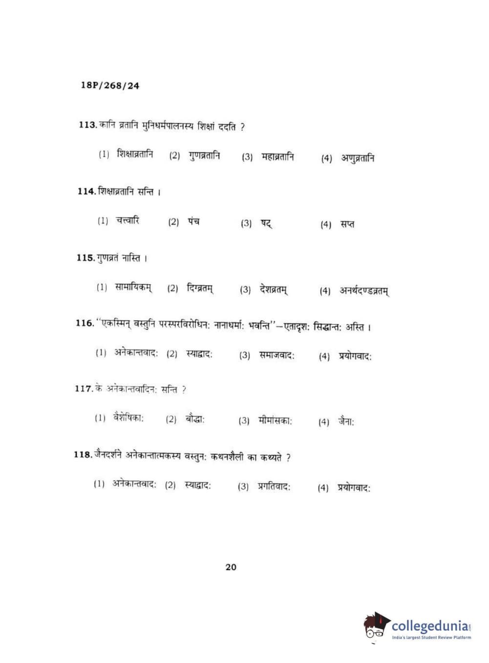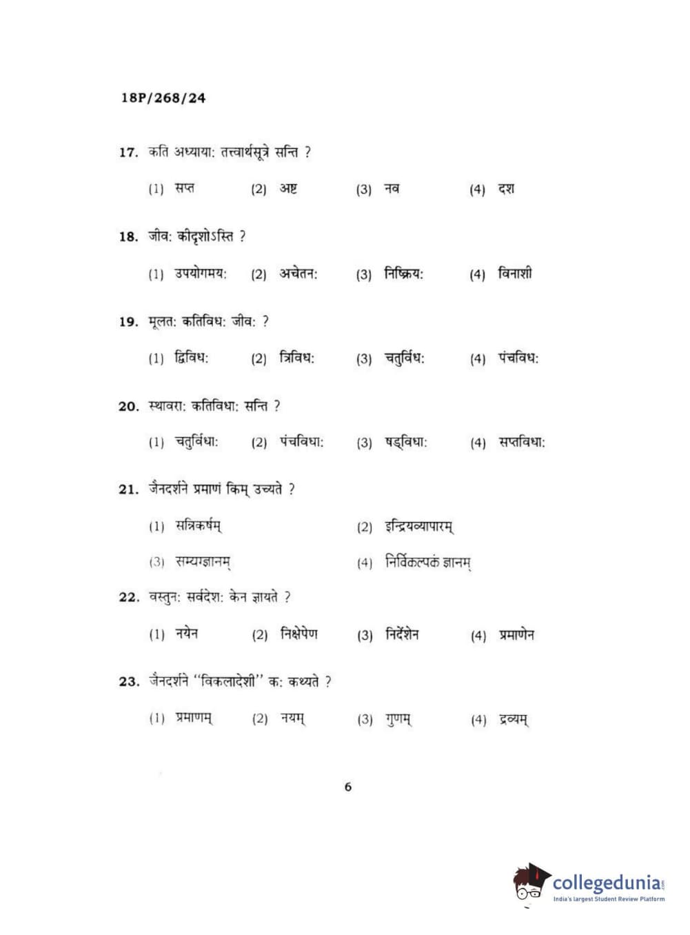 BHU PET 2018 Acharya jain darshan Question Paper with Answer Key PDF in Hindi