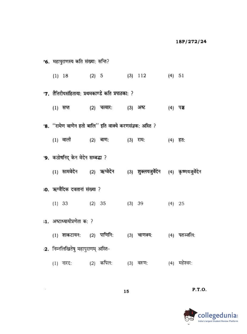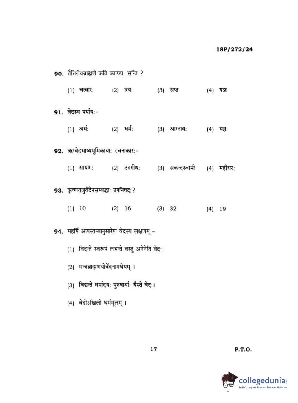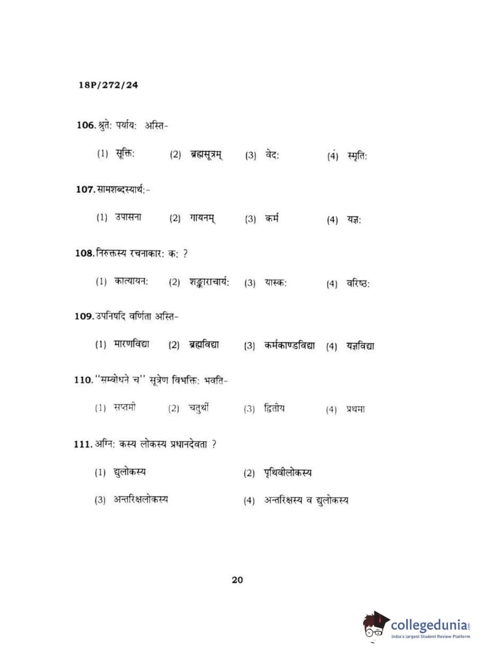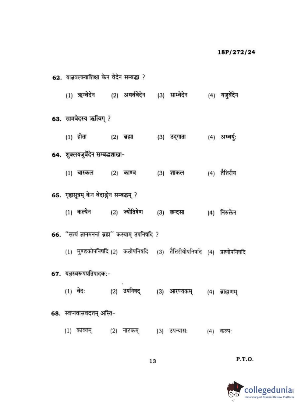BHU PET 2018 Acharya krishna yajurveda Question Paper with Answer Key PDF in Hindi