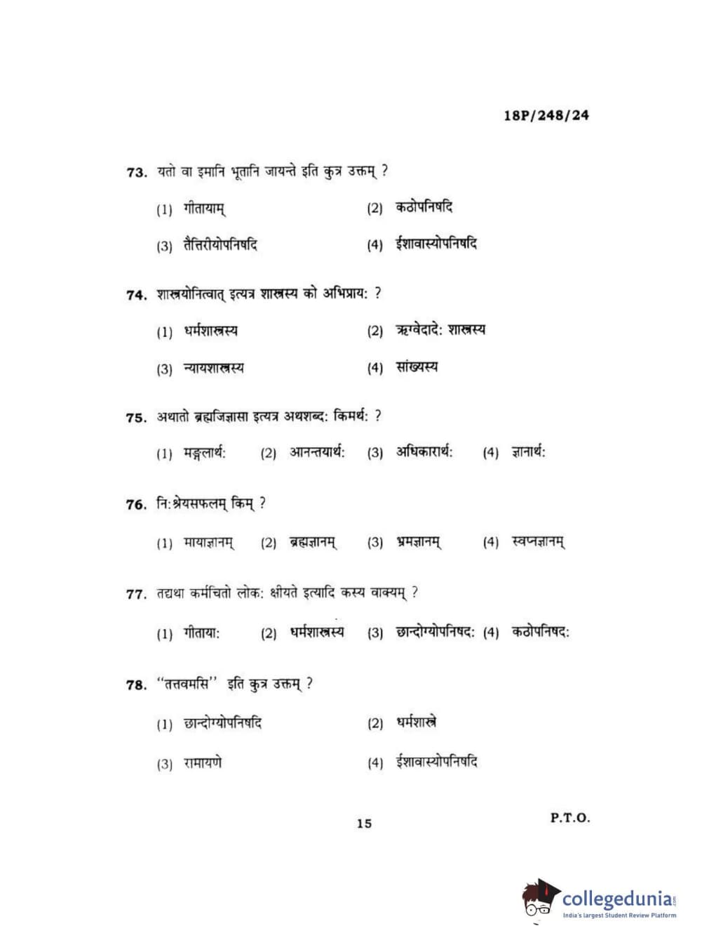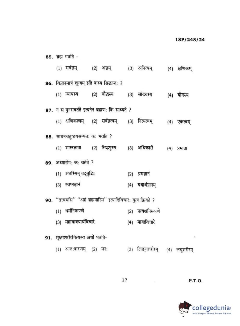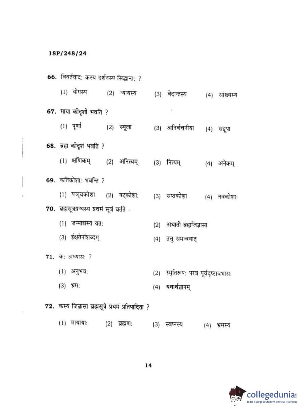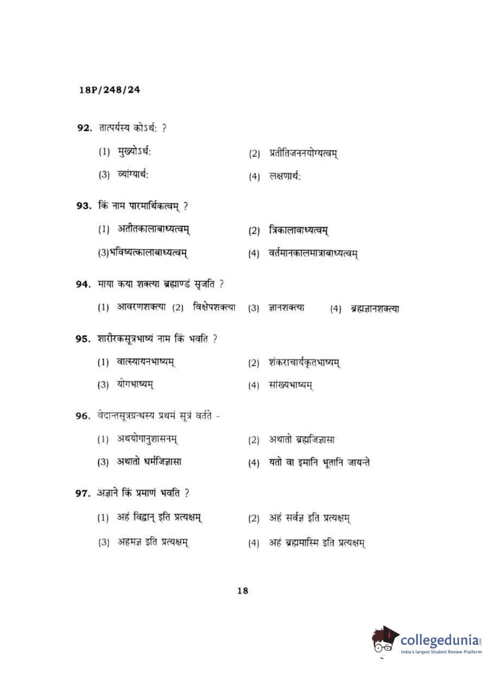 BHU PET 2018 ACHARYA VEDANTA Question Paper with Answer Key PDF in Hindi