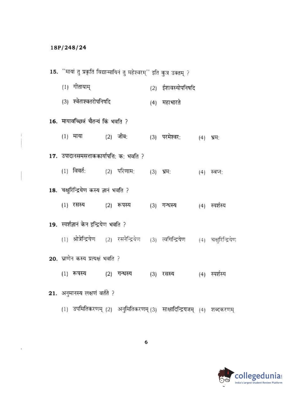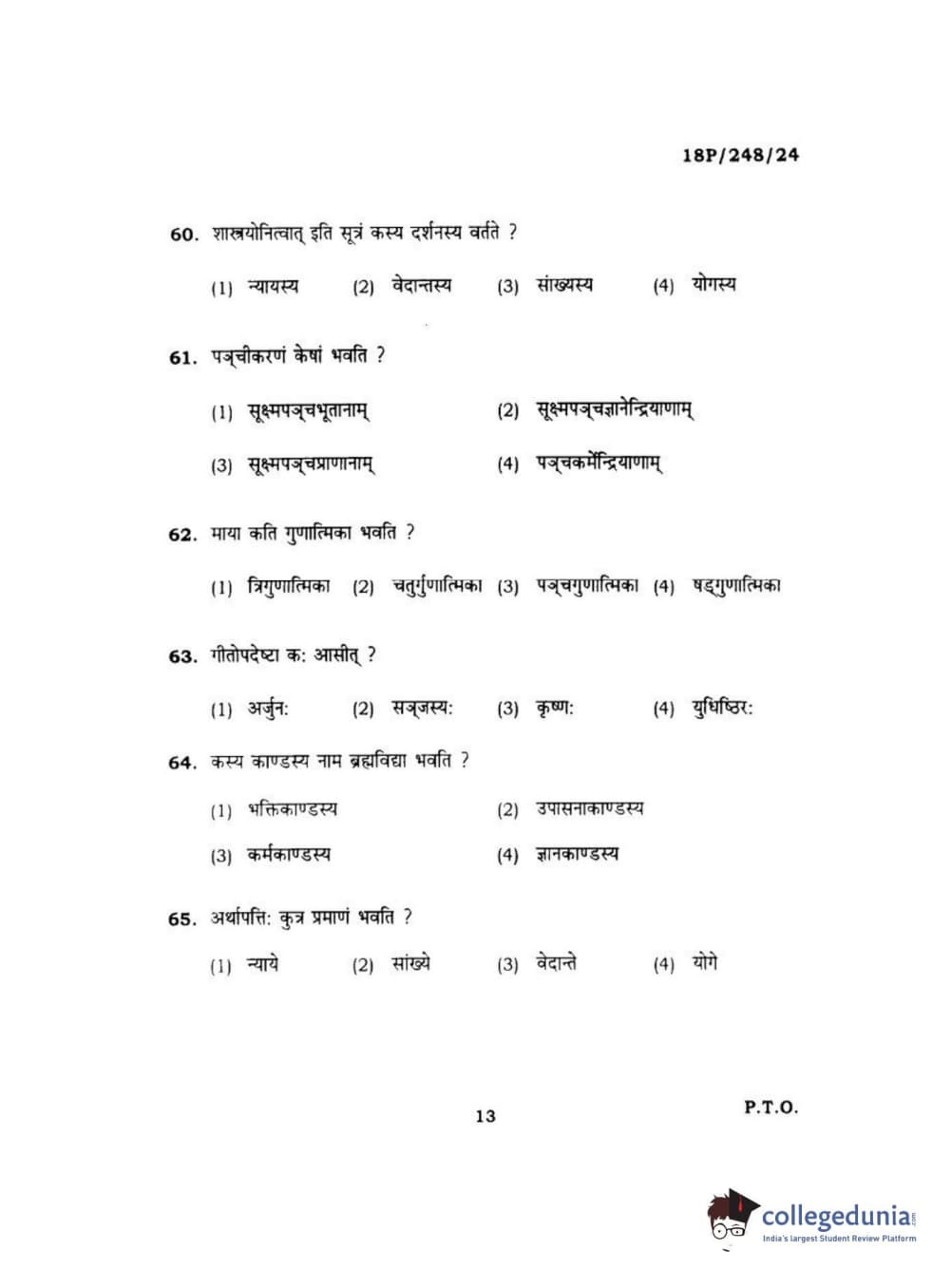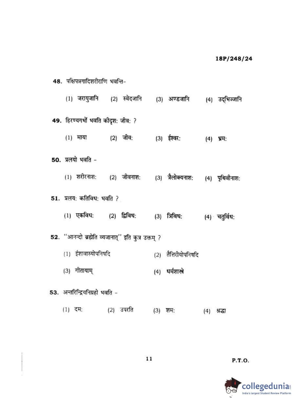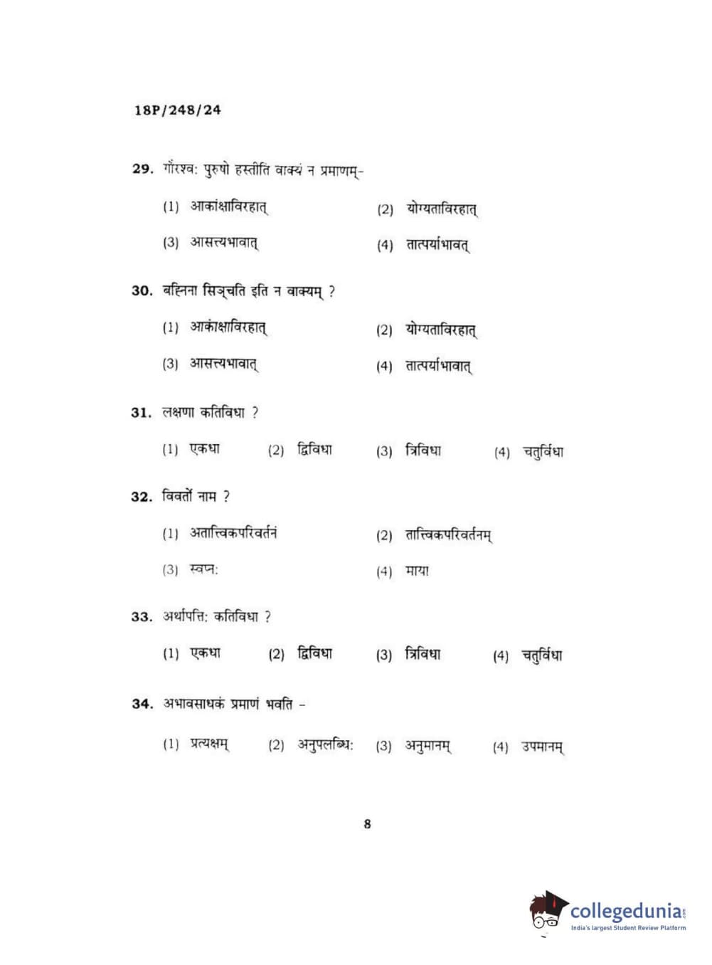 BHU PET 2018 ACHARYA VEDANTA Question Paper with Answer Key PDF in Hindi