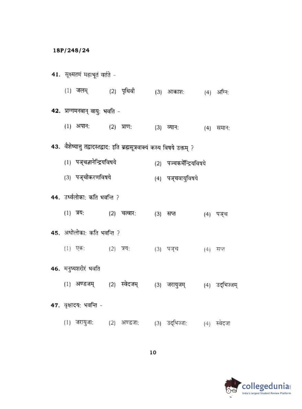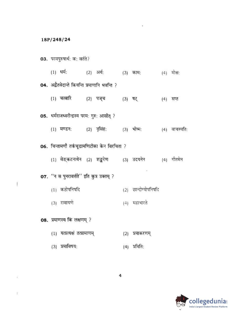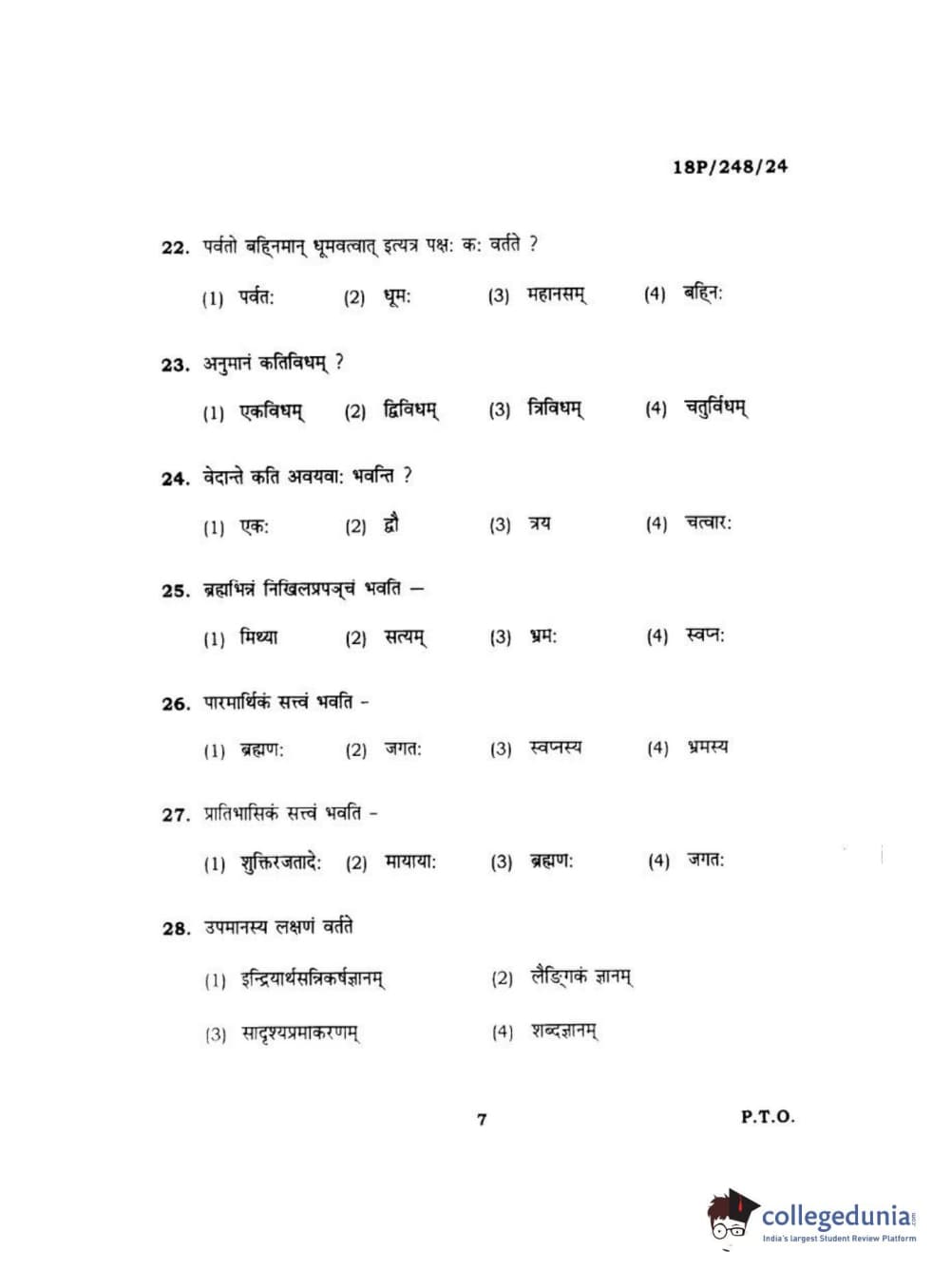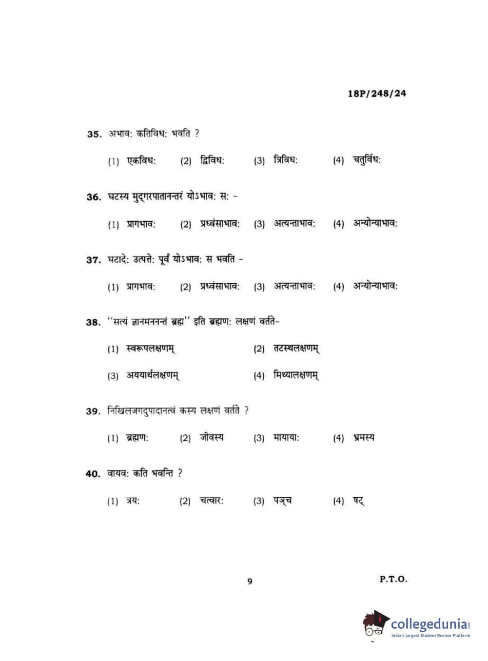 BHU PET 2018 ACHARYA VEDANTA Question Paper with Answer Key PDF in Hindi