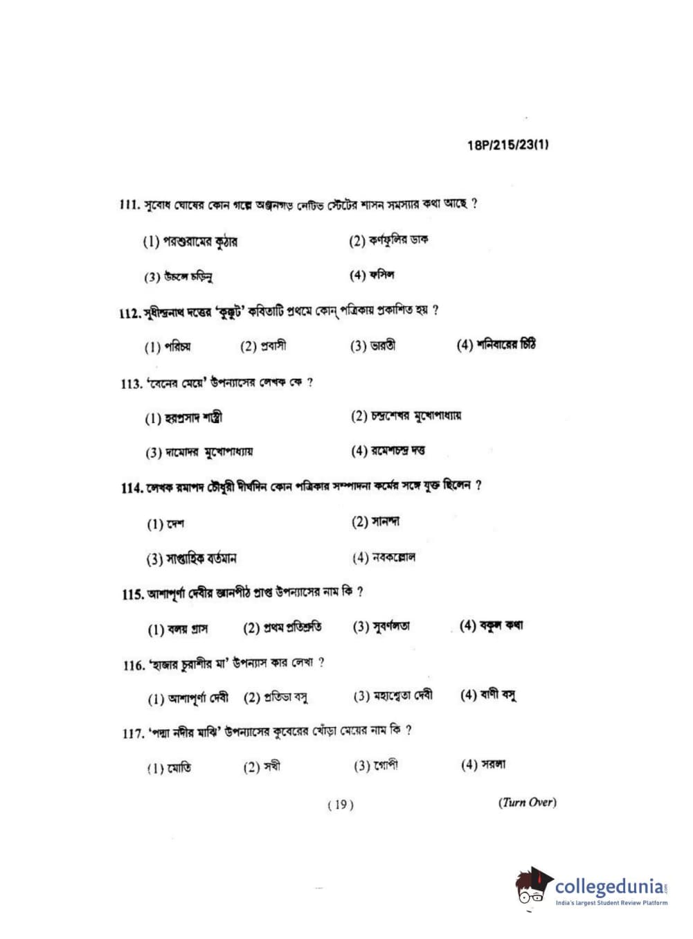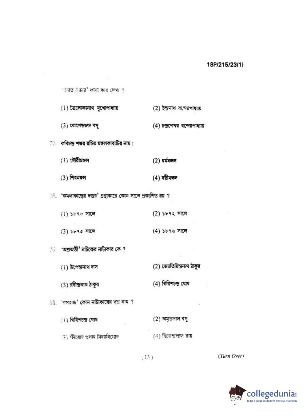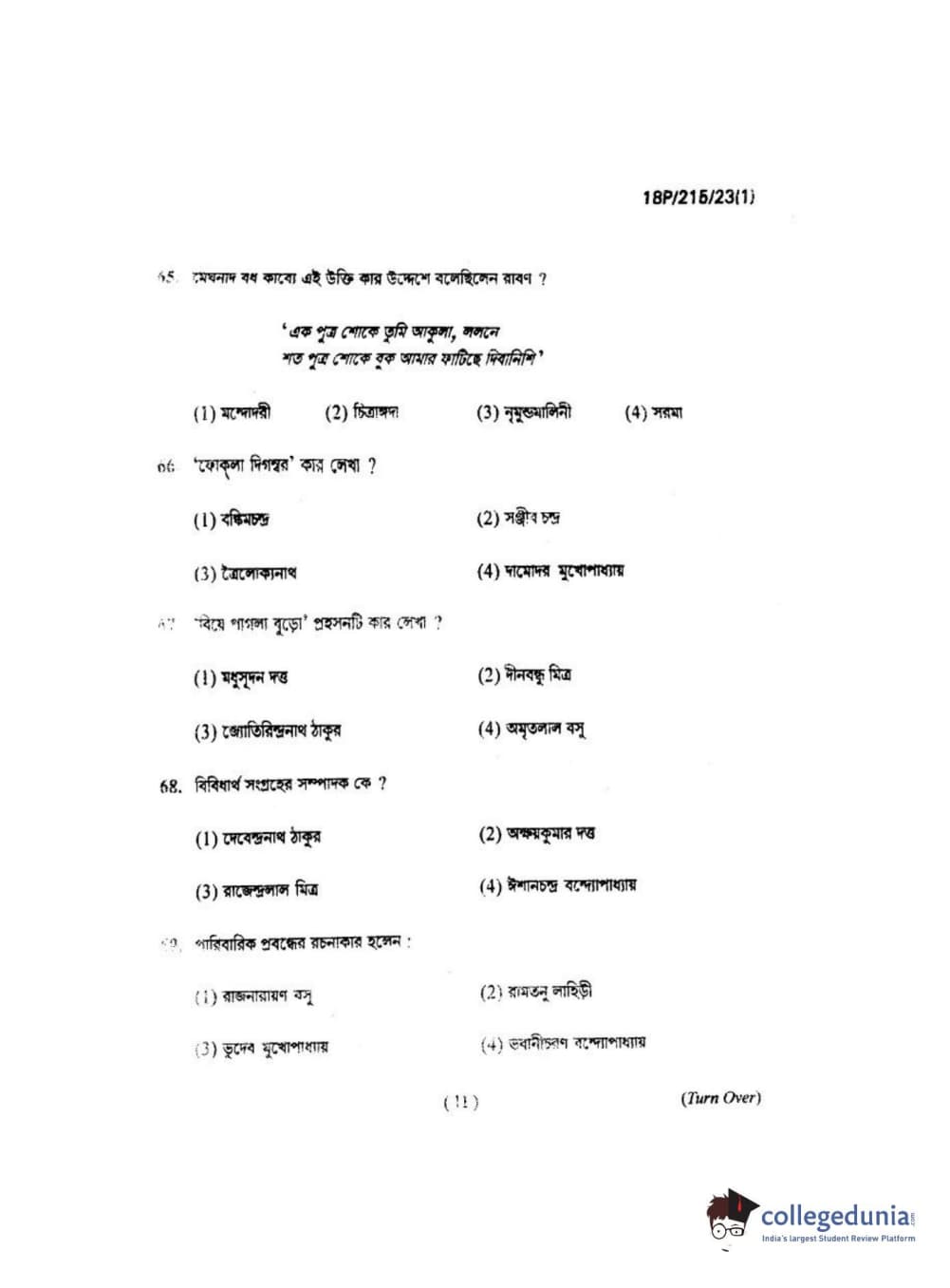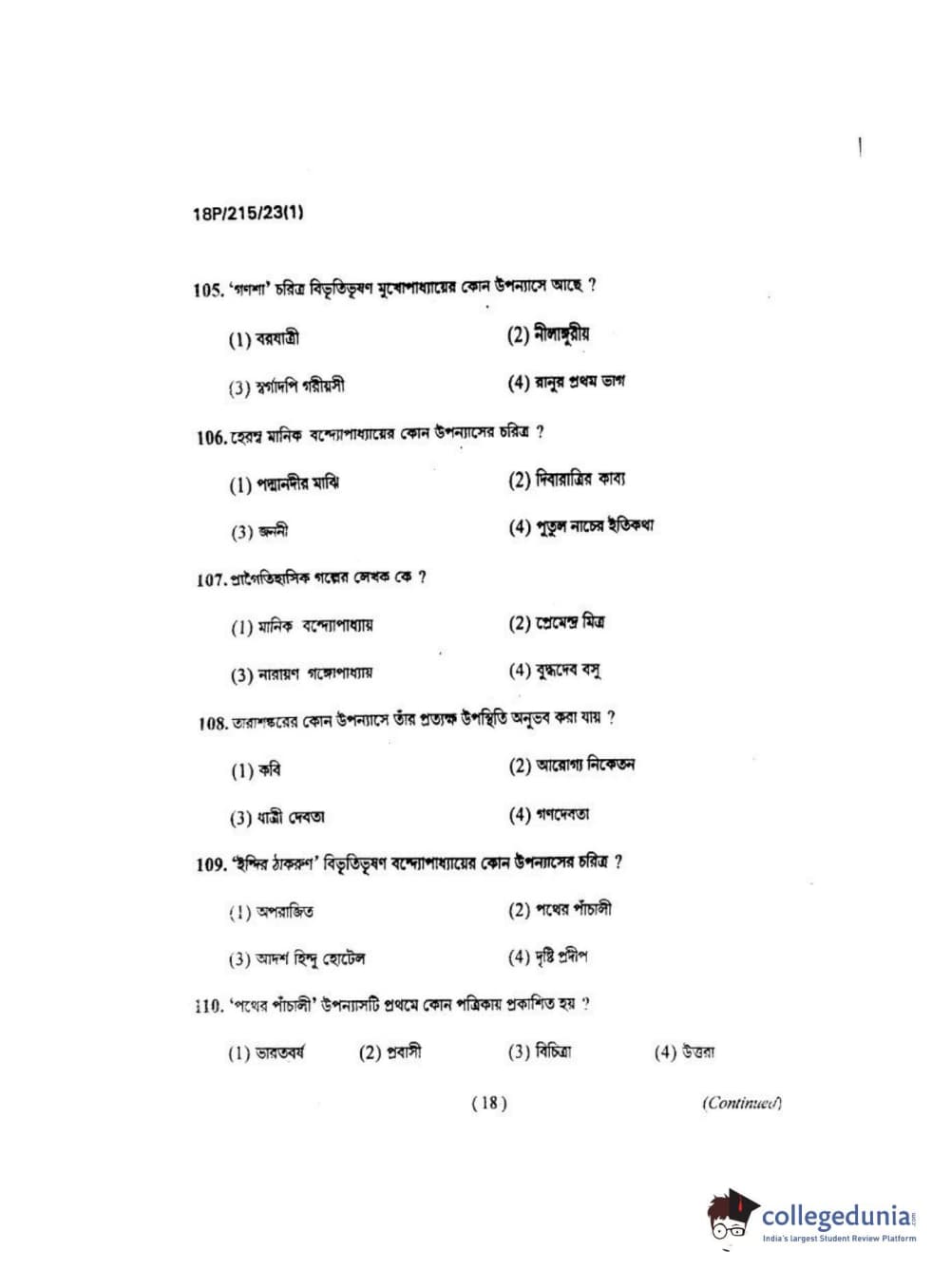 BHU PET 2018 MA BENGALI Question Paper with Answer Key PDF