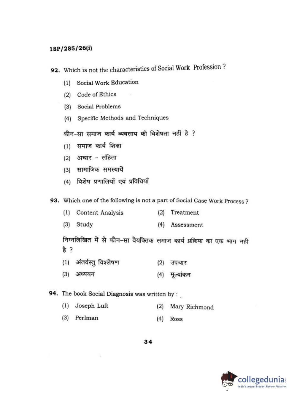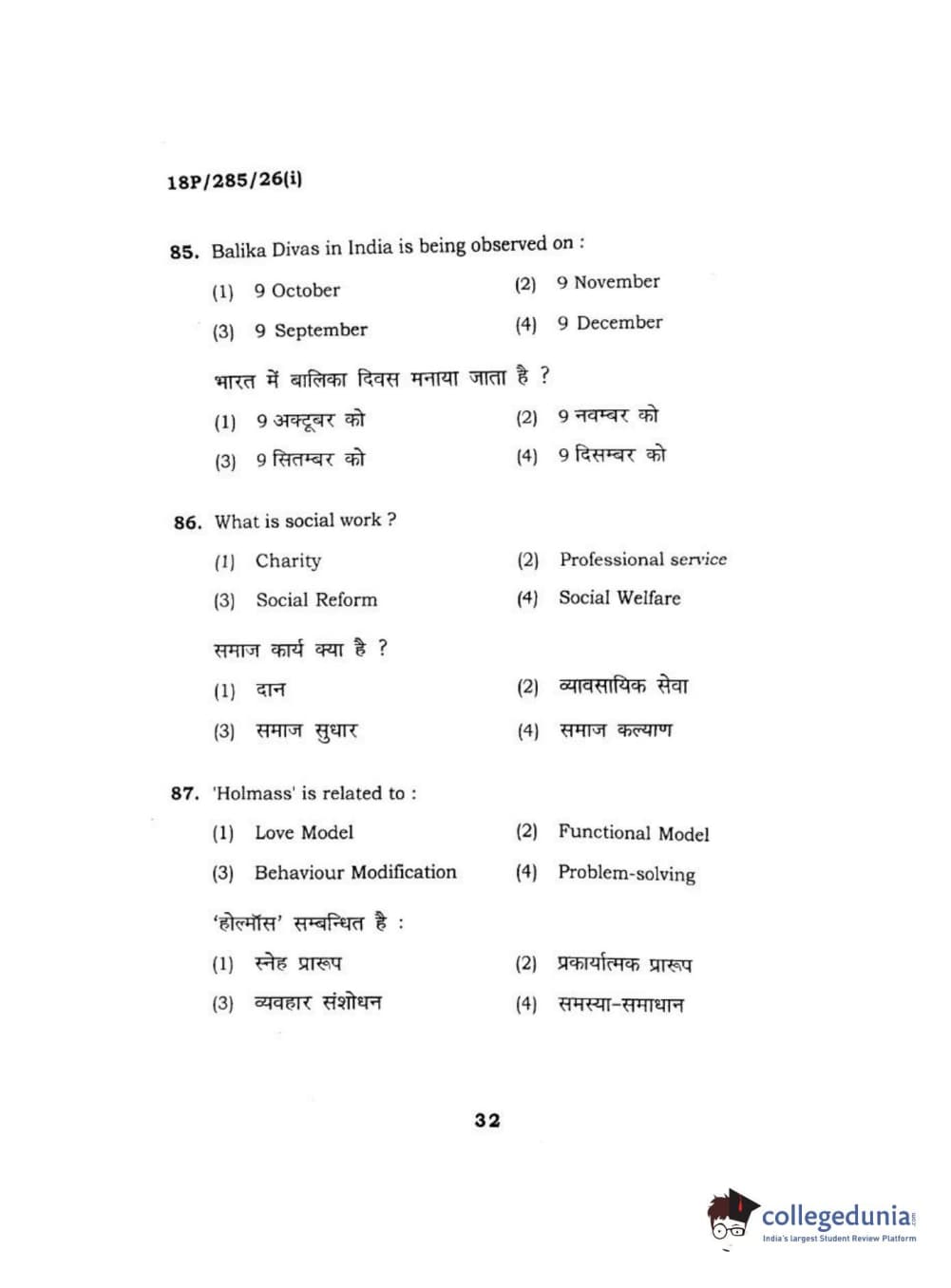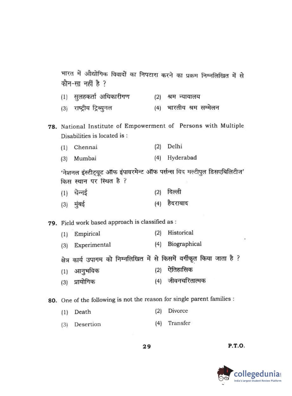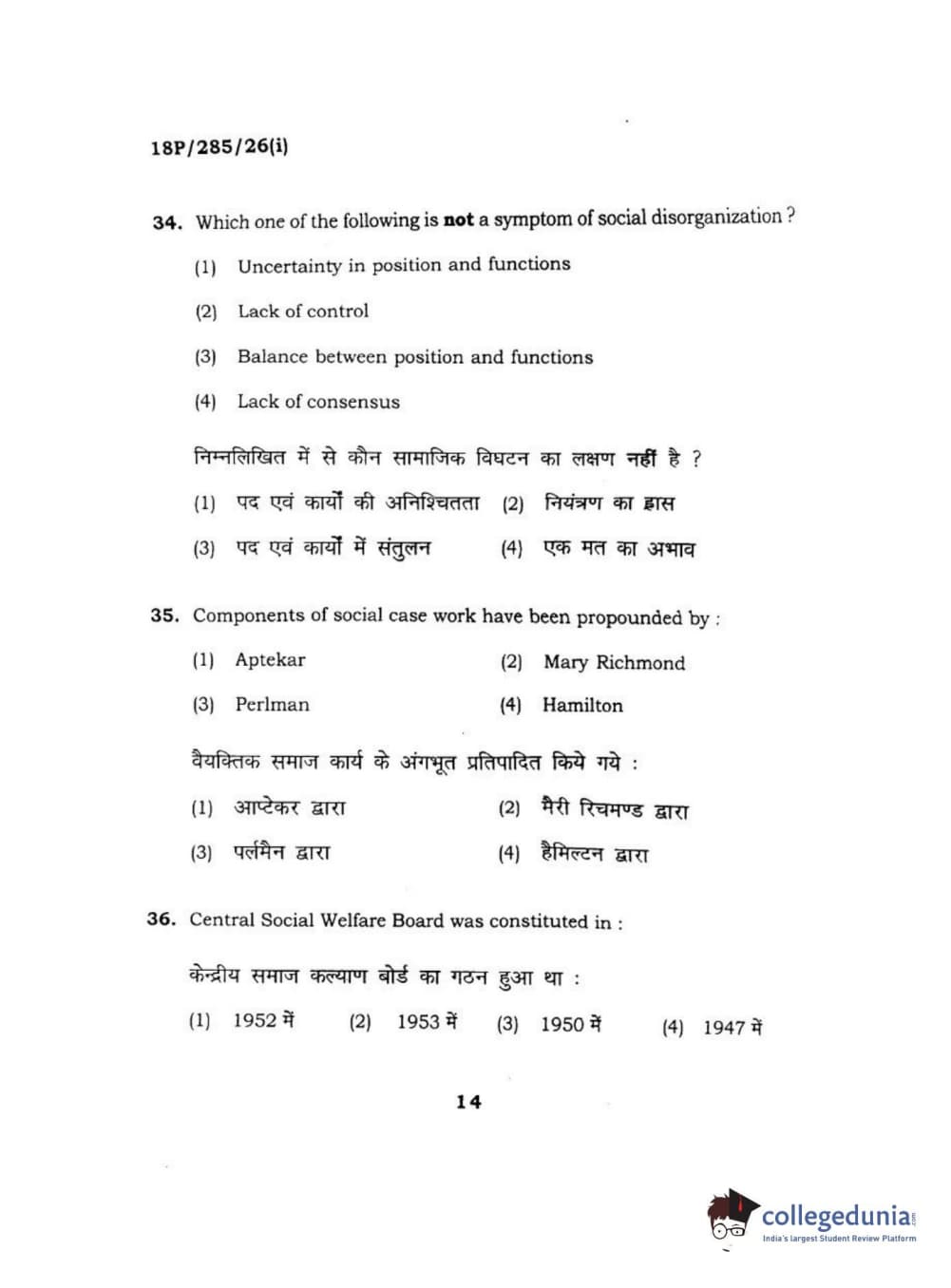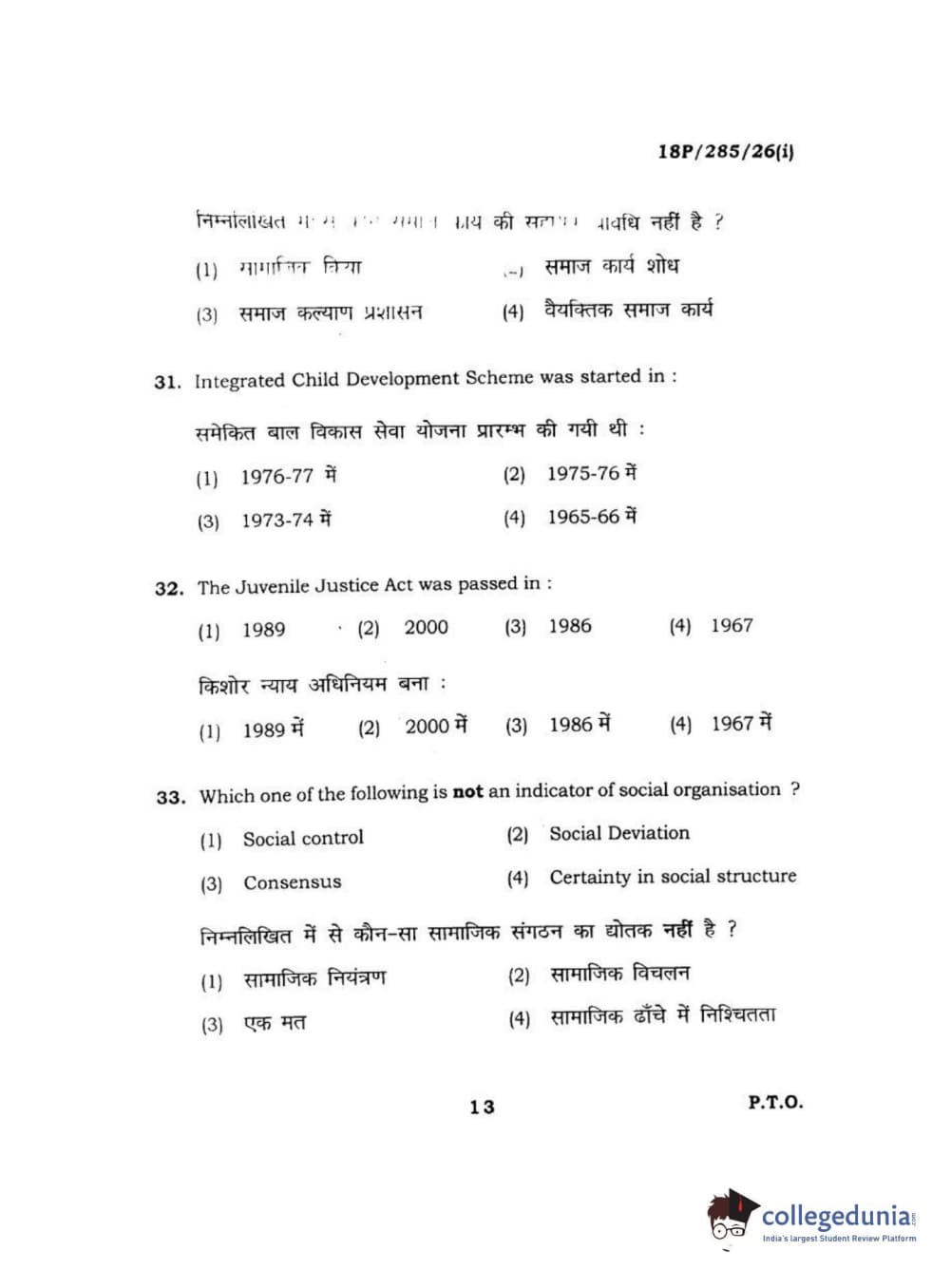 BHU PET 2018 MA IN SOCIAL WORK Question Paper with Answer Key PDF