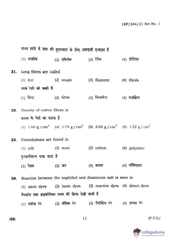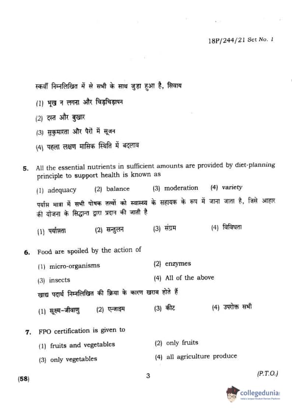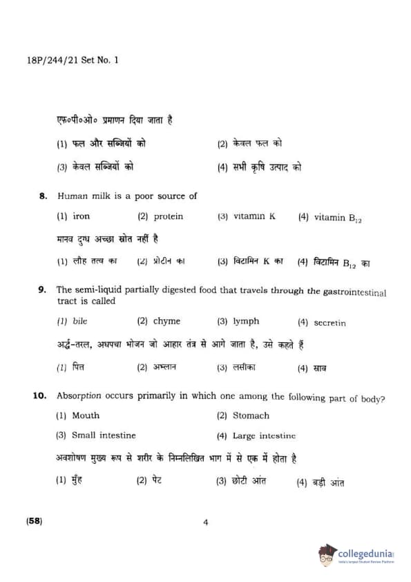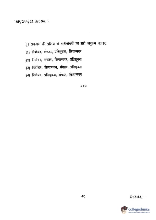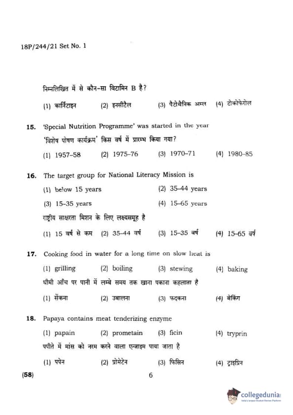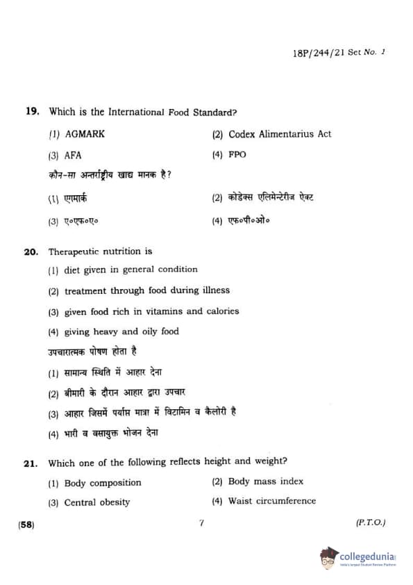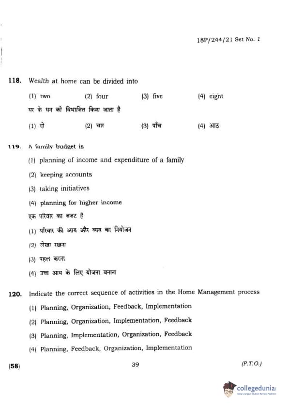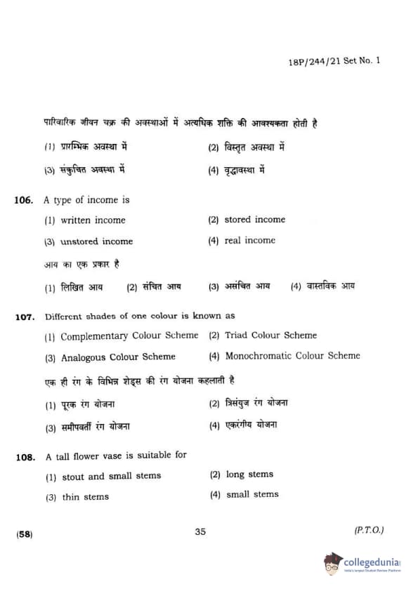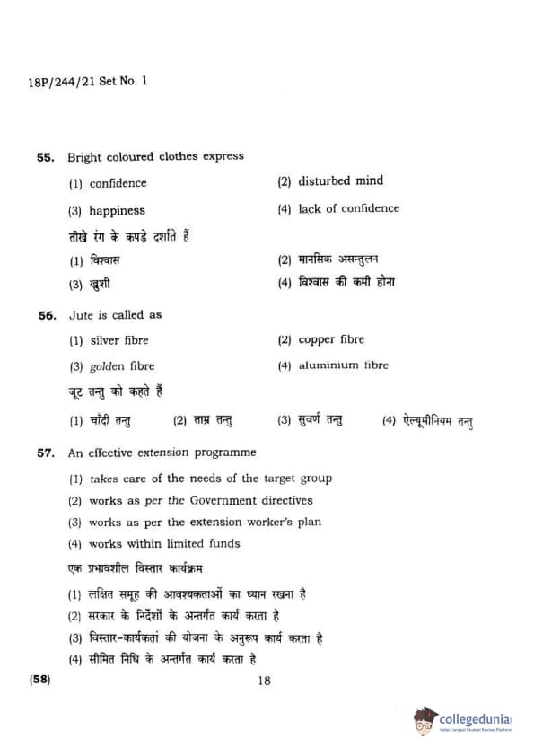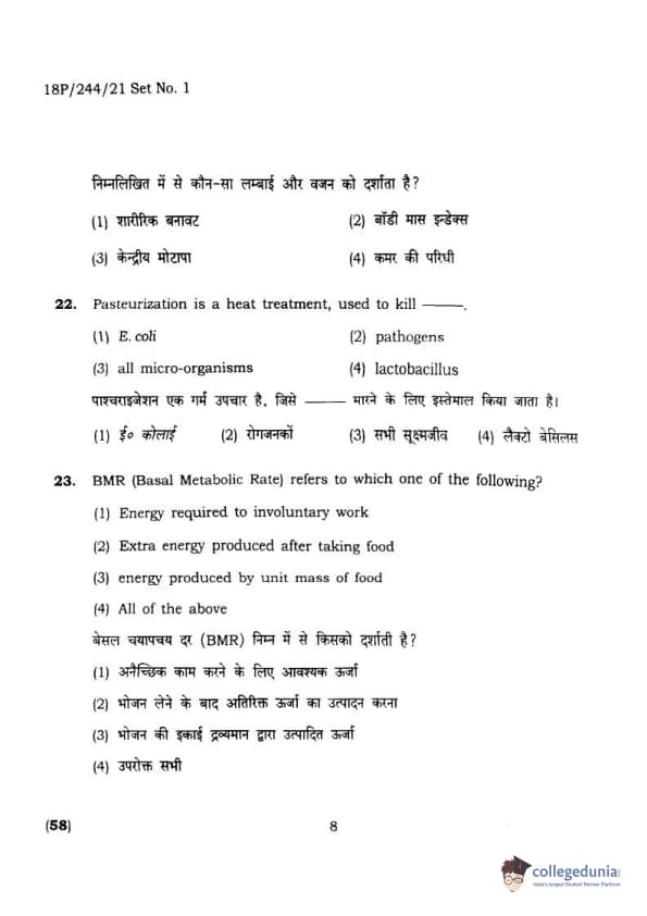 BHU PET 2018 M.A.M.SC. in Home science Question Paper with Answer Key PDFs in Hindi