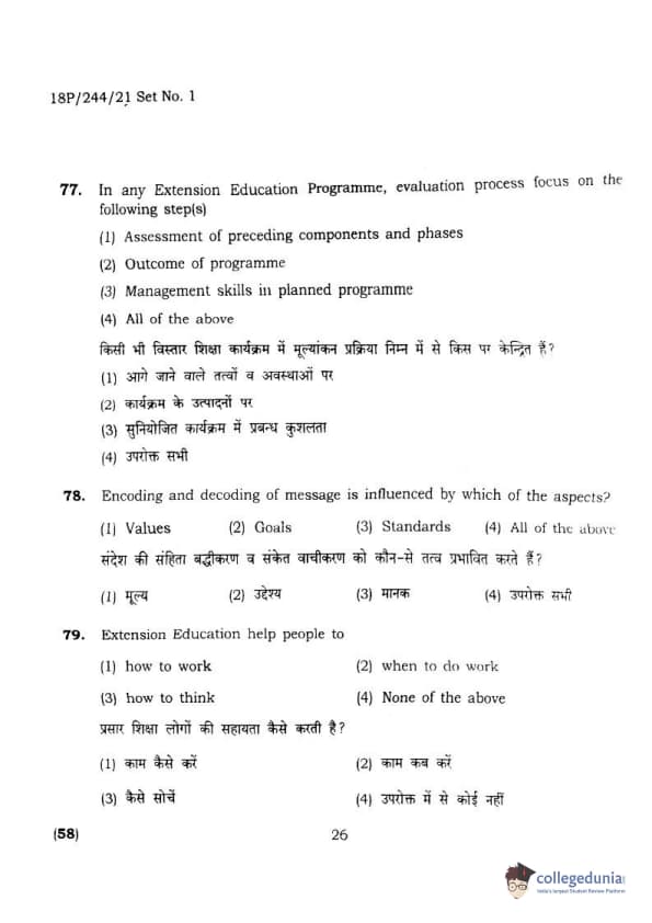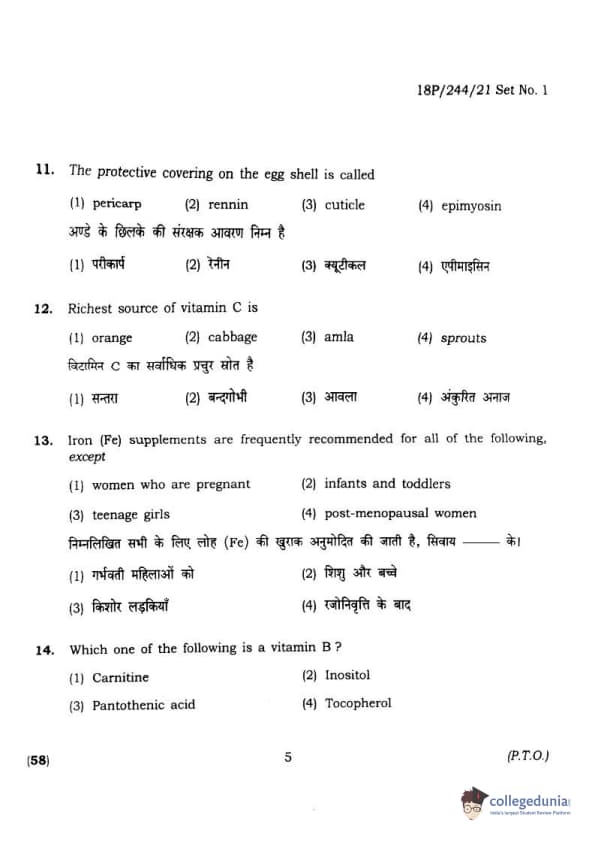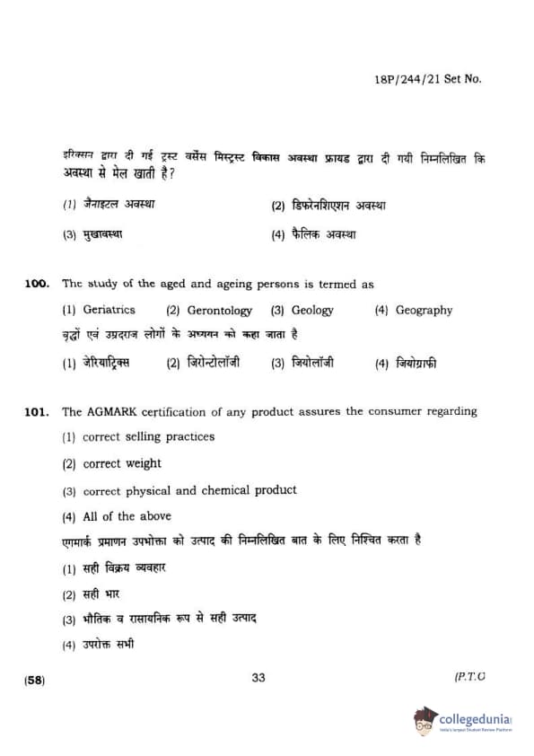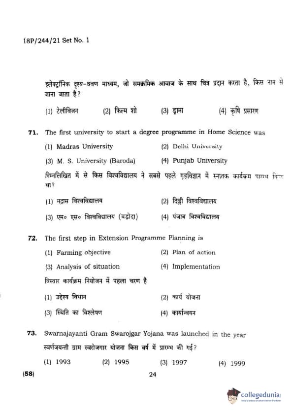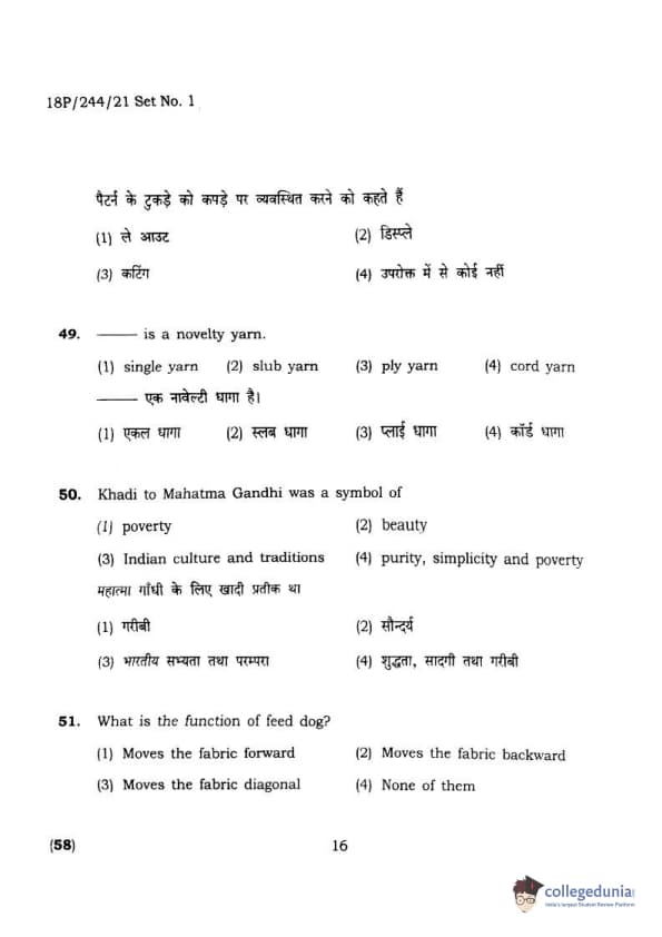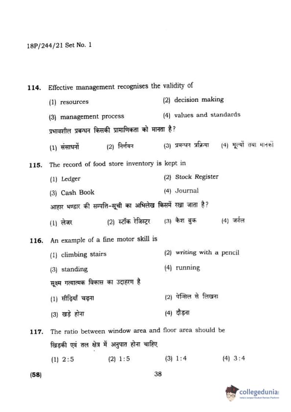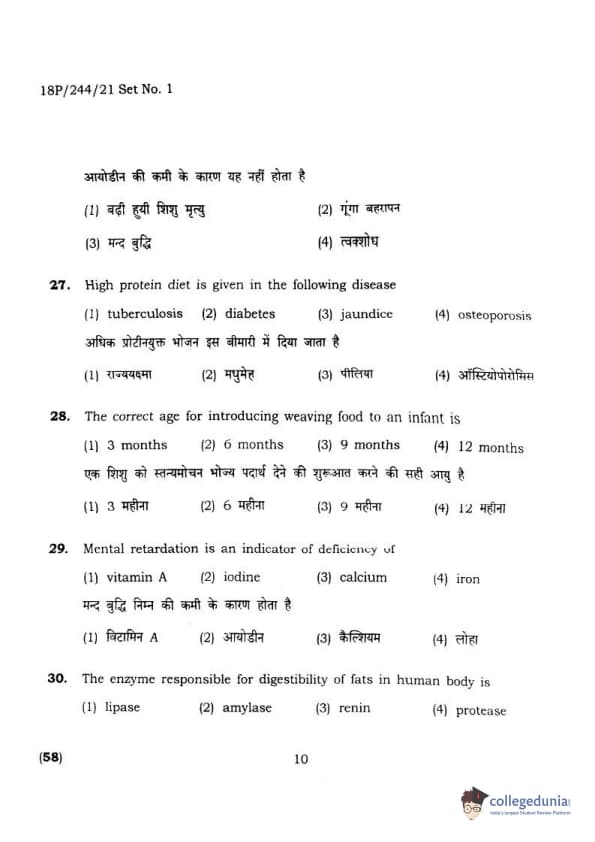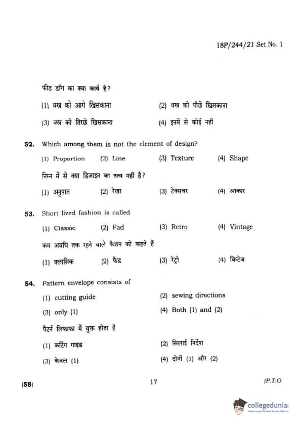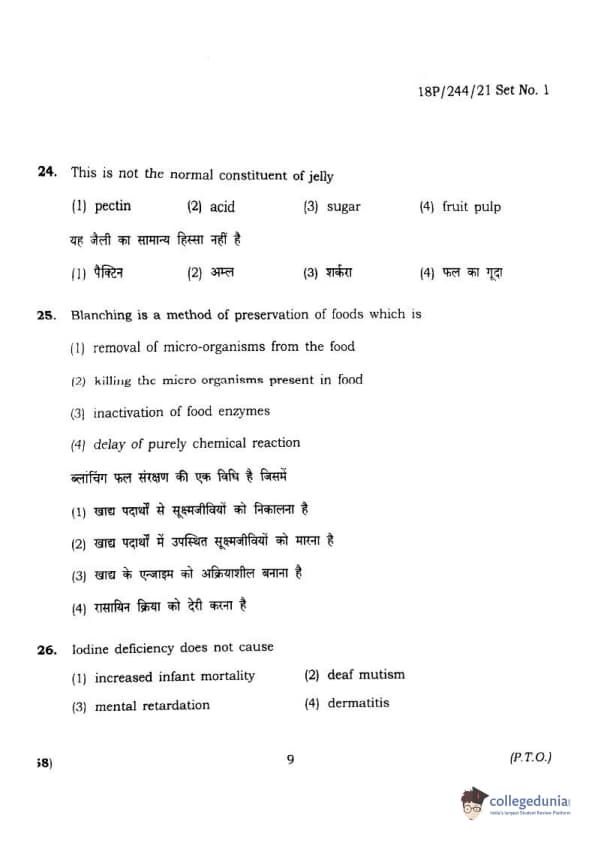 BHU PET 2018 M.A.M.SC. in Home science Question Paper with Answer Key PDFs in Hindi