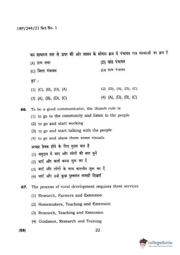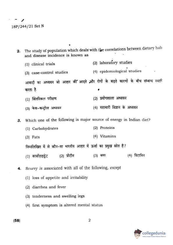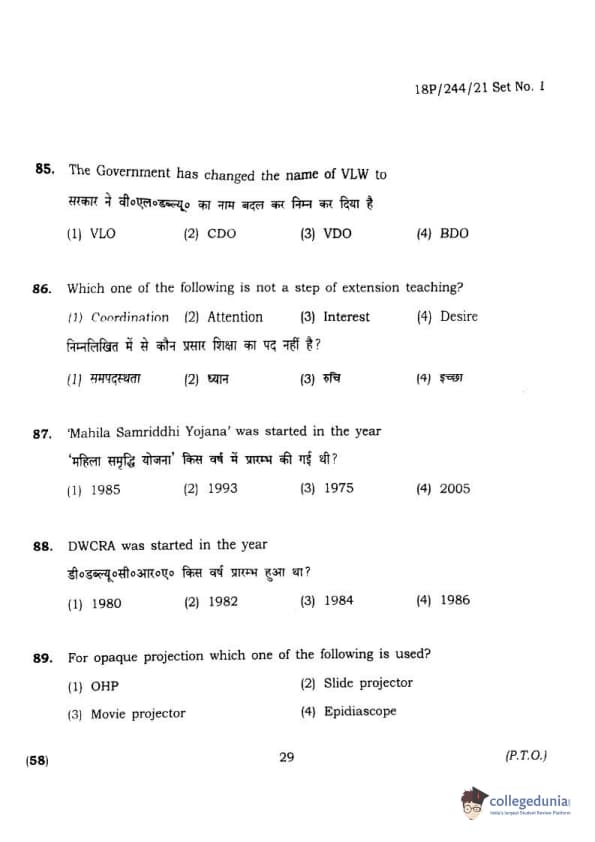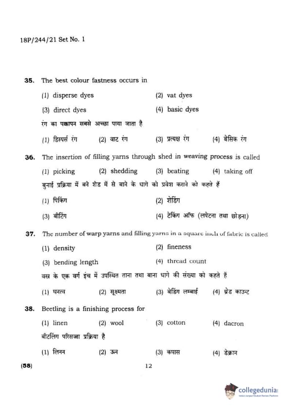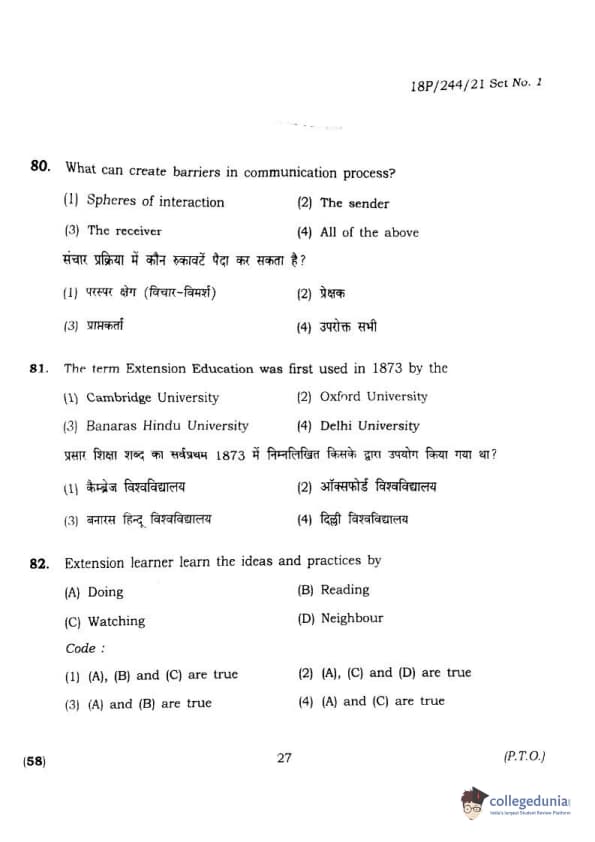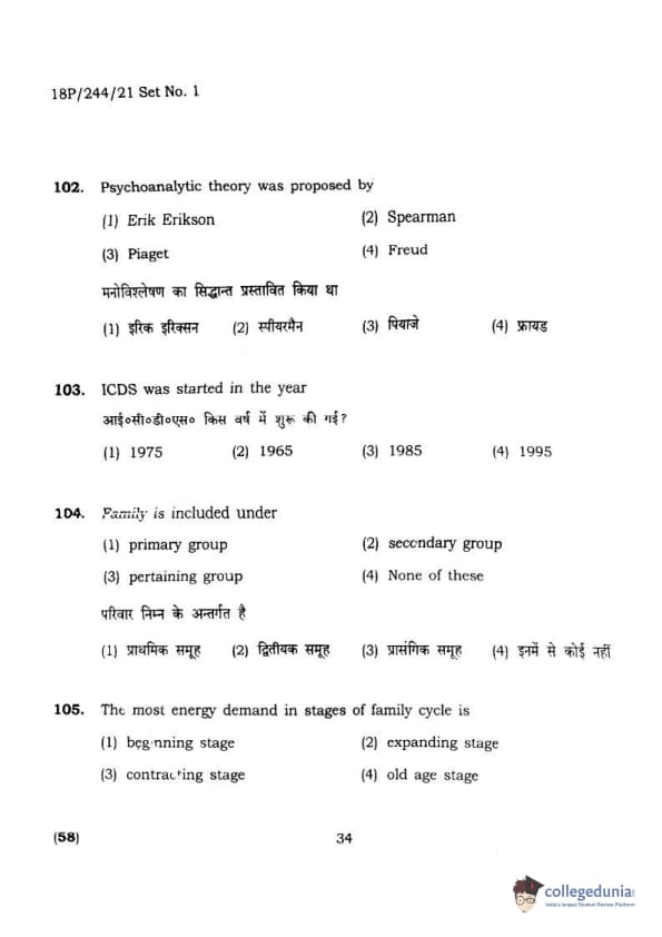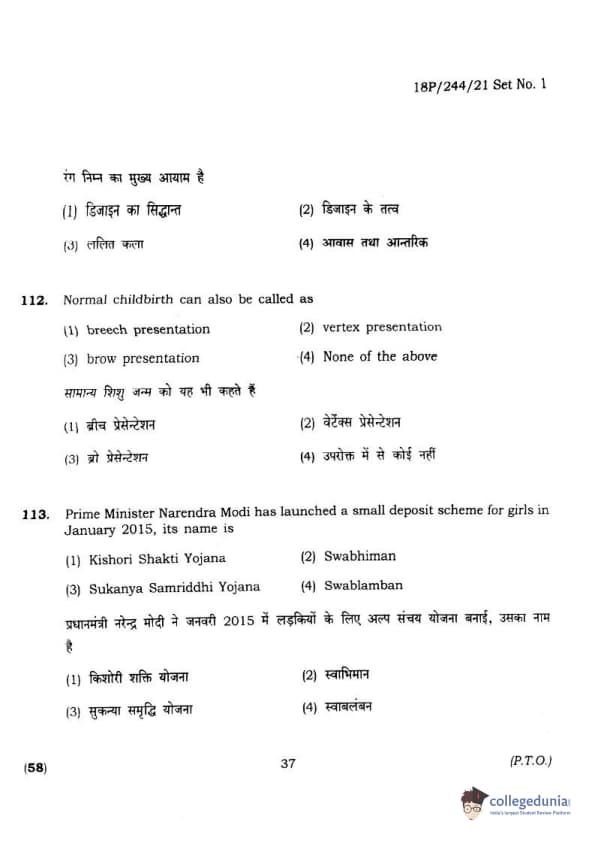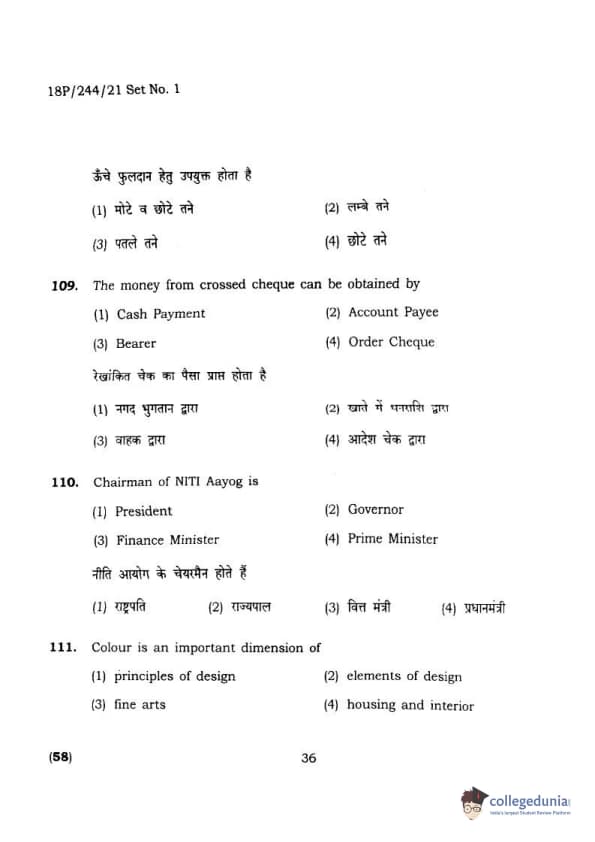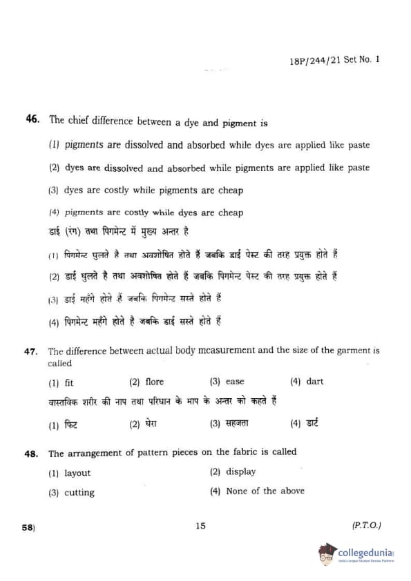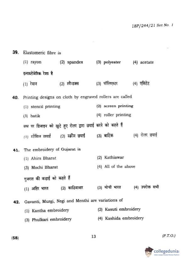 BHU PET 2018 M.A.M.SC. in Home science Question Paper with Answer Key PDFs in Hindi