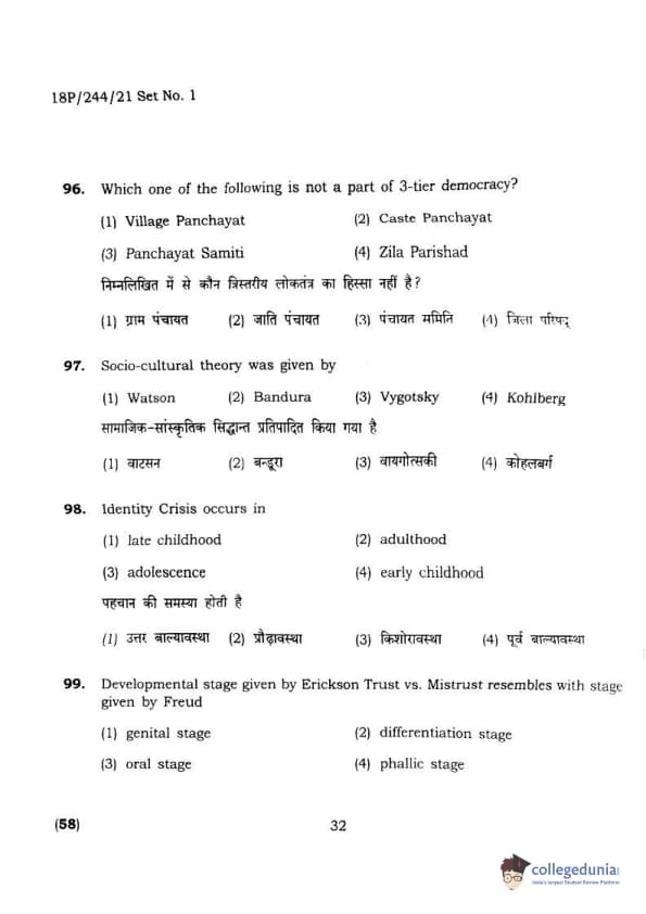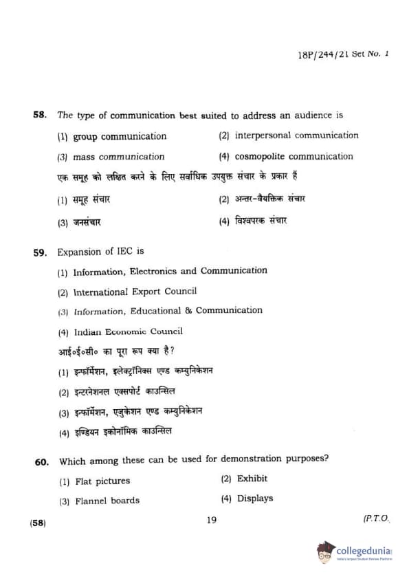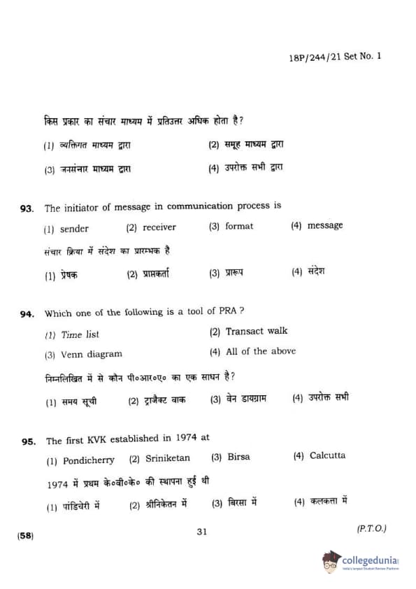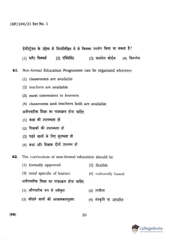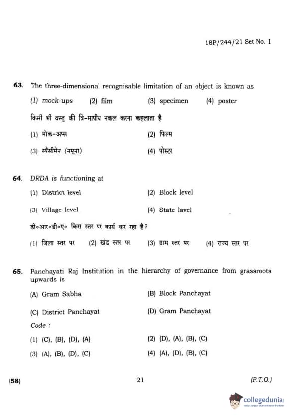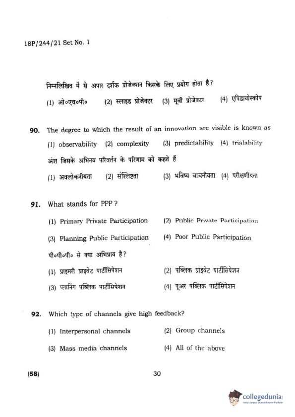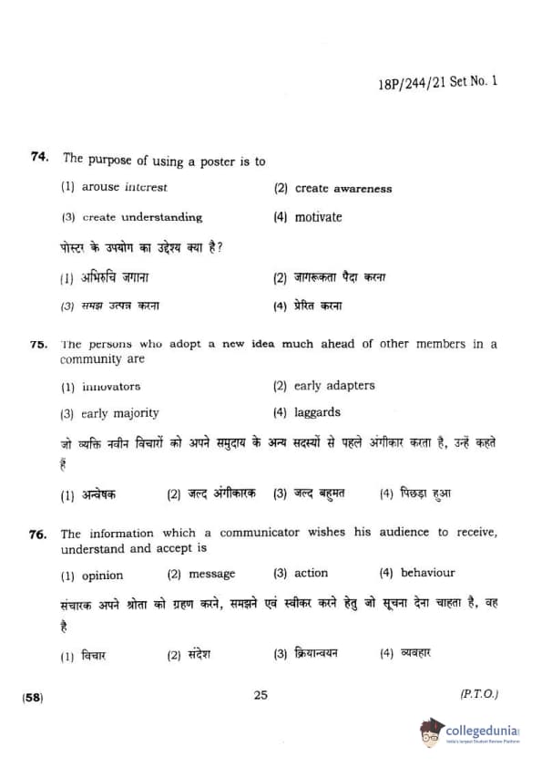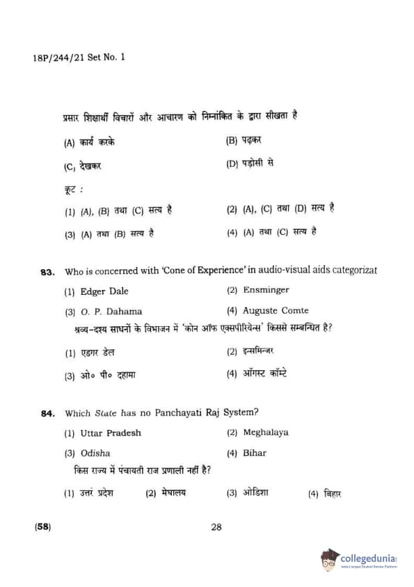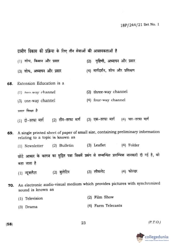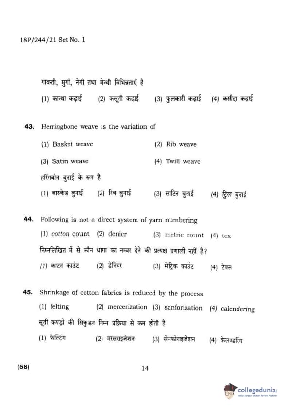 BHU PET 2018 M.A.M.SC. in Home science Question Paper with Answer Key PDFs in Hindi