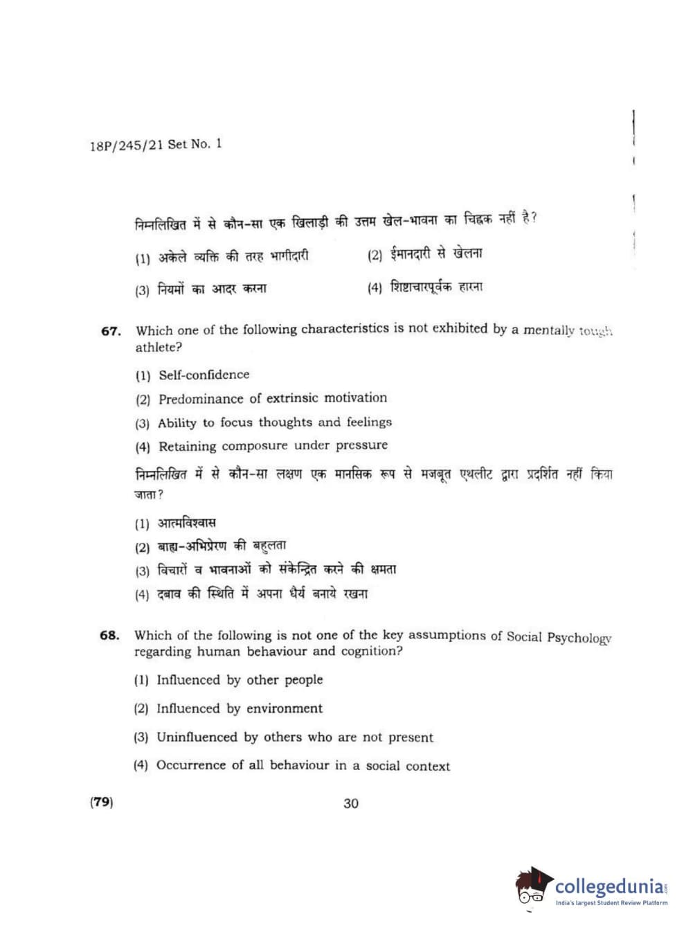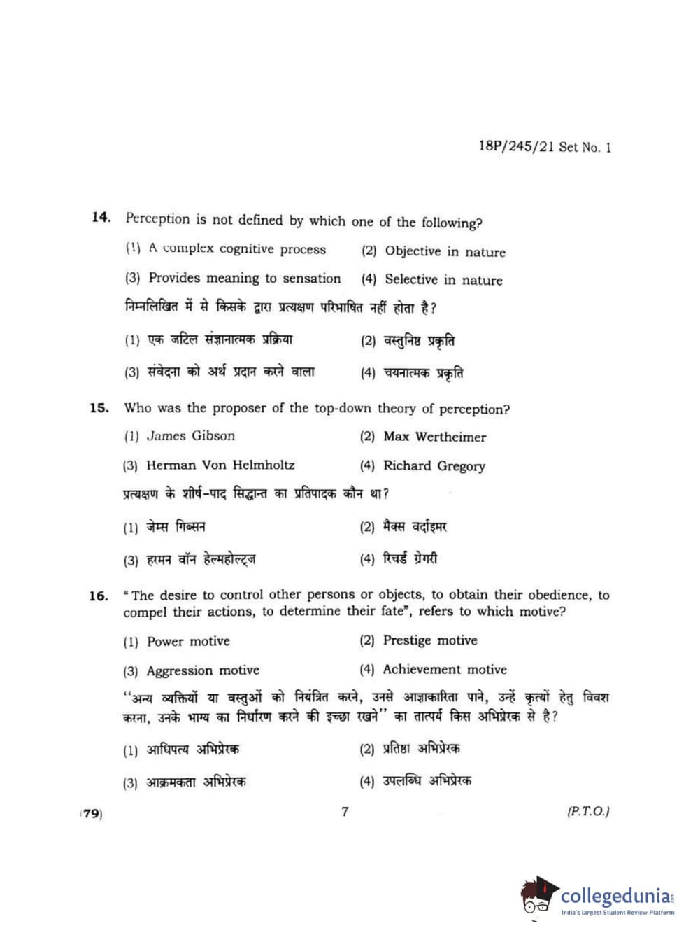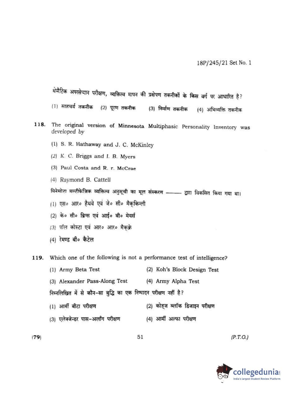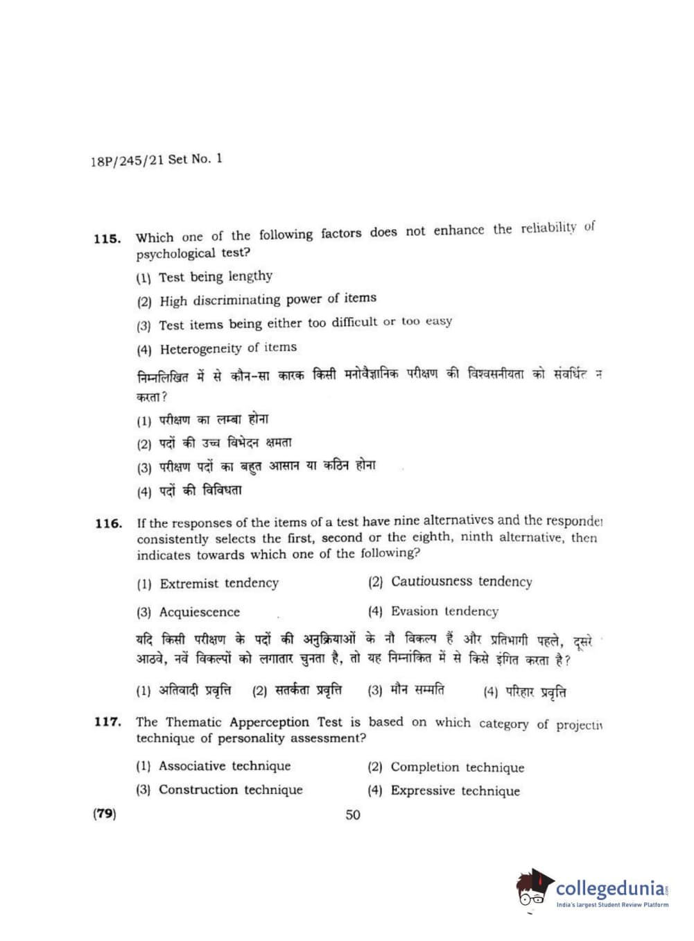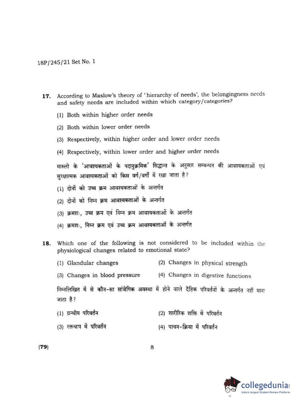 BHU PET 2018 MA M.SC. IN PSYCOLOGY Question Paper with Answer Key PDF