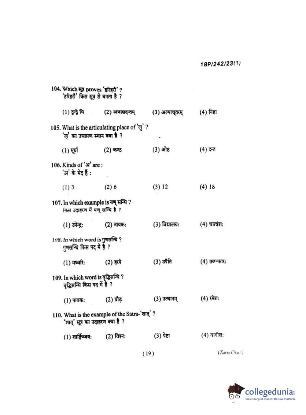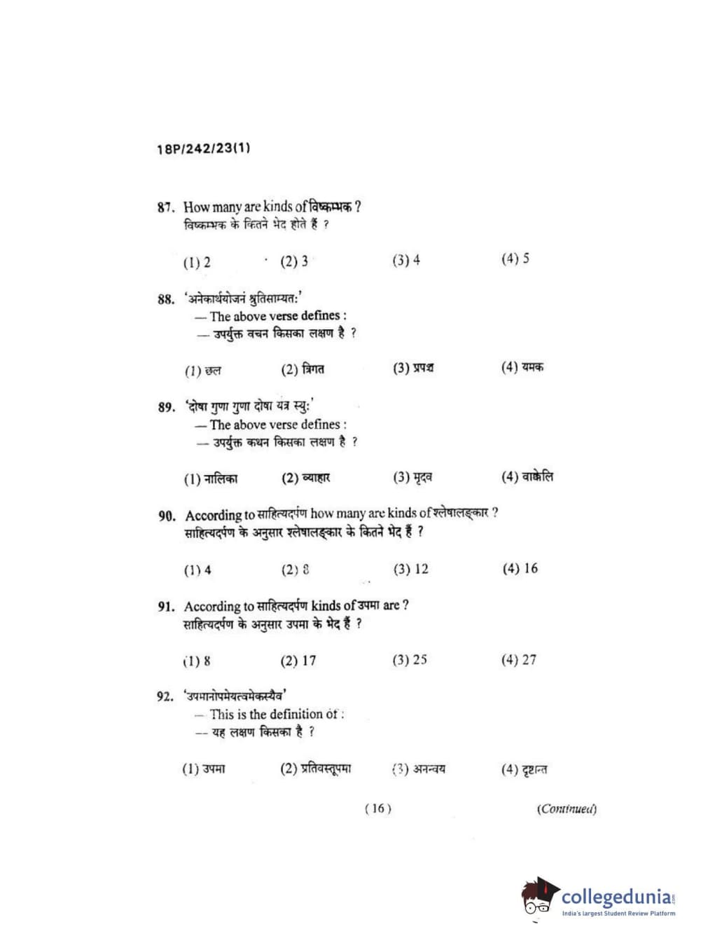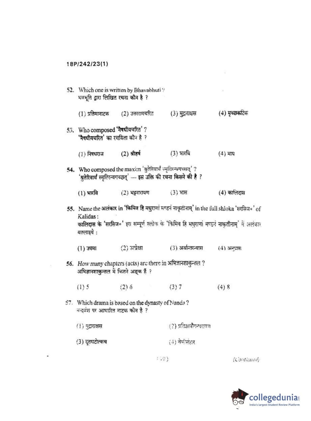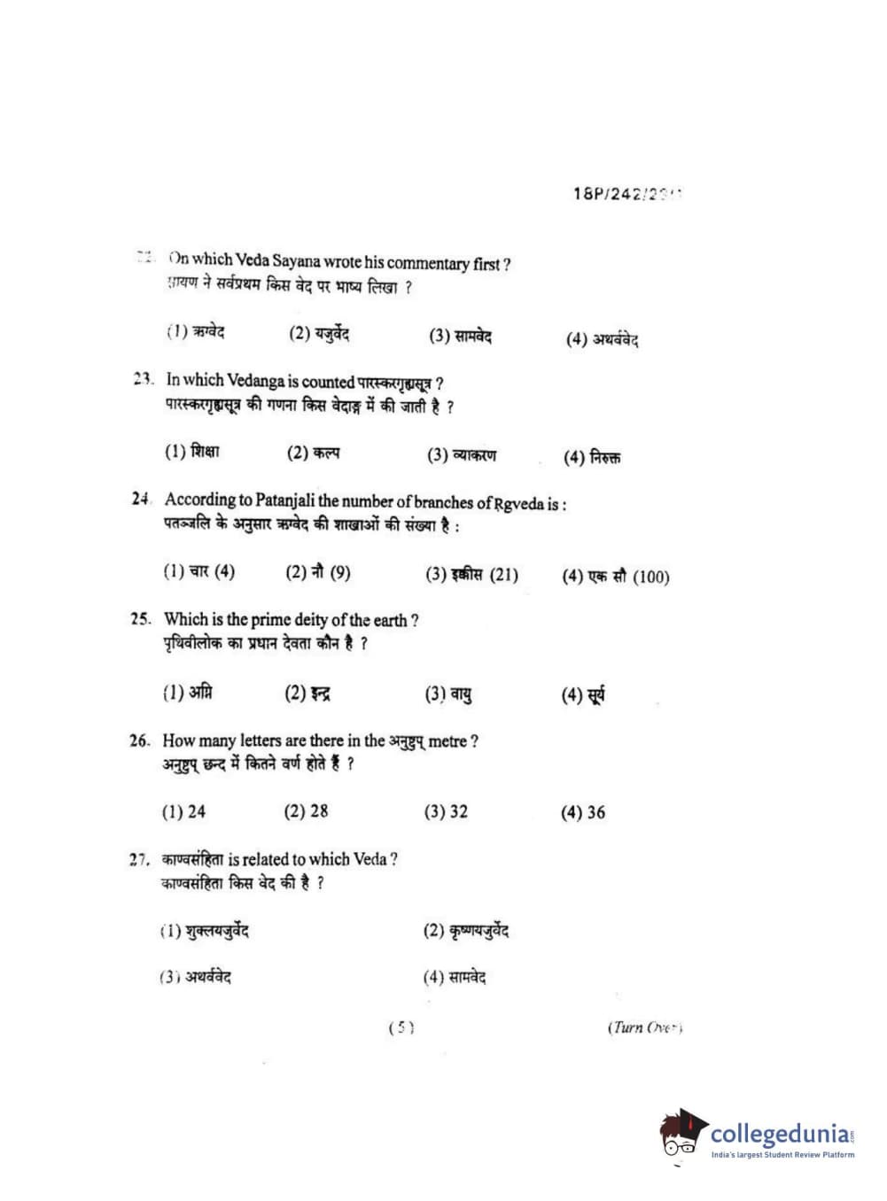 BHU PET 2018 MA SANSKRIT Question Paper with Answer Key PDF
