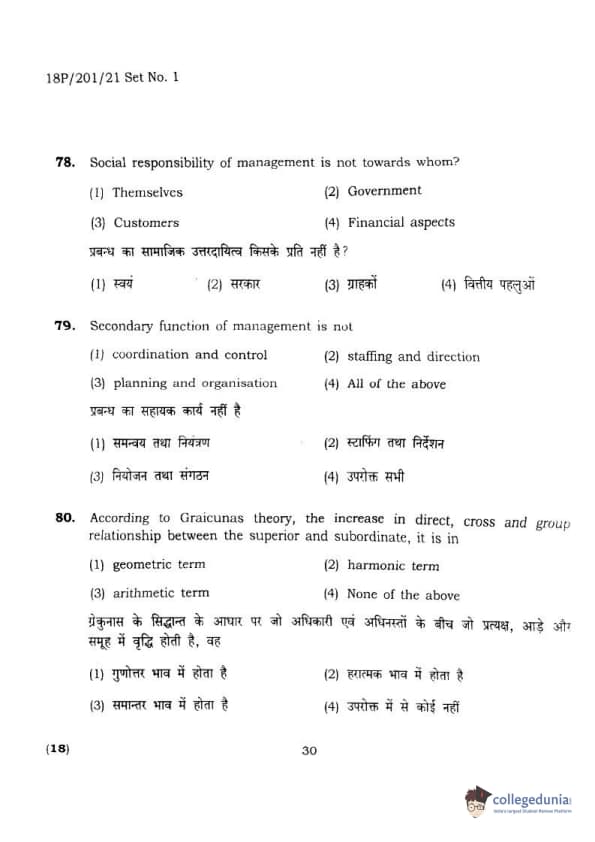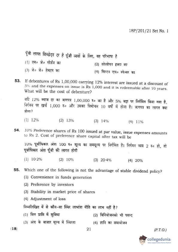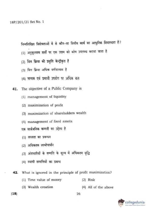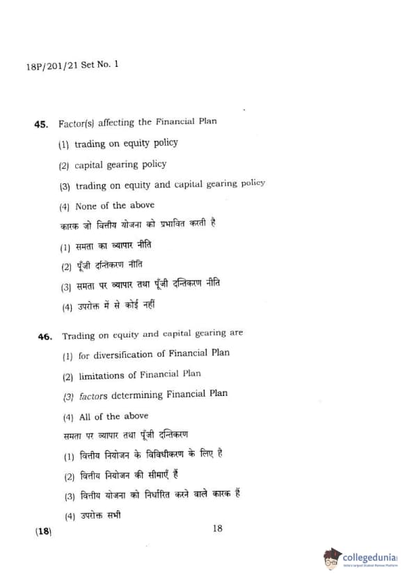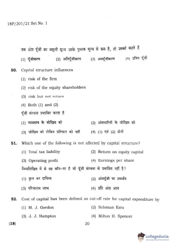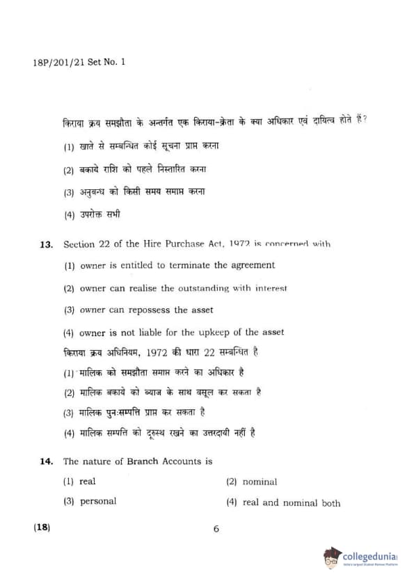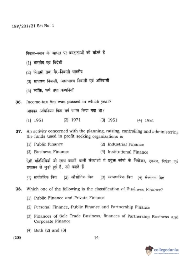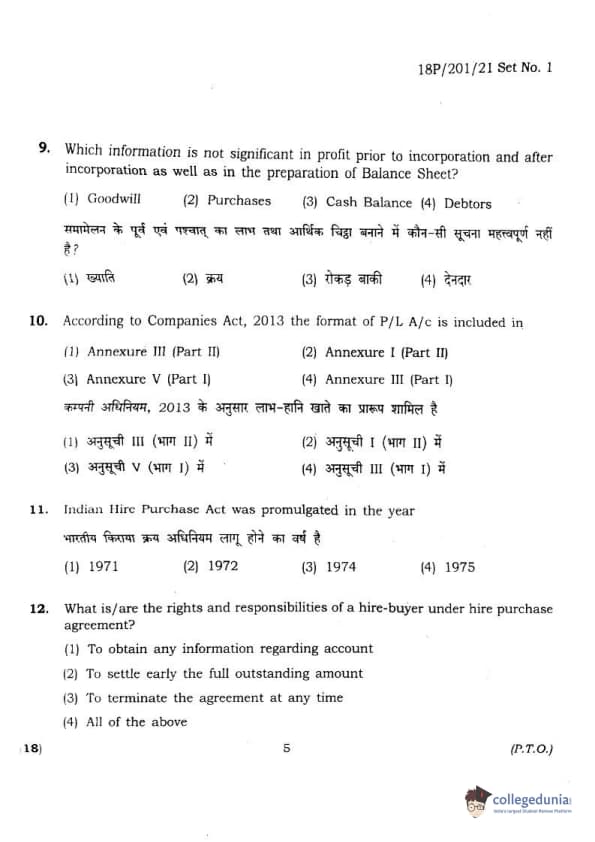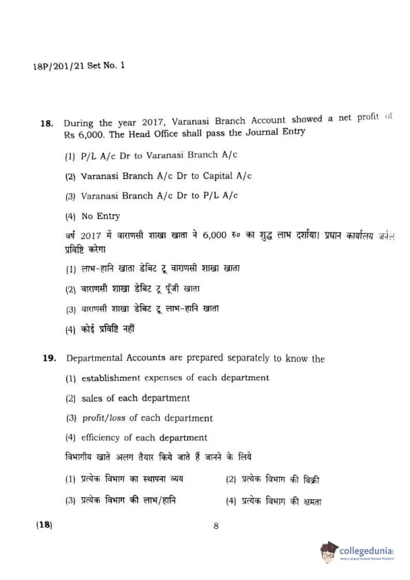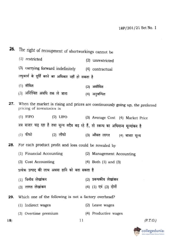 BHU PET 2018 M.COM Question Paper with Answer Key PDFs in Hindi