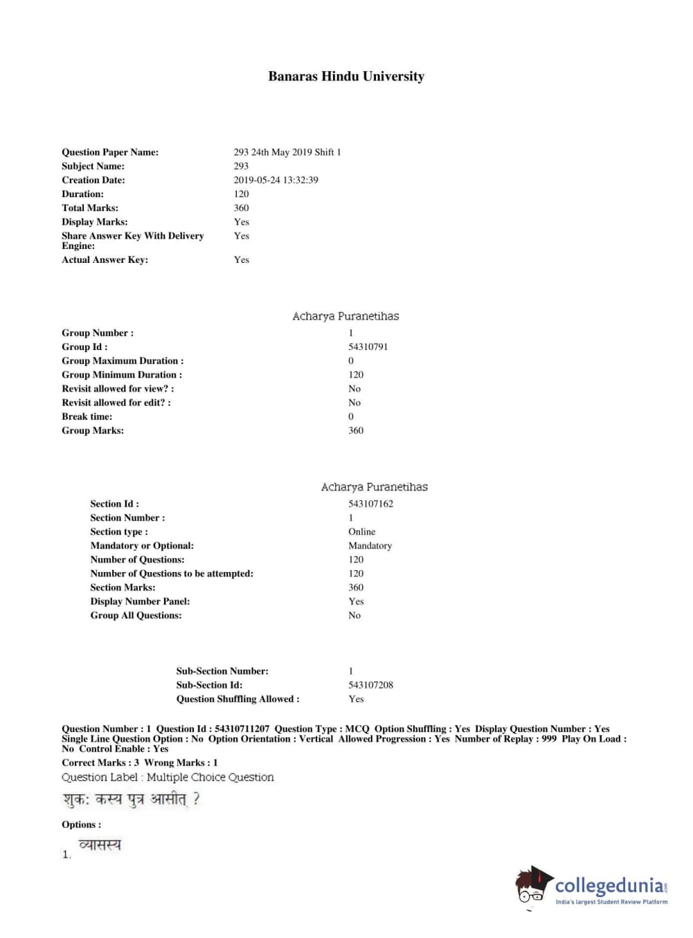 BHU PET 2019 ACHARYA PURANETIHAS Question paper with answer key pdf conducted on May 24, 2019 in Shift 1 is available for download. The exam was successfully organized by Banaras Hindu University (BHU). The question paper comprised a total of 120 questions.