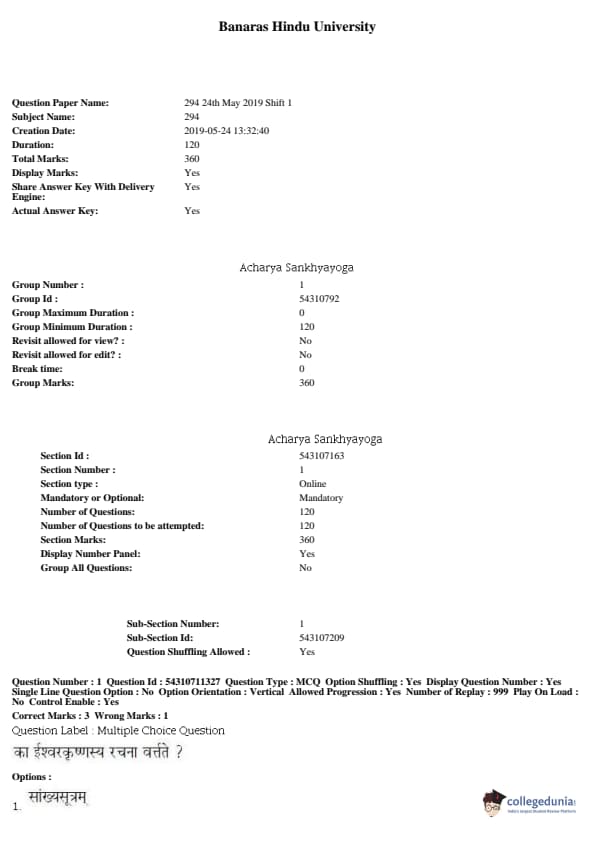BHU PET 2019 ACHARYA SANKHAYOGA Question paper with answer key pdf conducted on May 24, 2019 in Shift 1 is available for download. The exam was successfully organized by Banaras Hindu University (BHU). The question paper comprised a total of 120 questions.