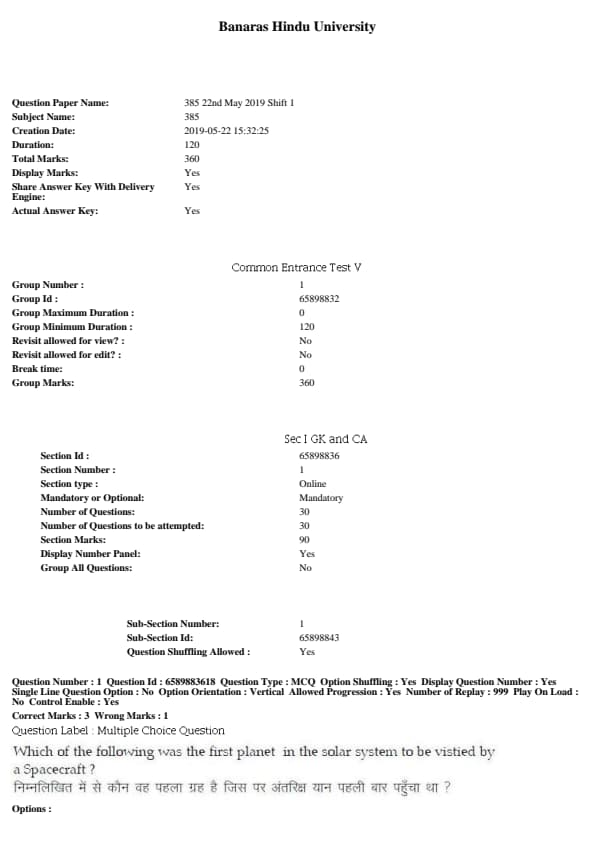 BHU PET 2019 COMMON ENTRANCE TEST 5 Question Paper with Answer Key PDFs, Shift 1